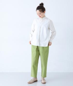 ほどよい厚みとハリ感のある軽やかなコットンツイル生地。ポリウレタンを混紡してストレッチ性をプラスしました。しっとりとした微起毛の表面感が心地よく、見た目にも品のよいムードを運びます。