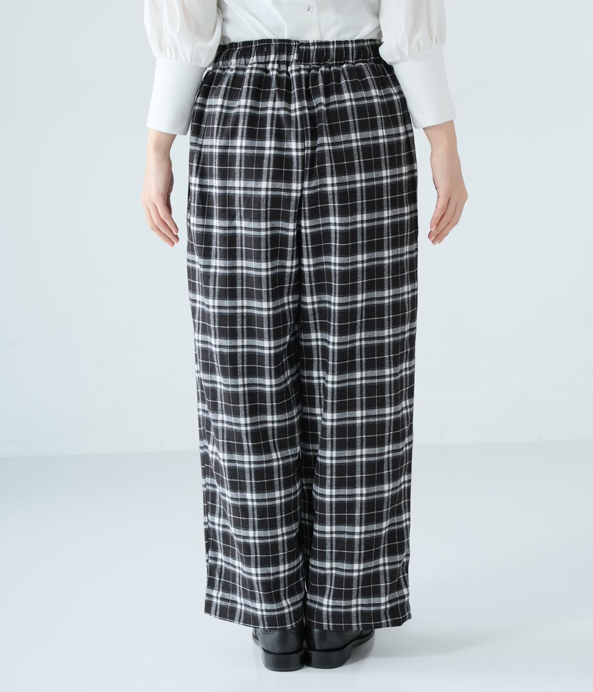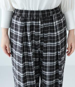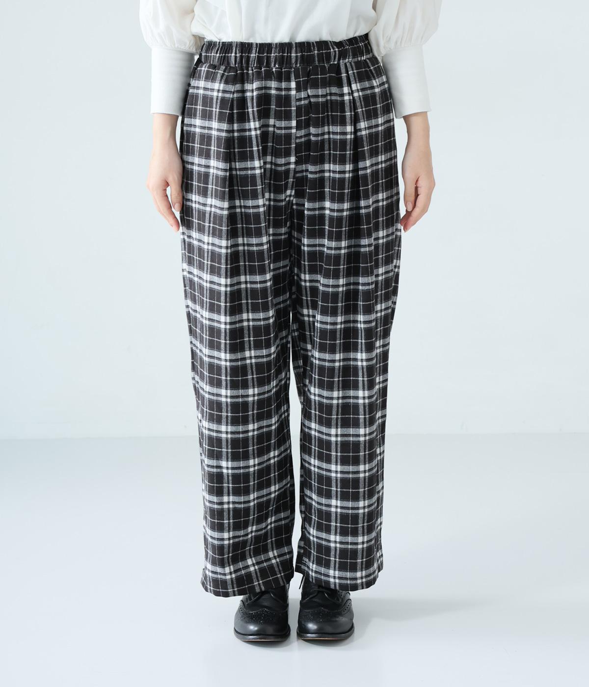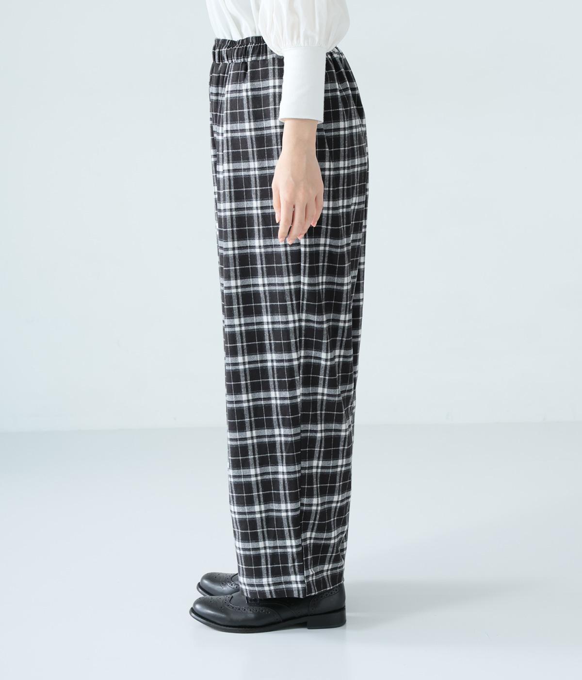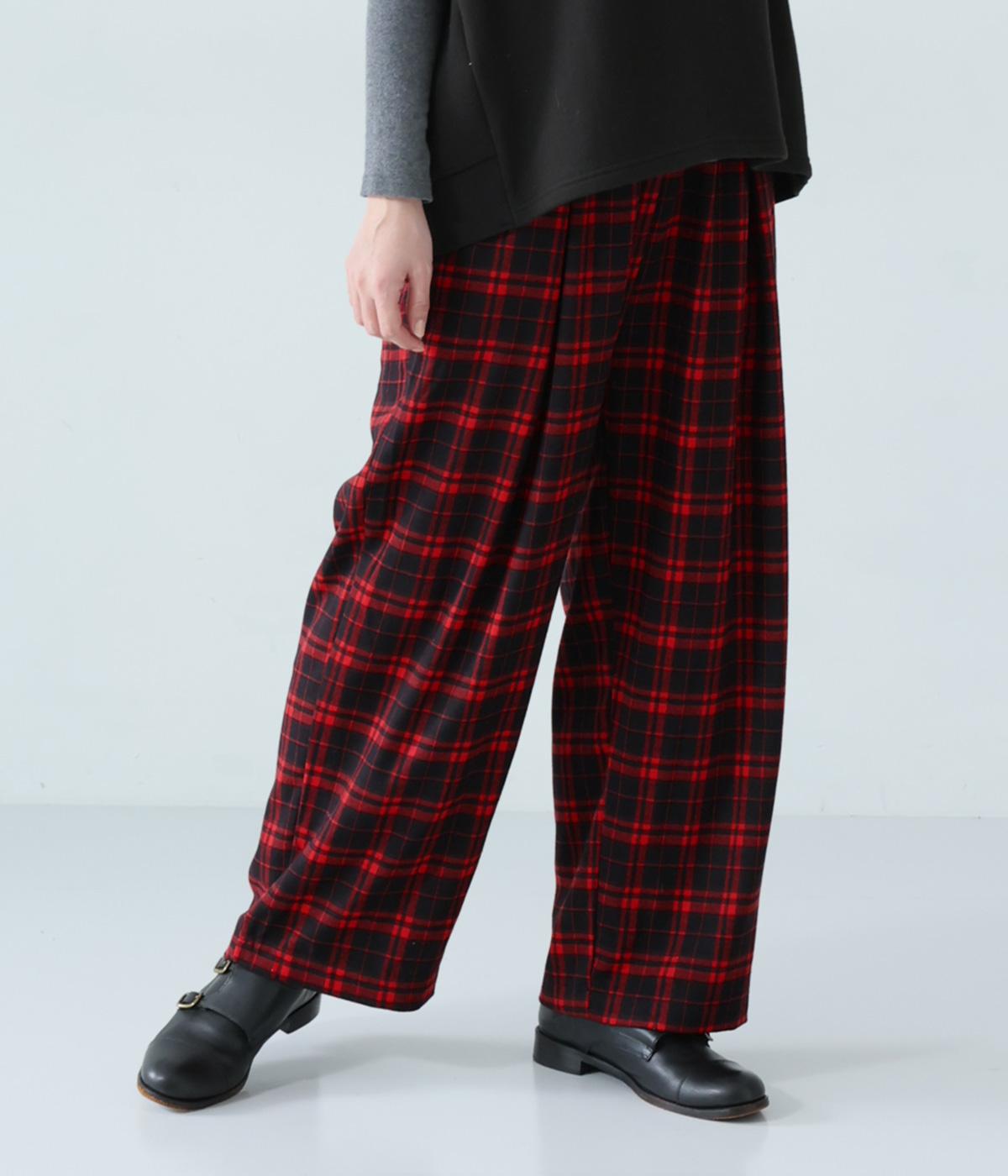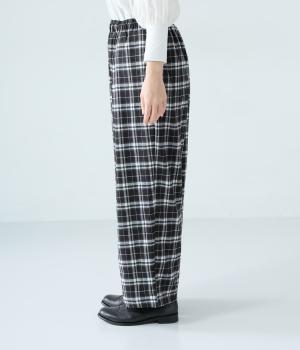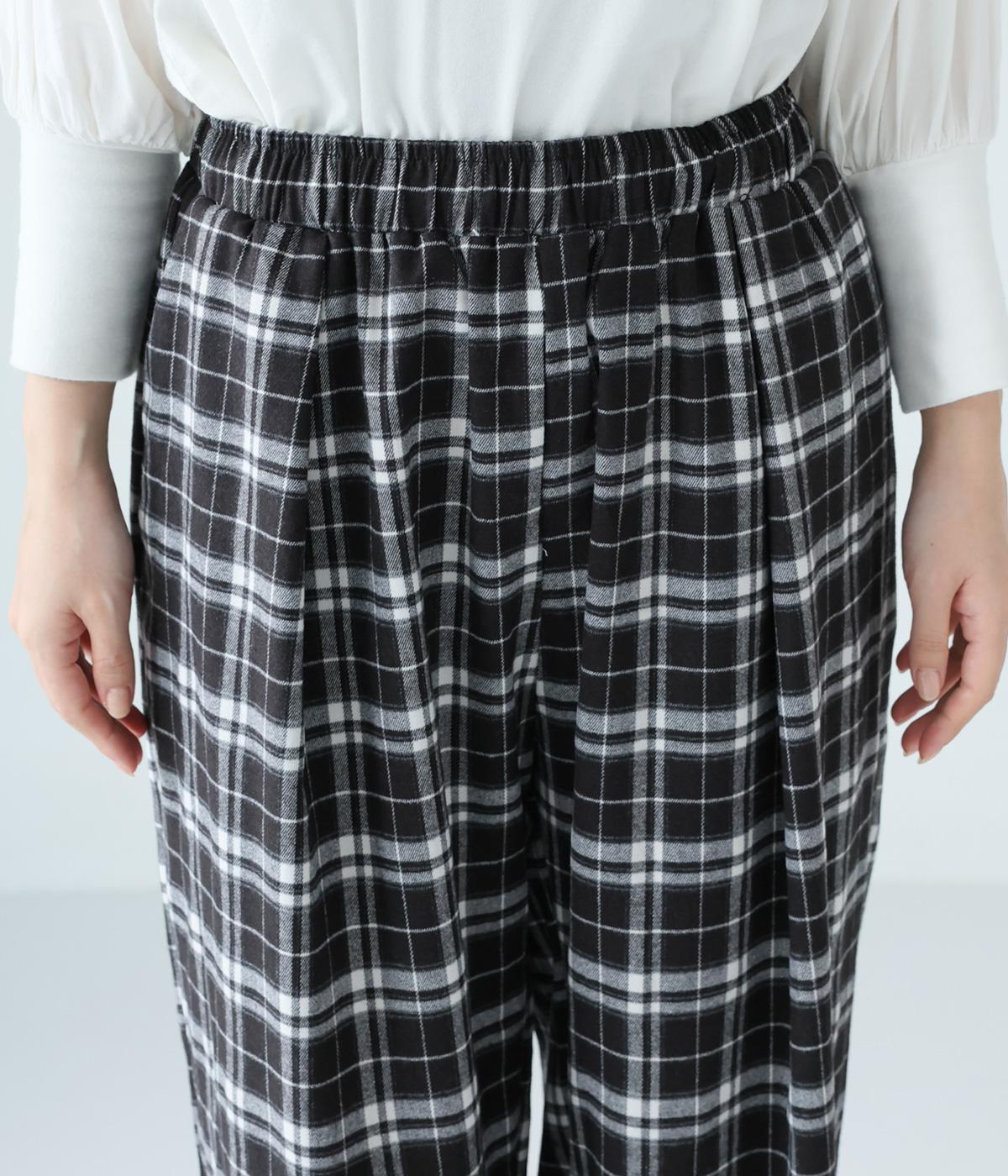 コーディネートの主役になるチェック柄パンツ。前ウエストにタックを入れて腰まわりにゆとりを持たせたワイドストレートシルエットです。両サイドに実用性の高いポケットつき。総ゴム仕様のウエストにはフィット感を調整できる内紐をプラスしました。