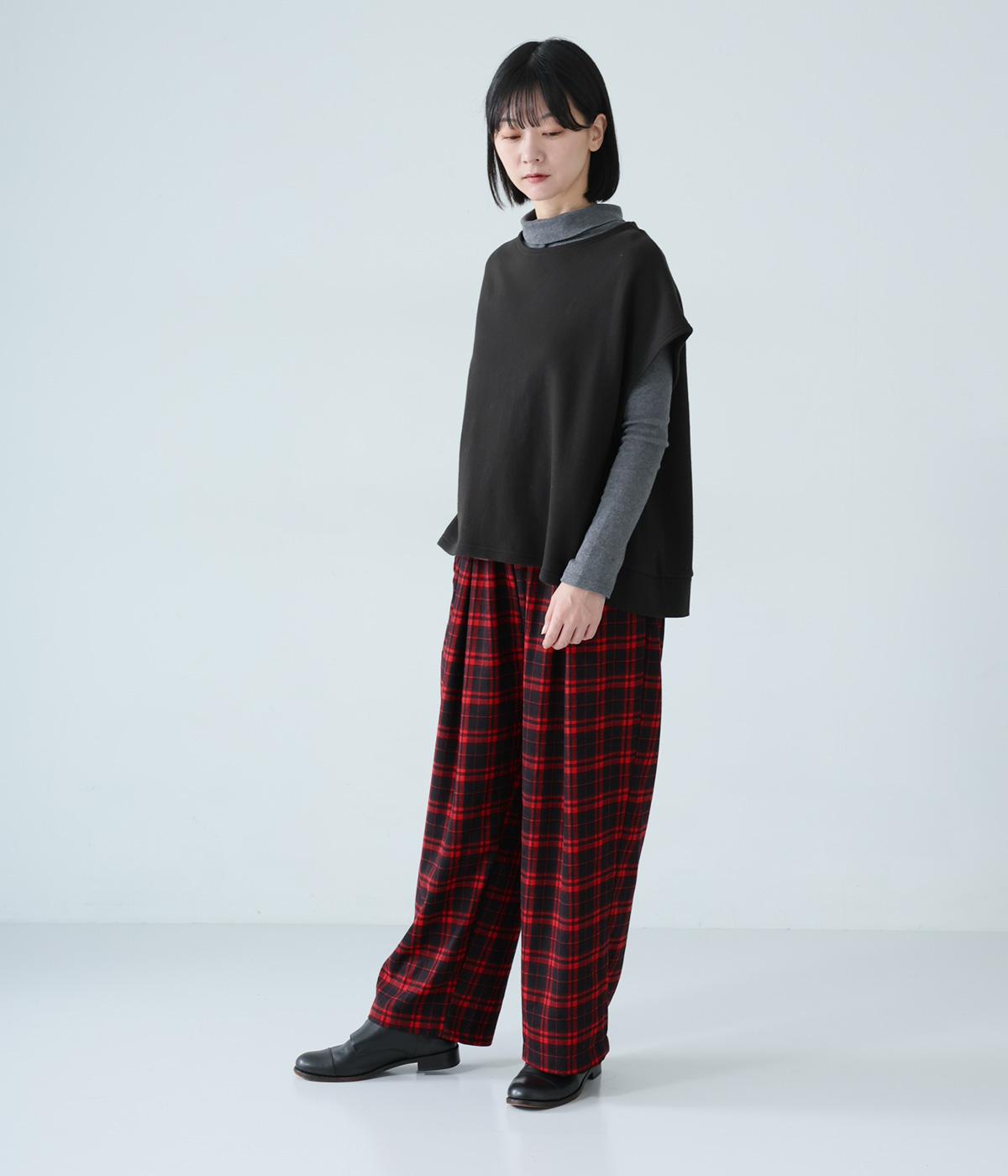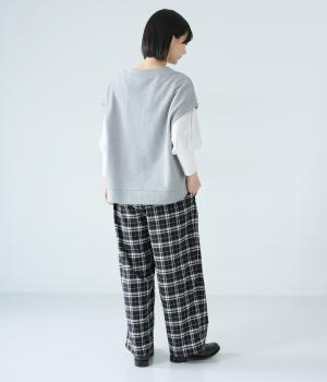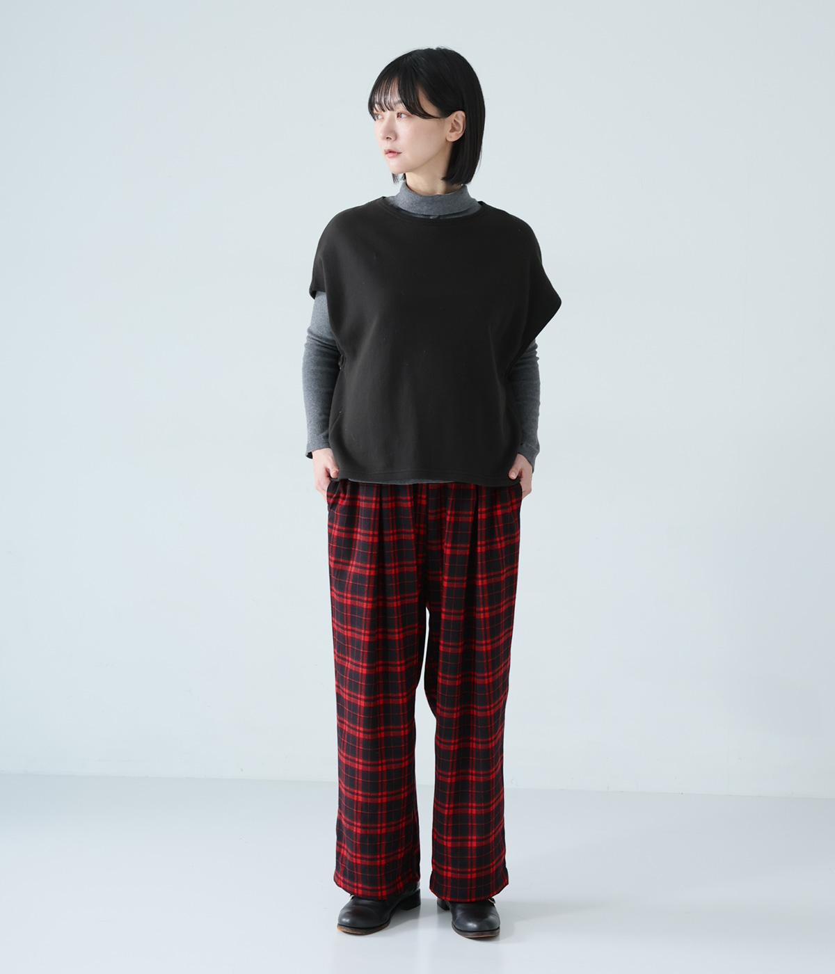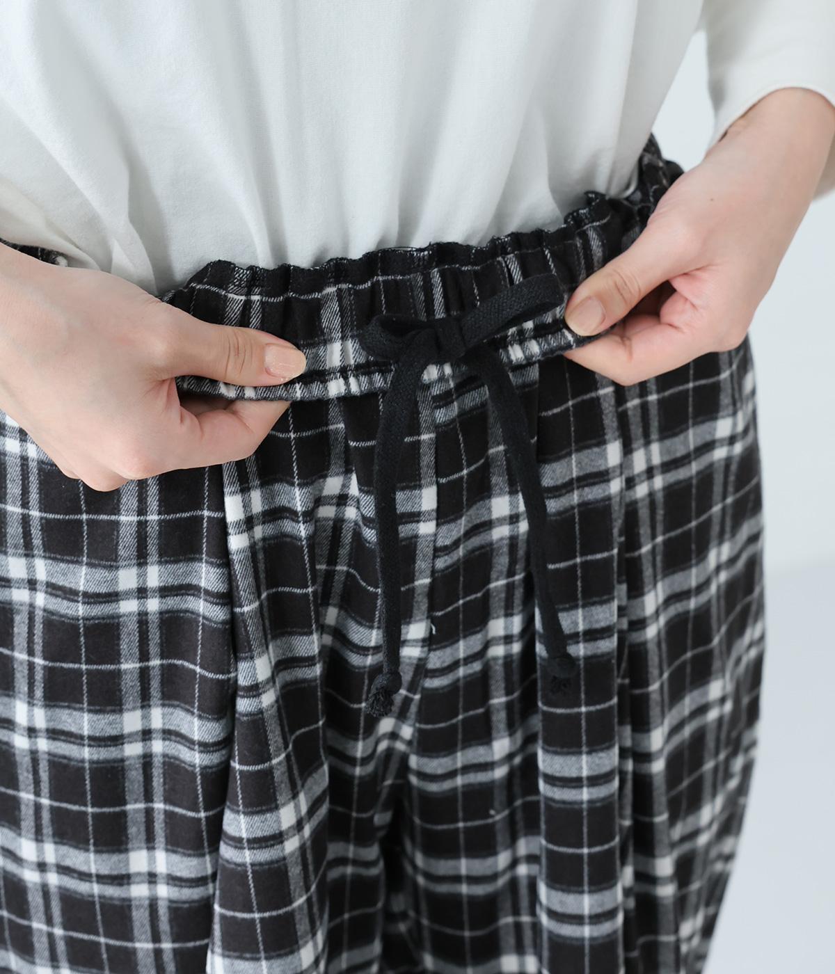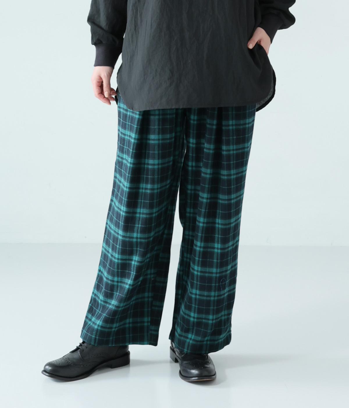コーディネートの主役になるチェック柄パンツ。前ウエストにタックを入れて腰まわりにゆとりを持たせたワイドストレートシルエットです。両サイドに実用性の高いポケットつき。総ゴム仕様のウエストにはフィット感を調整できる内紐をプラスしました。