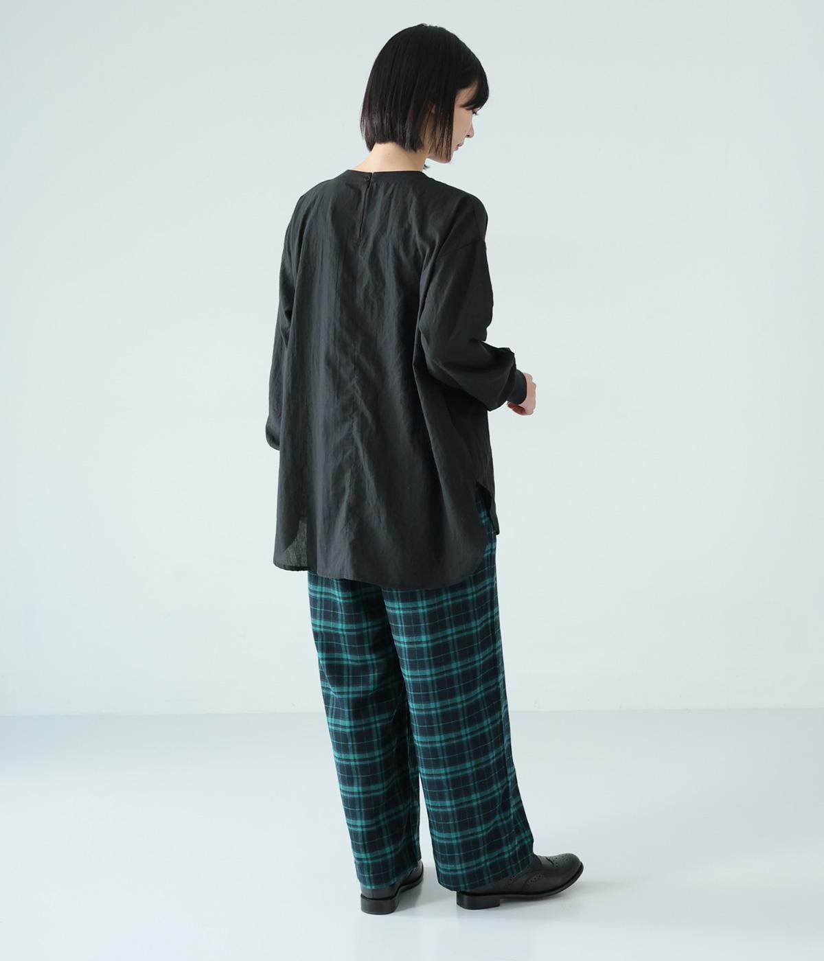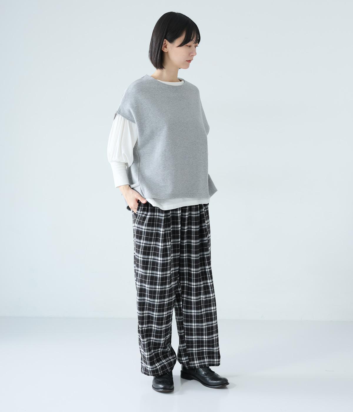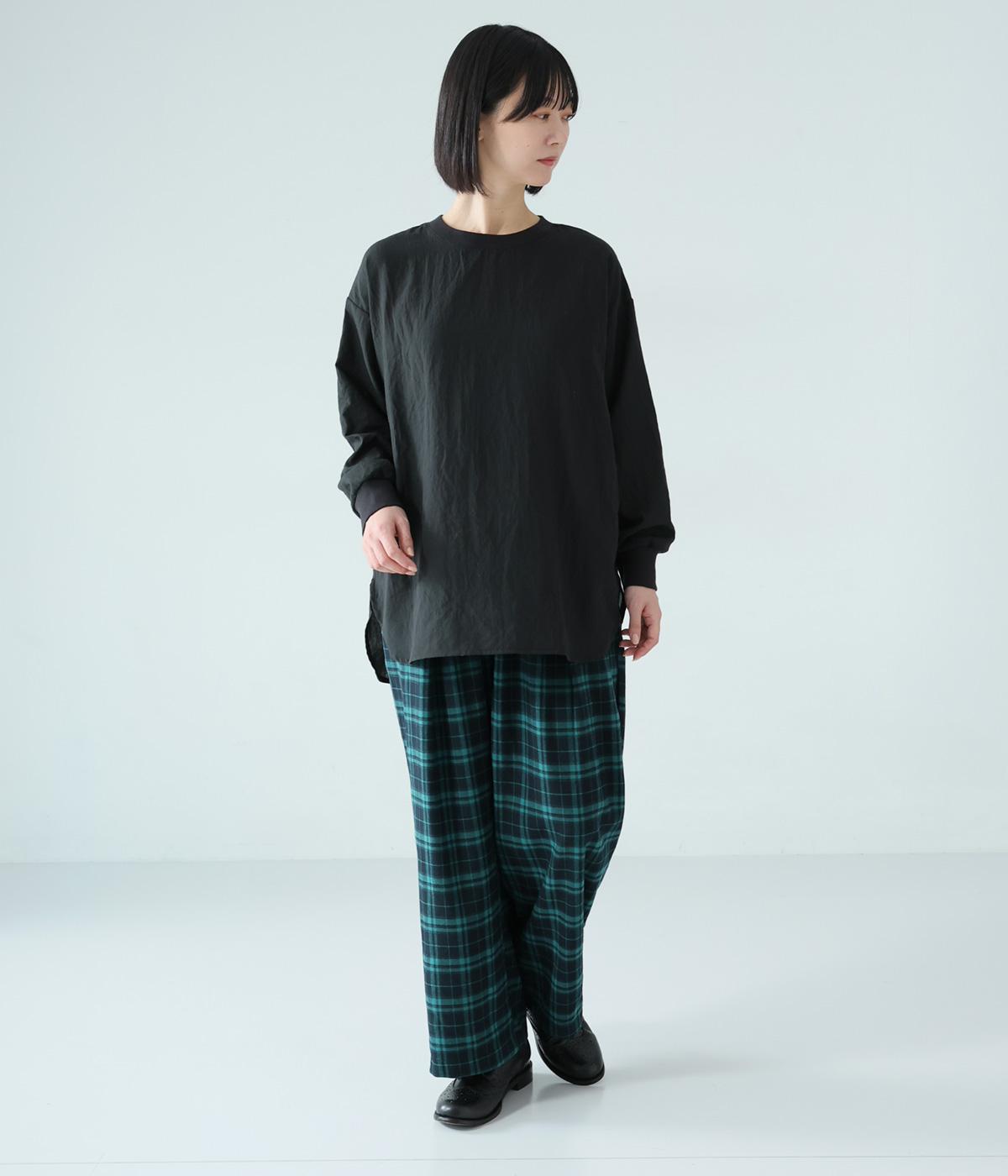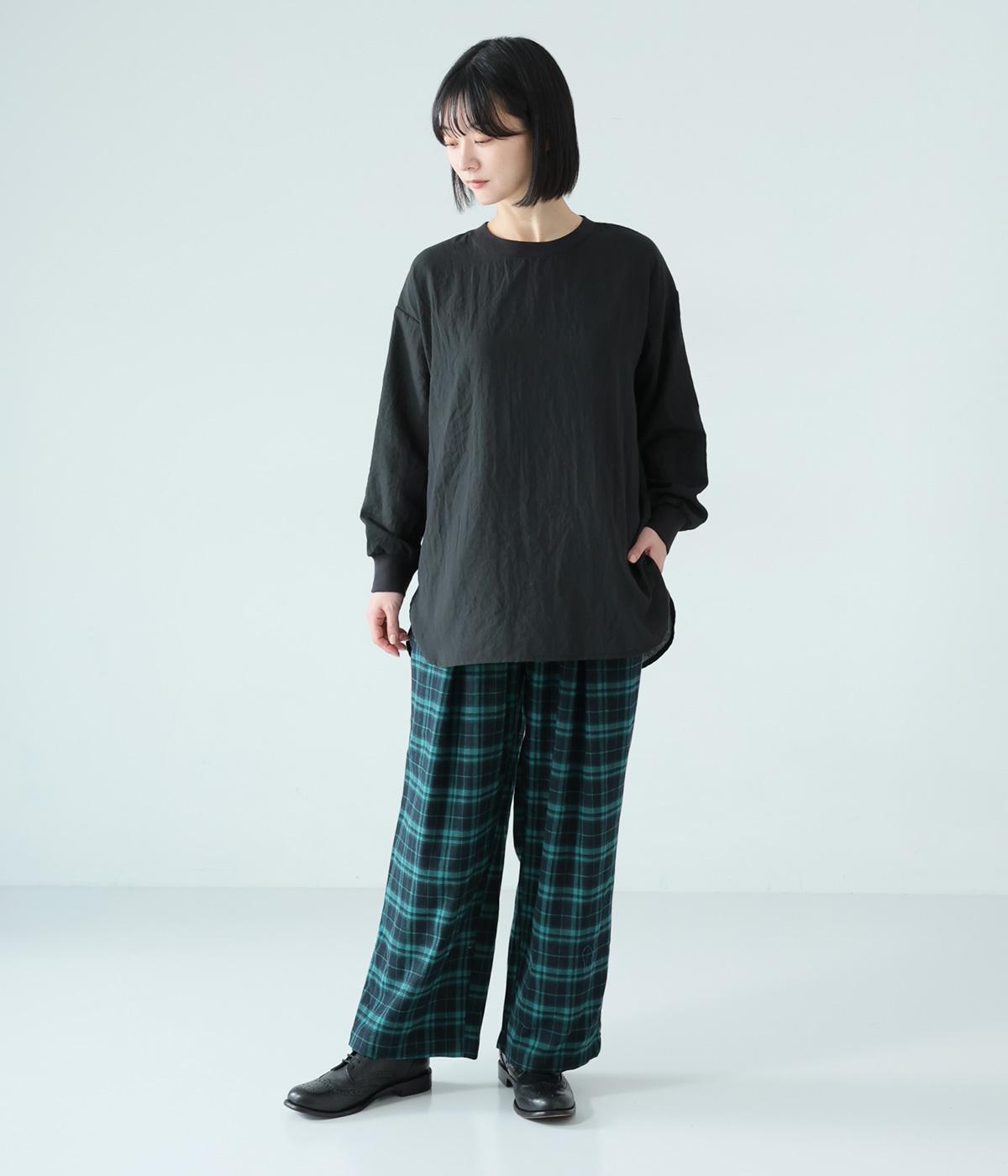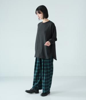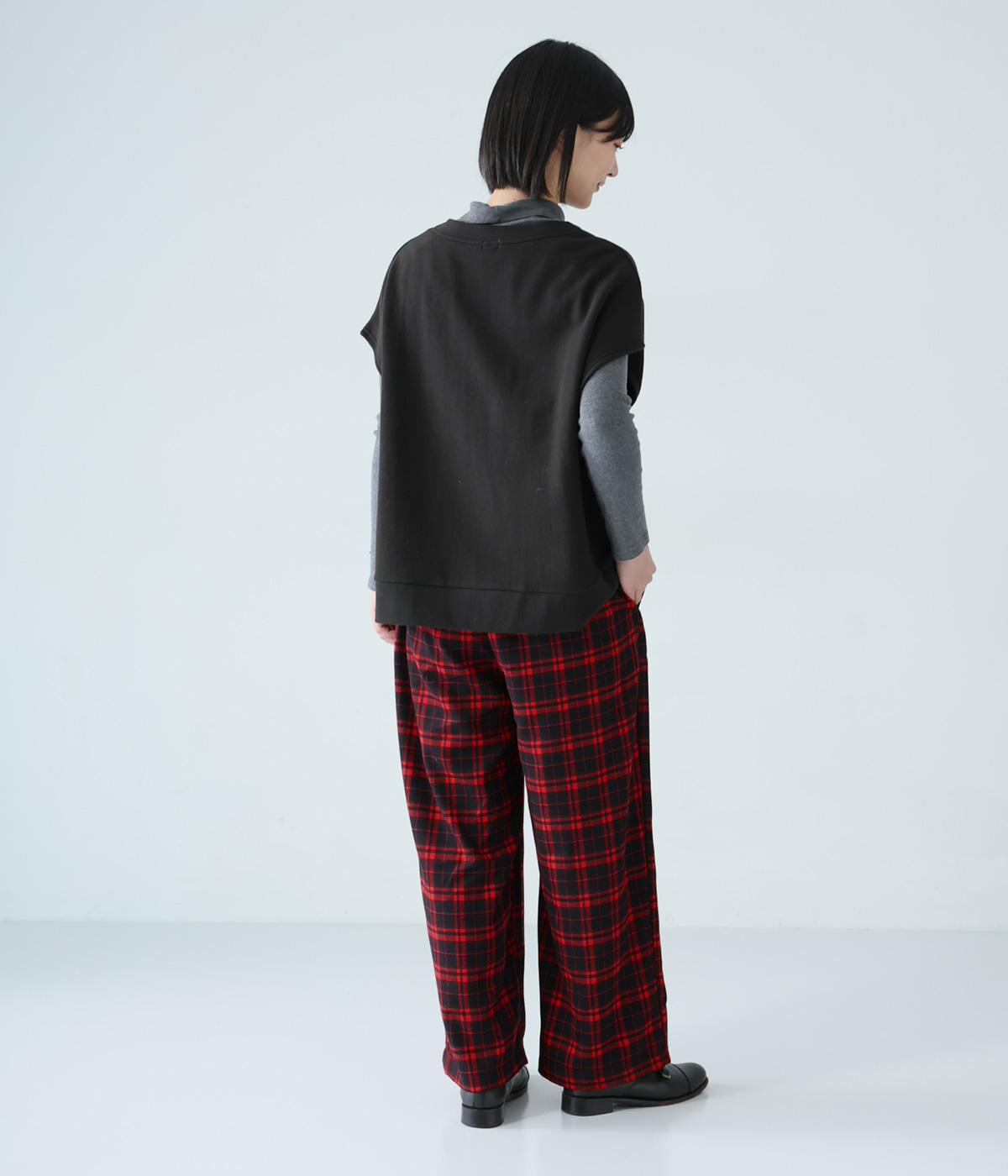 コーディネートの主役になるチェック柄パンツ。前ウエストにタックを入れて腰まわりにゆとりを持たせたワイドストレートシルエットです。両サイドに実用性の高いポケットつき。総ゴム仕様のウエストにはフィット感を調整できる内紐をプラスしました。