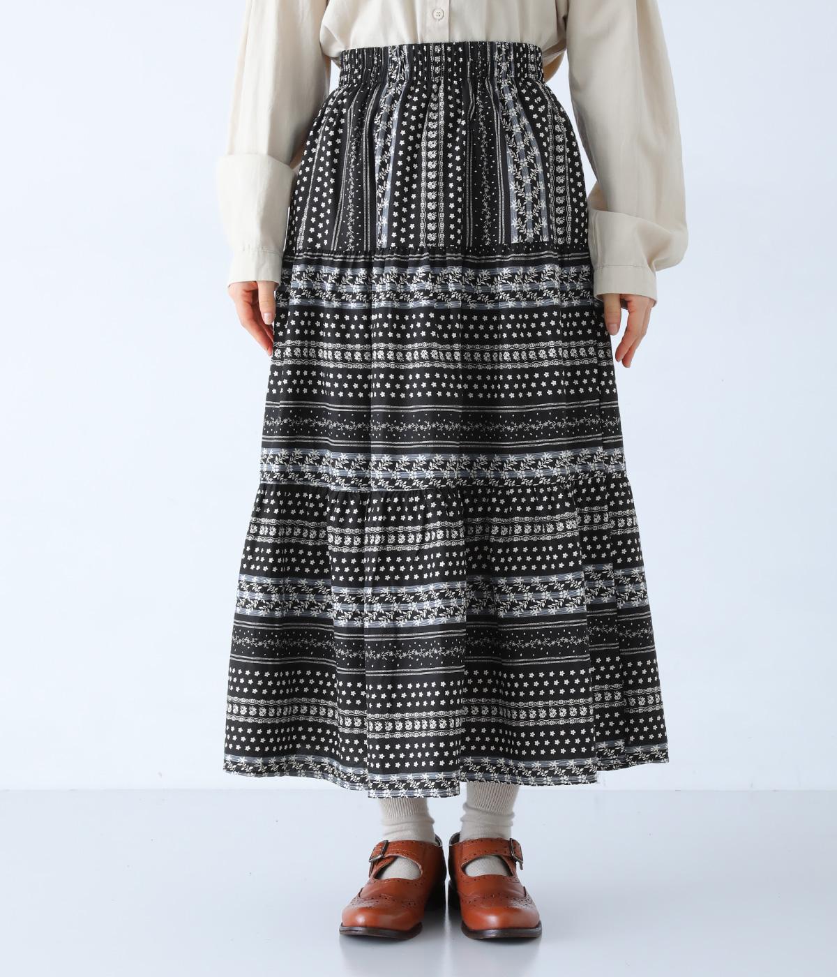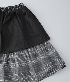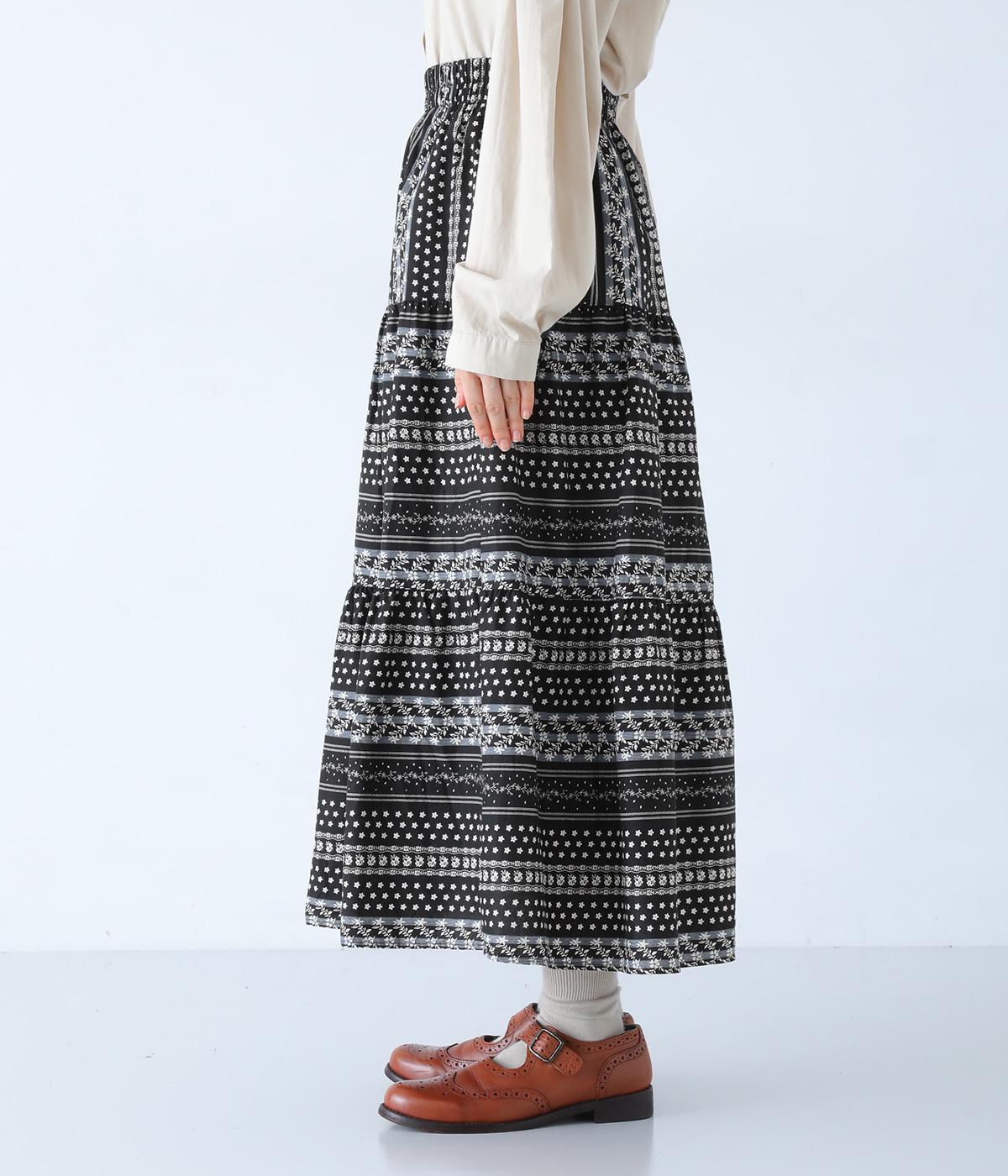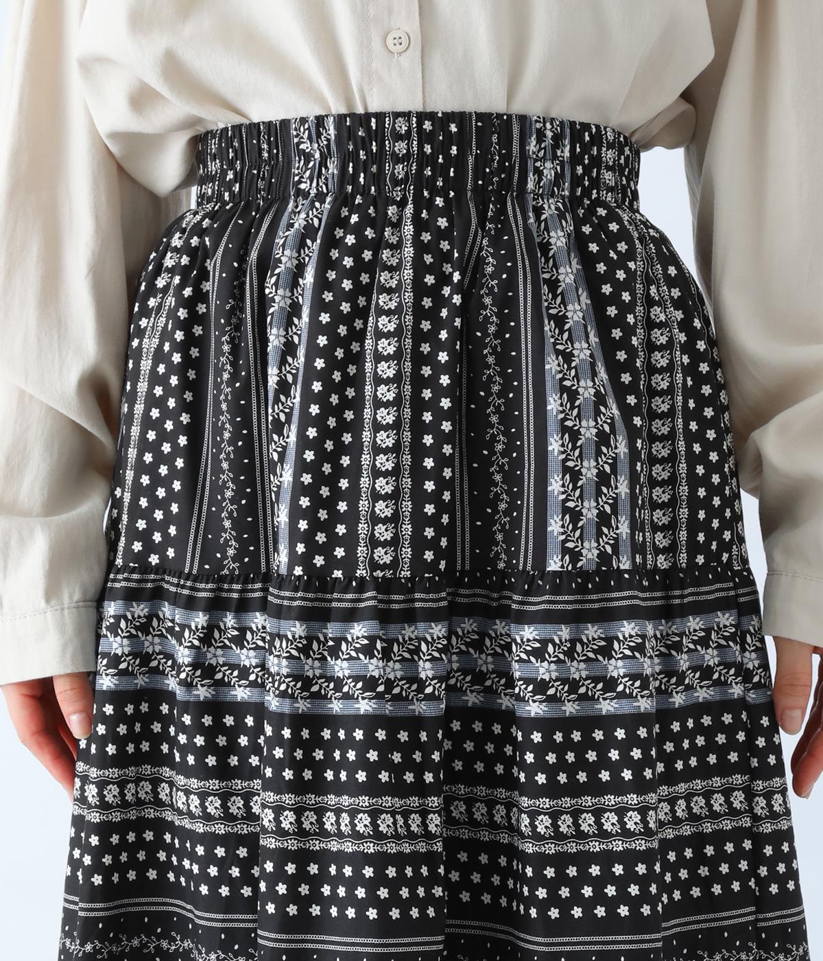 切り替えと細かなギャザーを入れ裾に向かってボリュームを出したステップスカート。表情豊かな小花柄をモノトーンで大人らしく仕上げました。腰まわりは柄の向きを変えて縦ラインを強調し、すっきりとした印象に。ウエストまわりに優しくフィットする総ゴム仕様です。