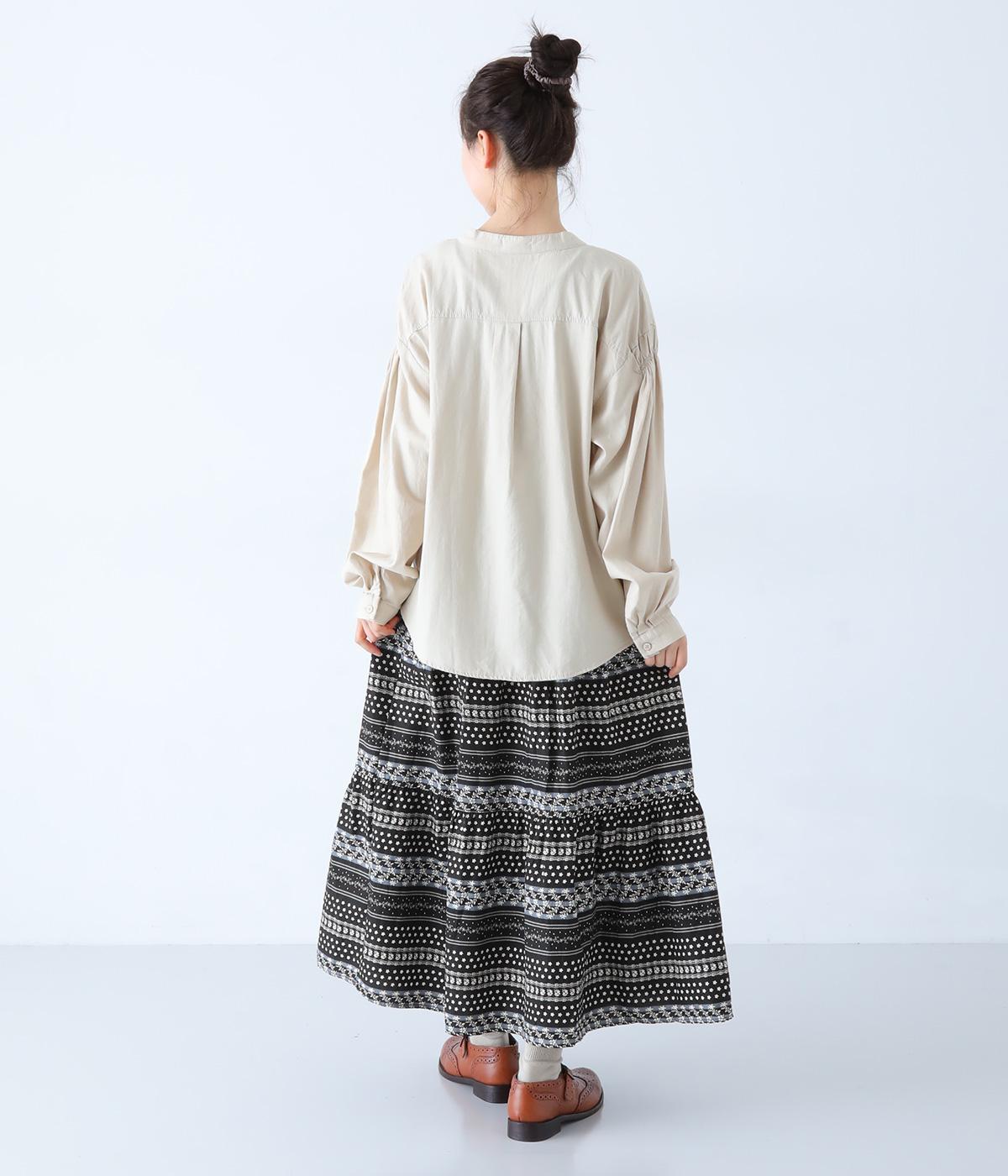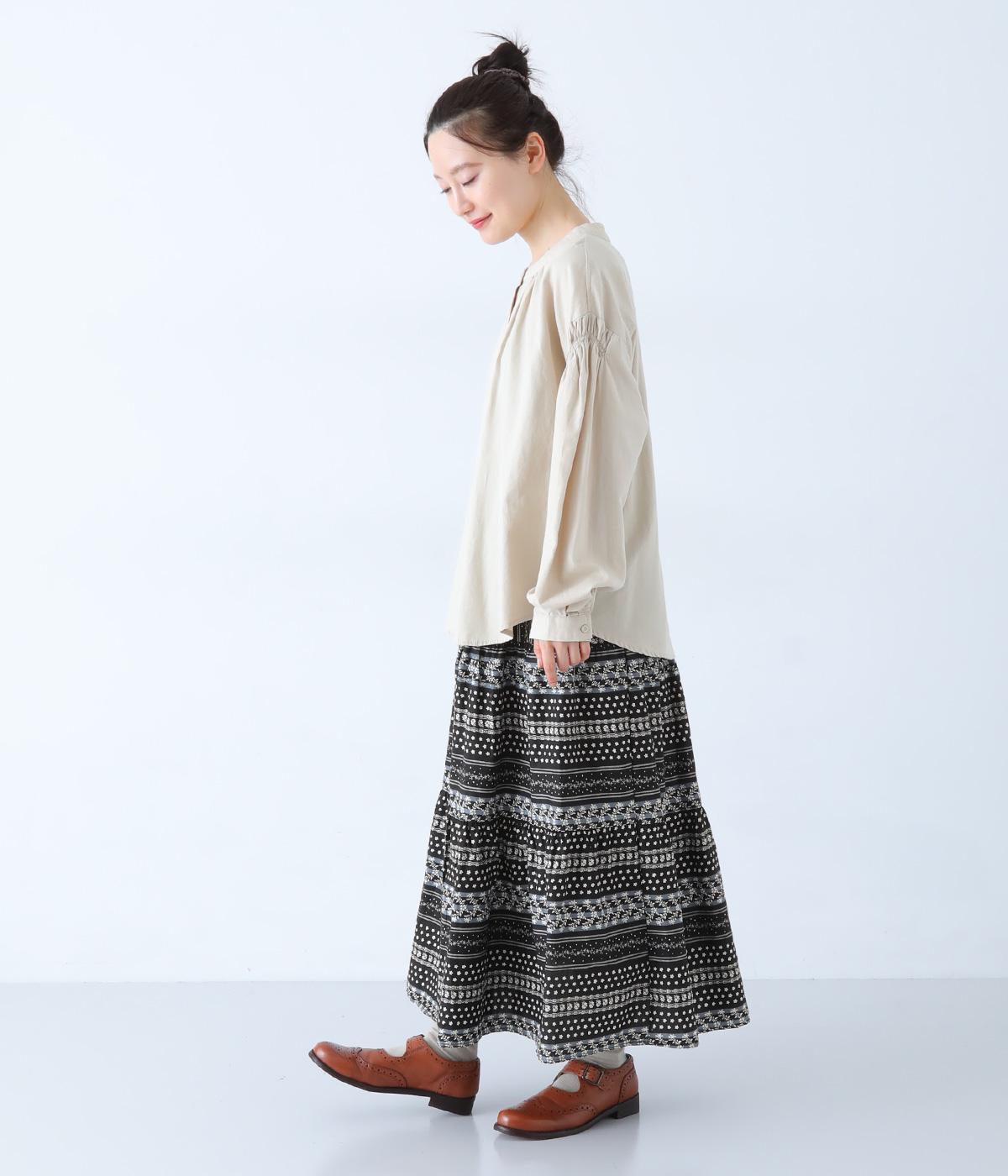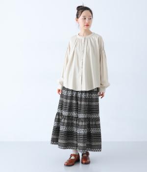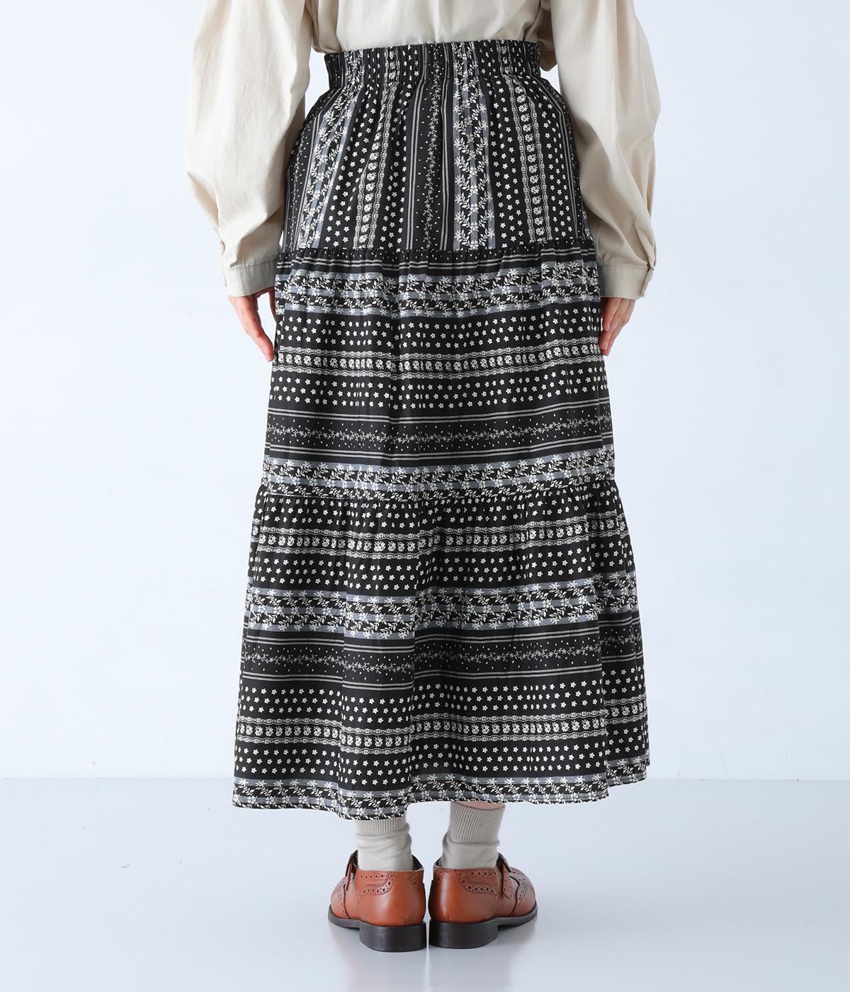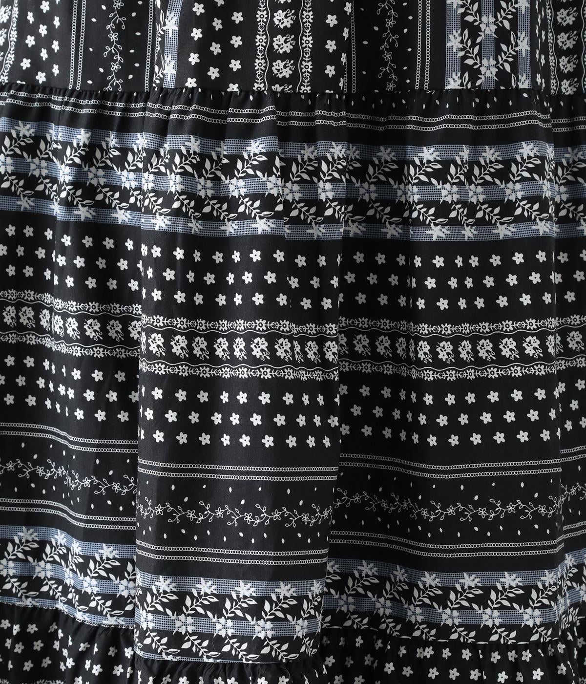 切り替えと細かなギャザーを入れ裾に向かってボリュームを出したステップスカート。表情豊かな小花柄をモノトーンで大人らしく仕上げました。腰まわりは柄の向きを変えて縦ラインを強調し、すっきりとした印象に。ウエストまわりに優しくフィットする総ゴム仕様です。