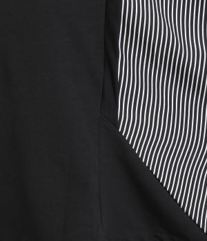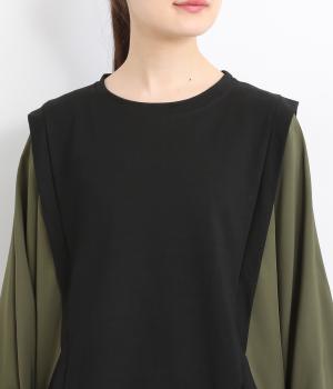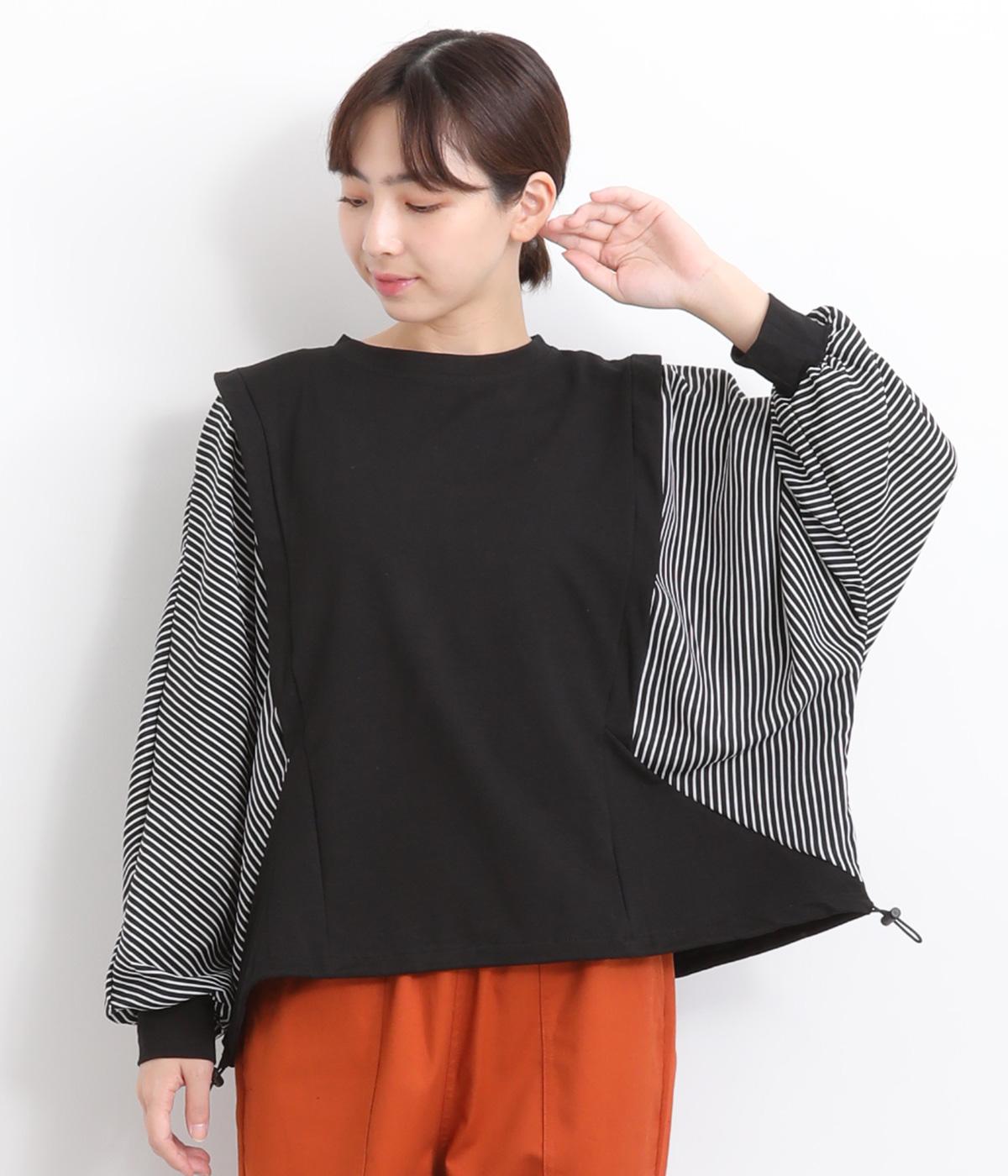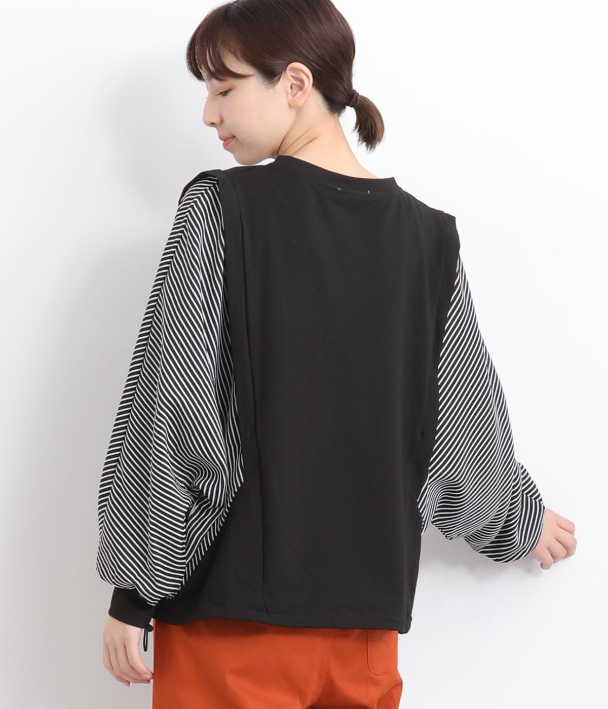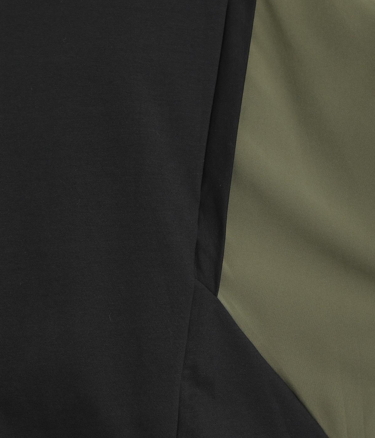 身頃はやわらかで伸びのある黒無地を、袖は光沢やシャリ感のある布帛に切り替えました。速乾性のある涼し気なポリエステル生地を配することでボリューム感のわりに軽やかに仕上がっています。