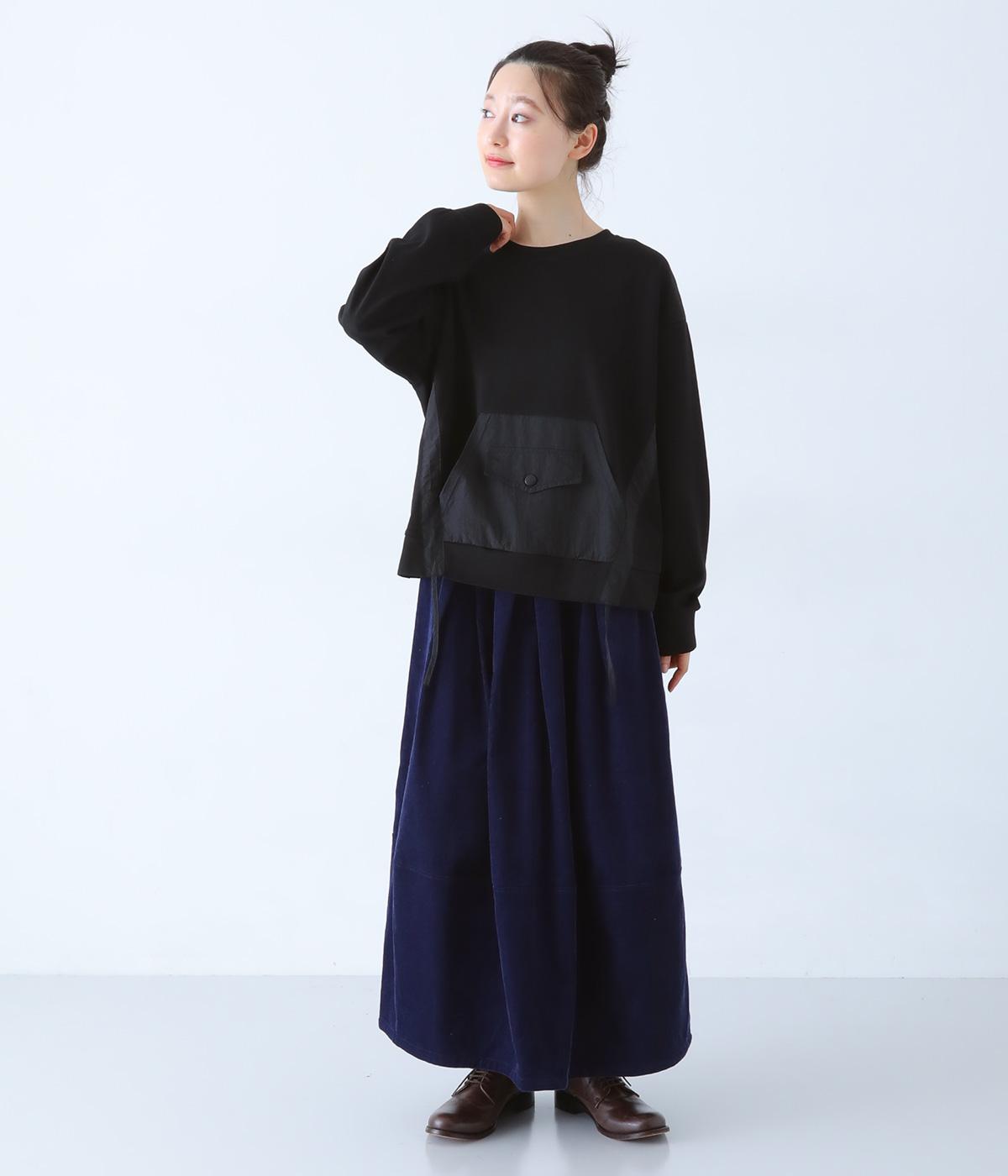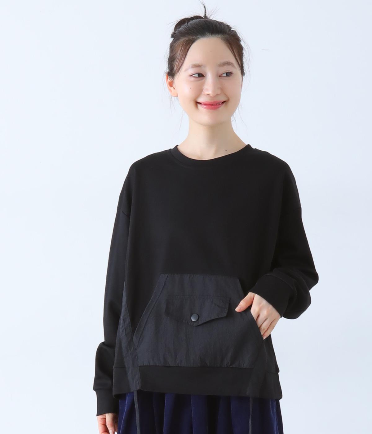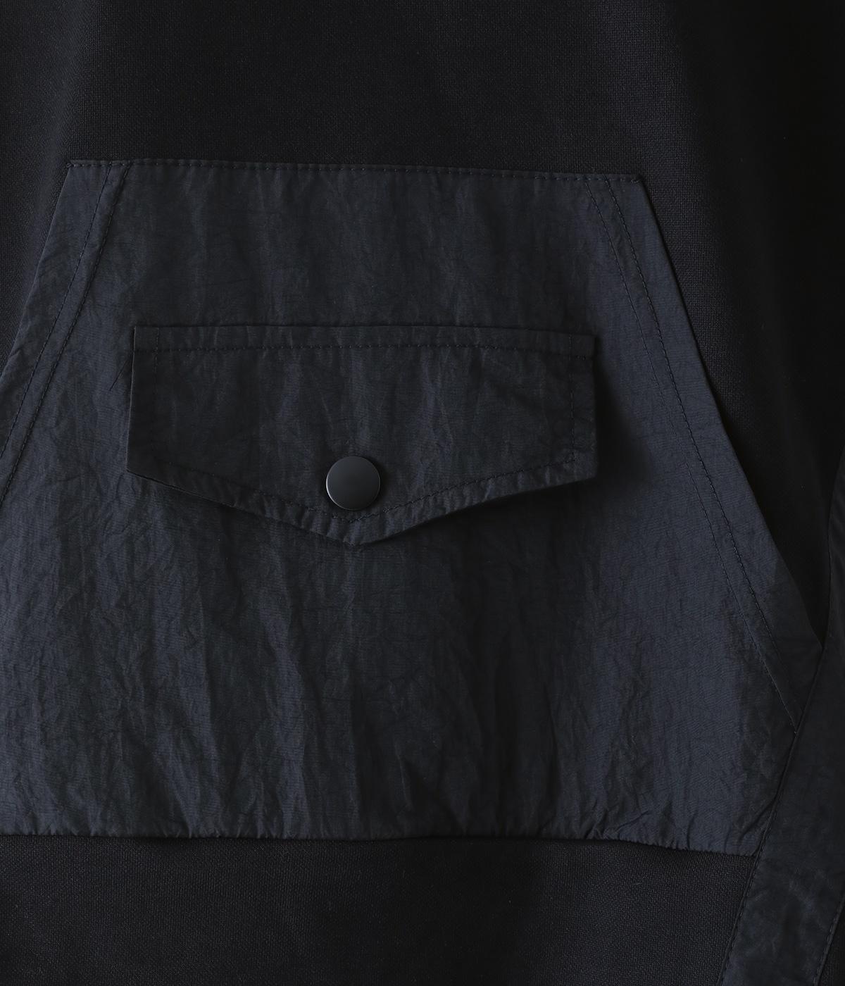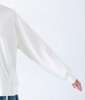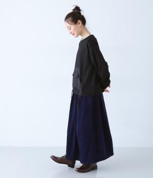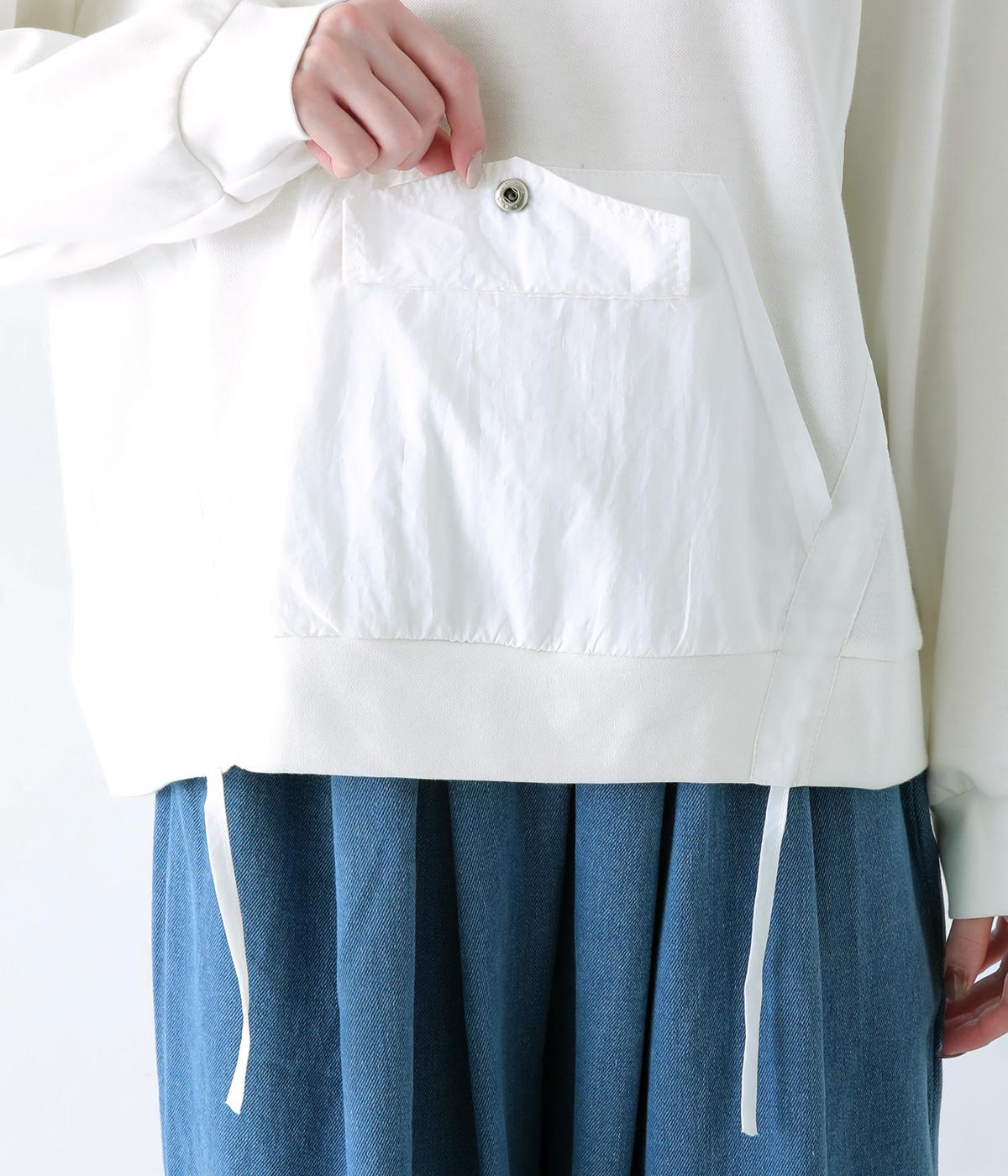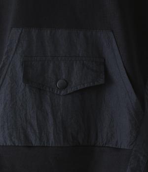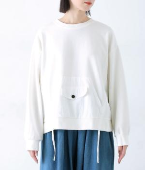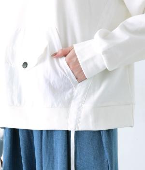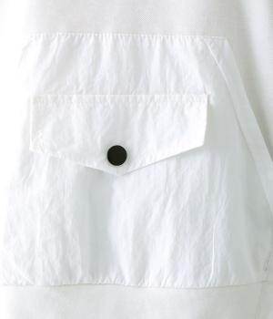 メイントップスとして活躍する適度な厚みのあるコットンポリエステルのカットソー生地。やわらかな風合いで快適に着用できます。ポケット部分にはさらりとした薄手のポリエステル布帛生地を使用しました。