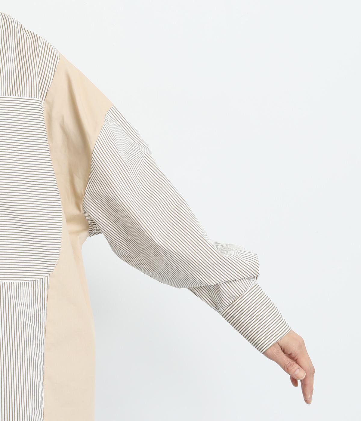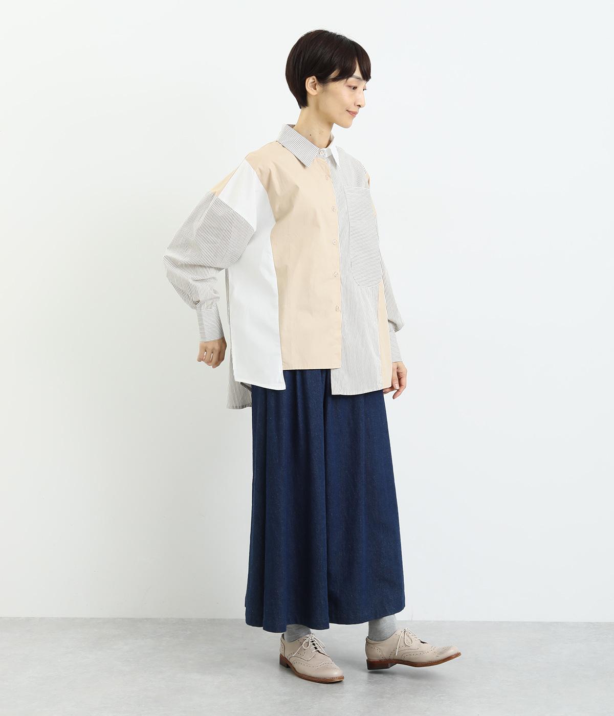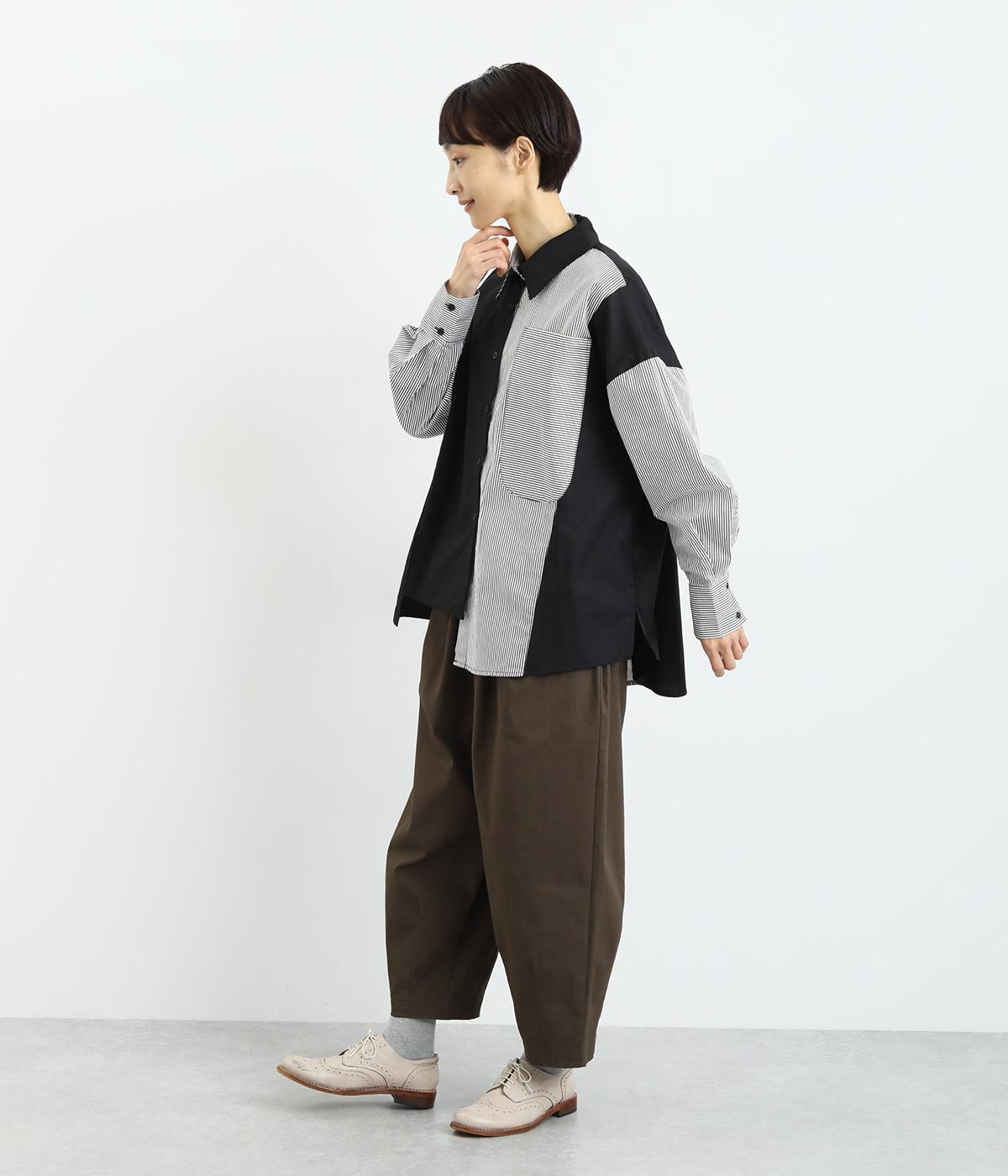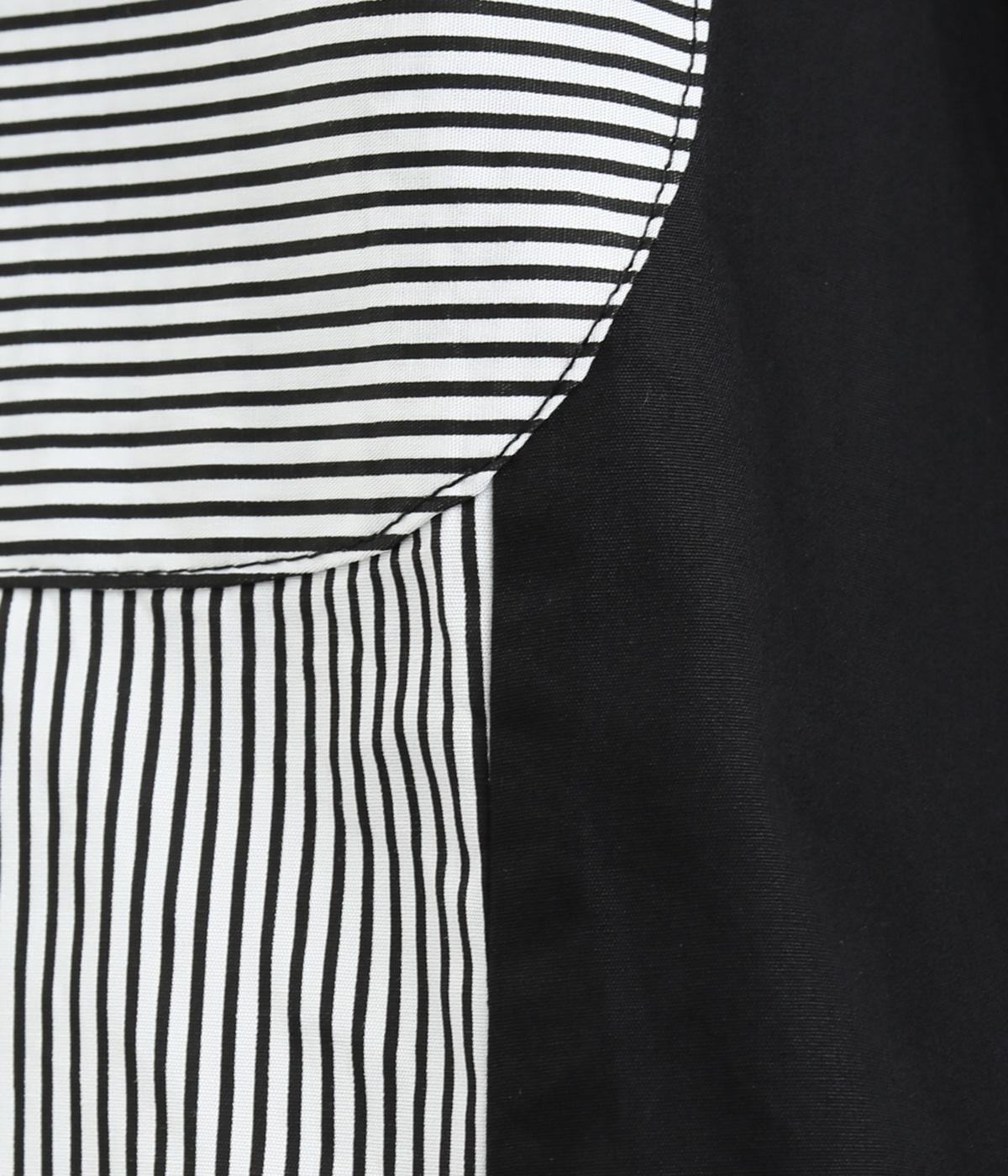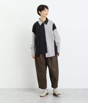 ハリ感のあるコットン素材で、なめらかな肌触りが魅力的。異なる生地のコンビネーションはカジュアルすぎないのも大人にうれしいポイントです。
