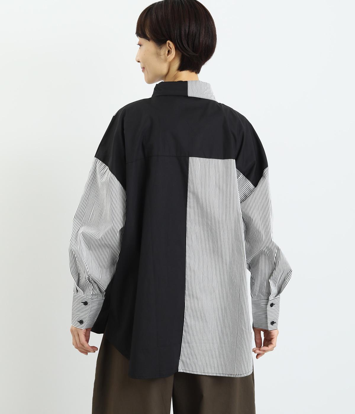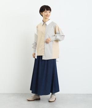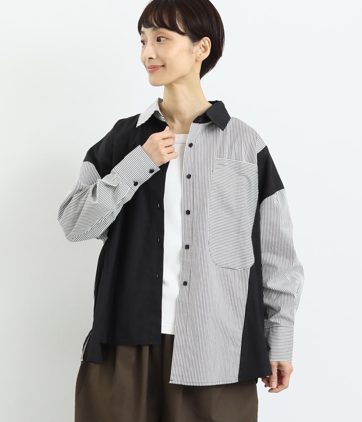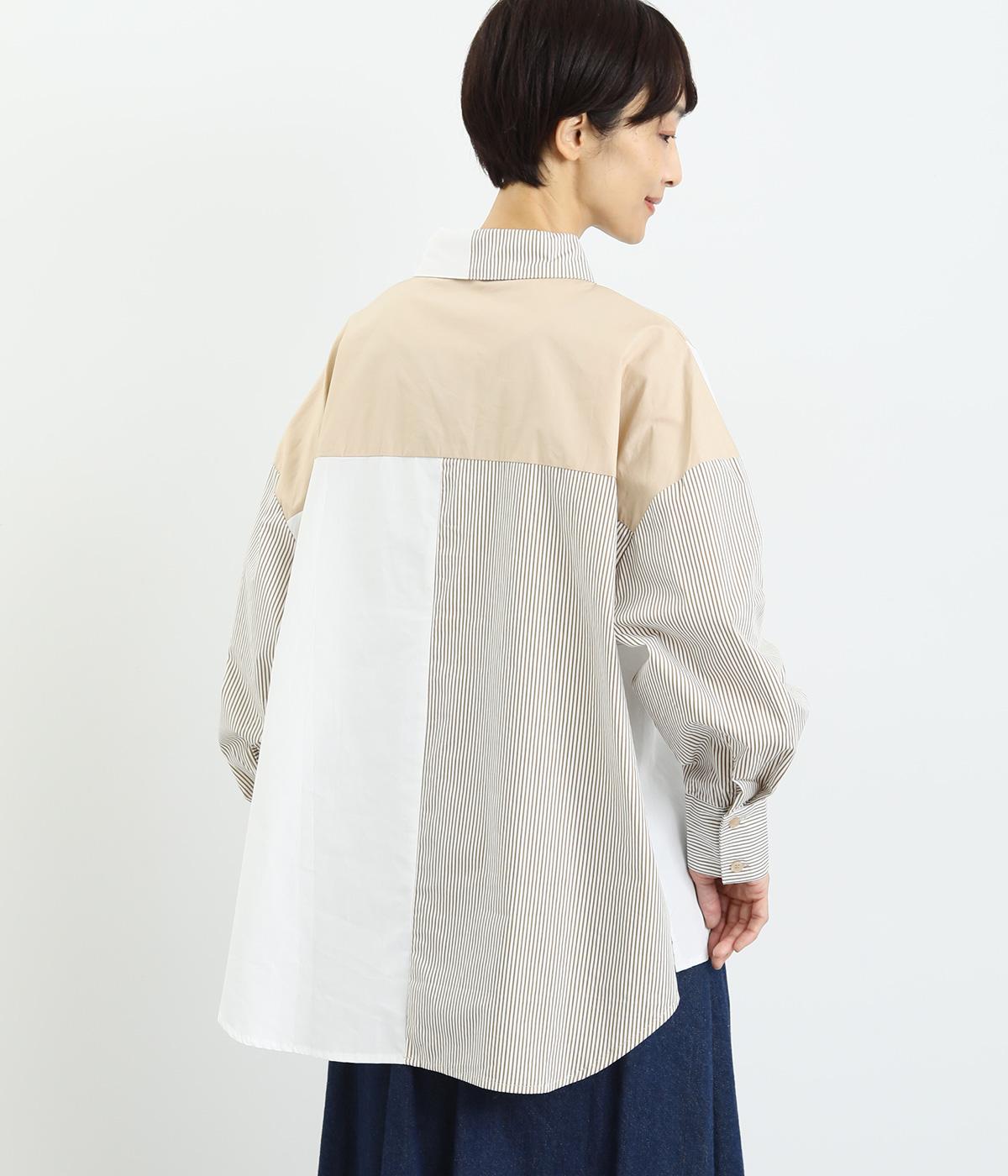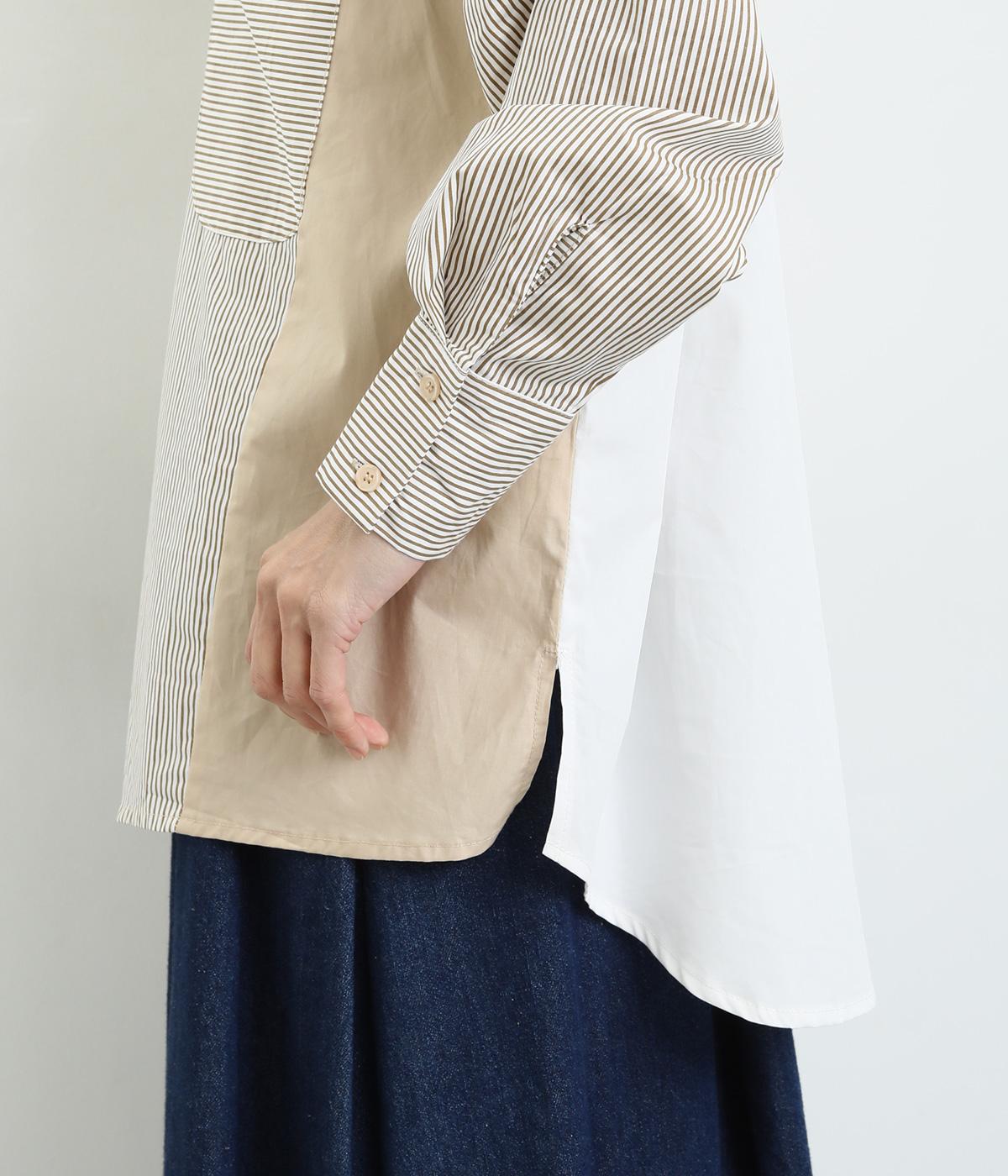 ハリ感のあるコットン素材で、なめらかな肌触りが魅力的。異なる生地のコンビネーションはカジュアルすぎないのも大人にうれしいポイントです。