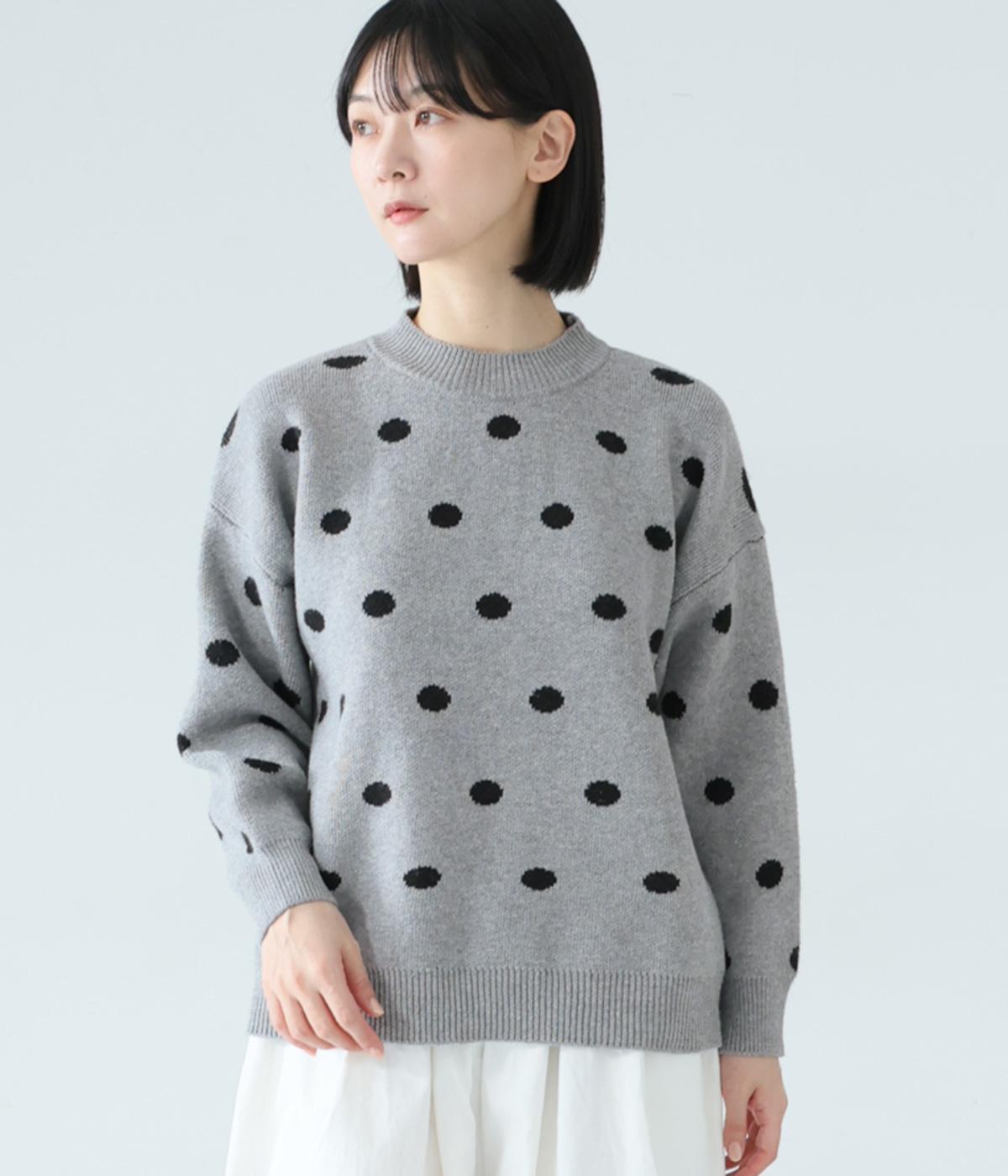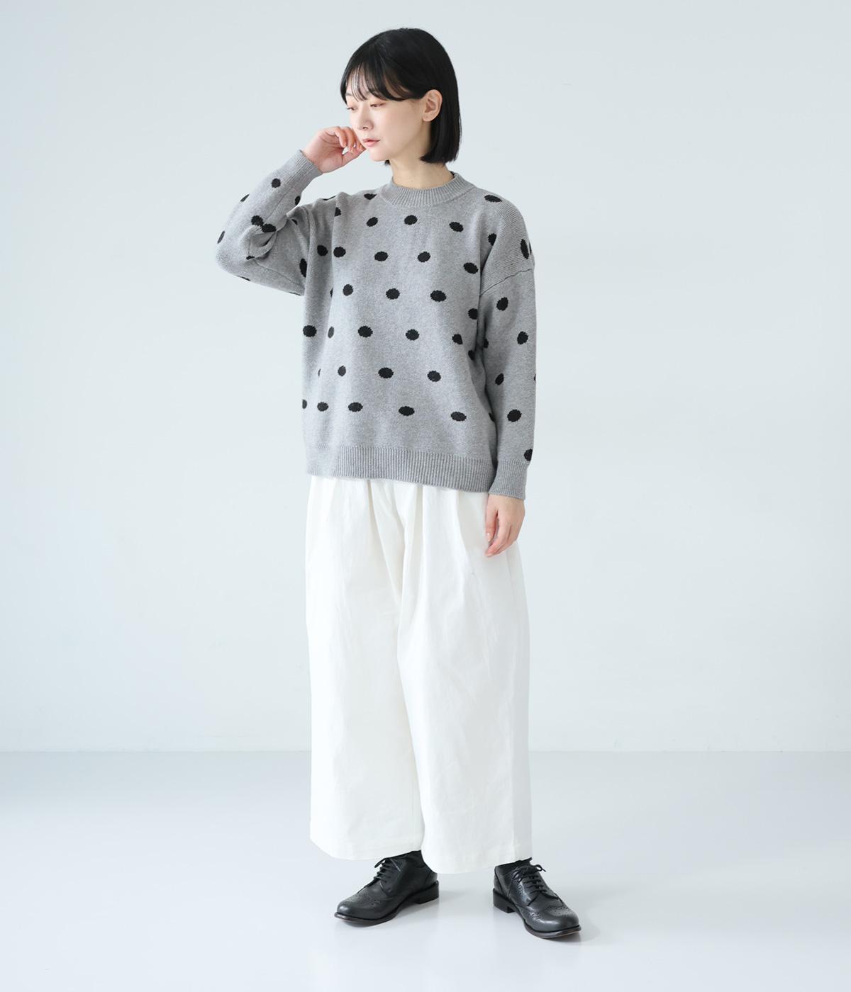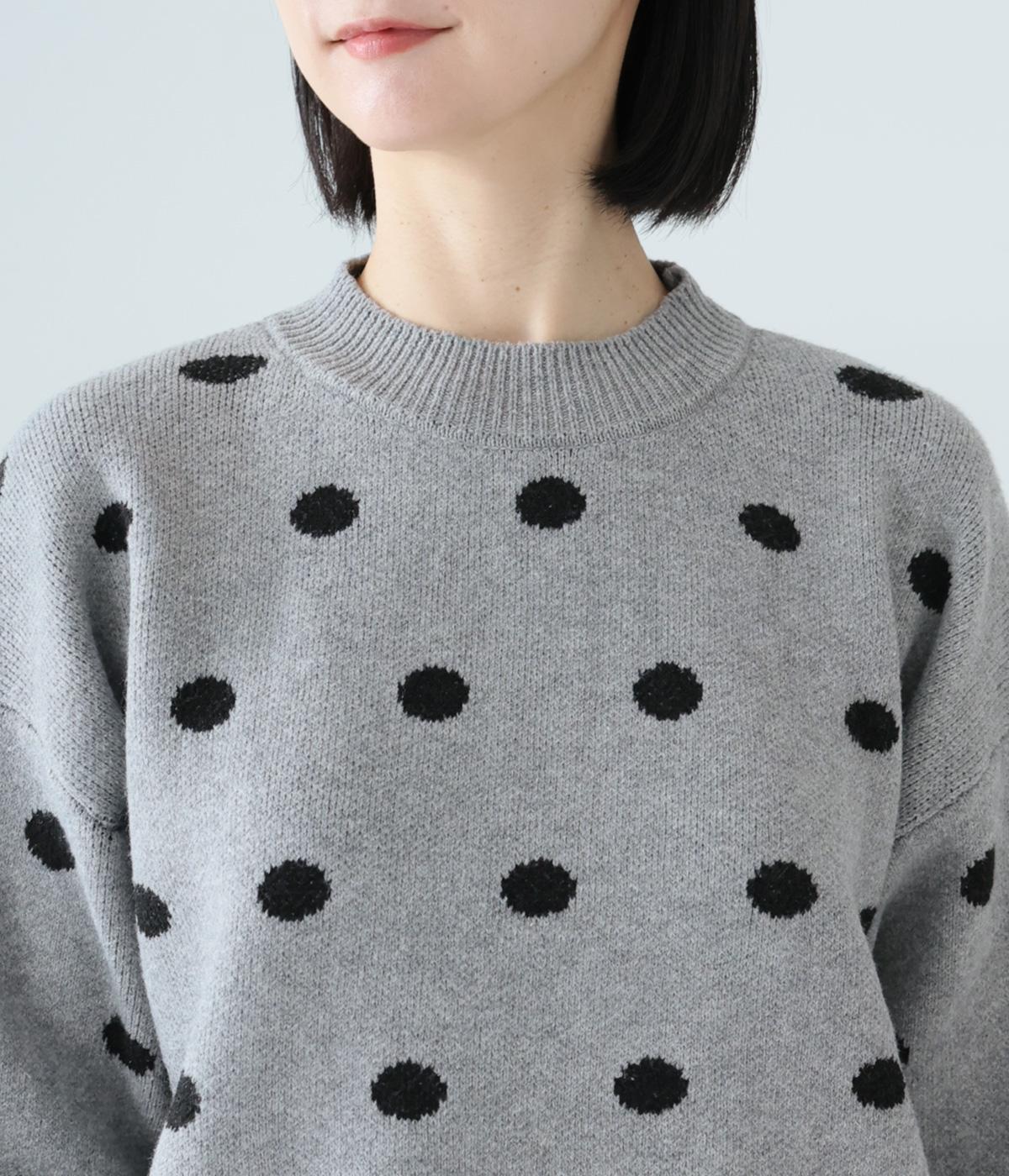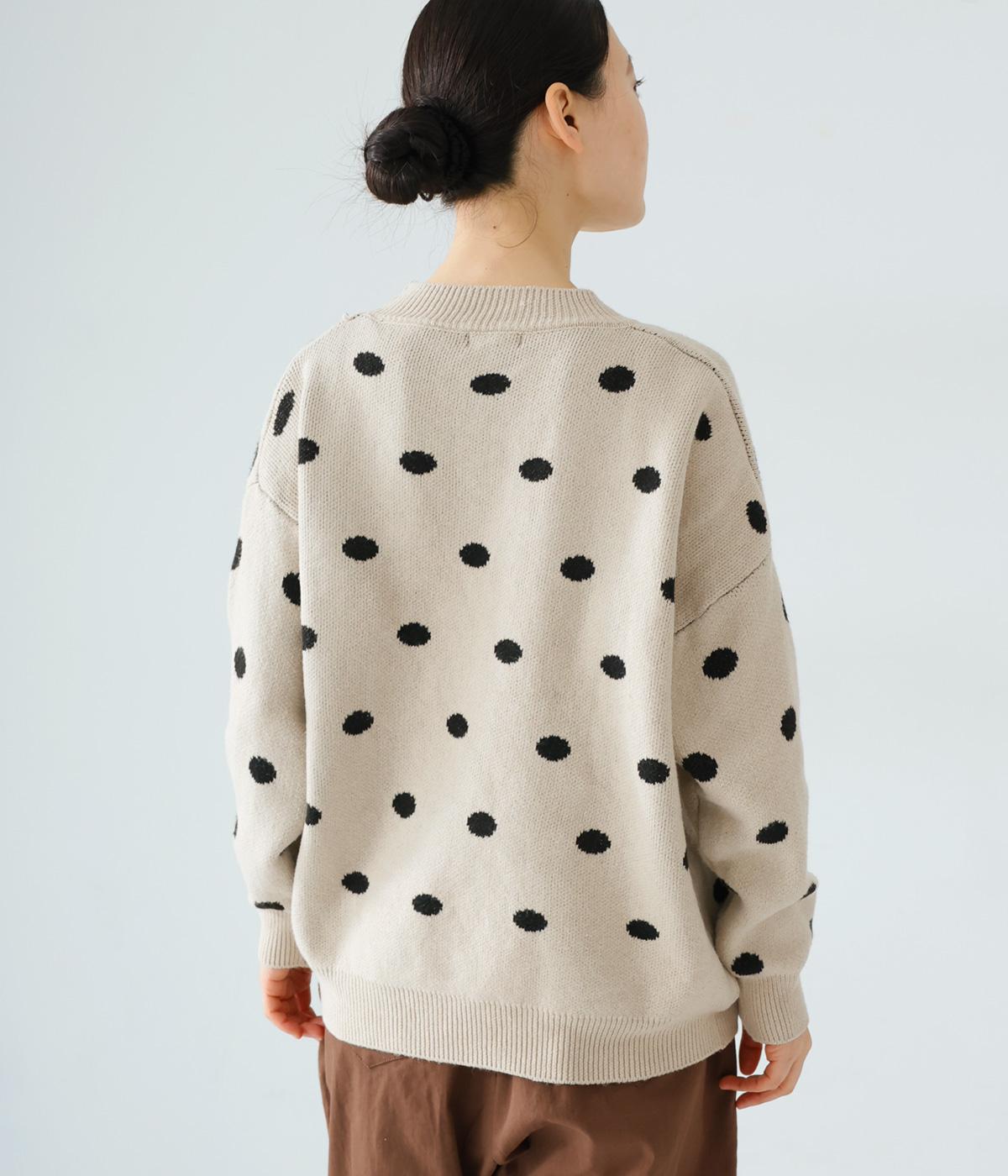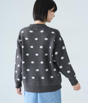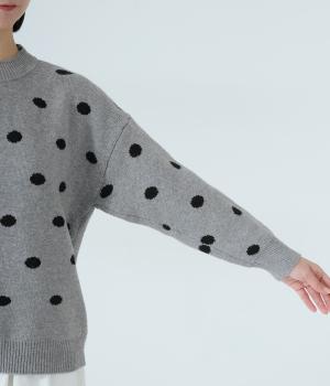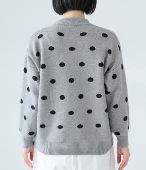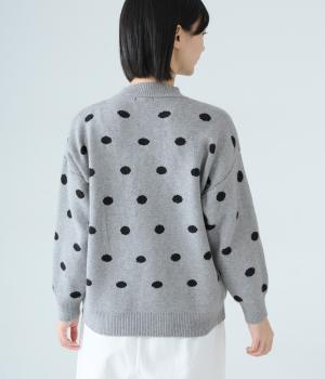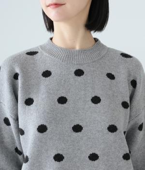 少し大きめのドット柄が大人かわいいニットプルオーバー。きゅっと詰まったネックラインで、カジュアルすぎない洗練されたムードをプラスしました。裾部分は無地の面積を大きくすることで自然と視線が上がり、スタイルを引き立ててくれます。