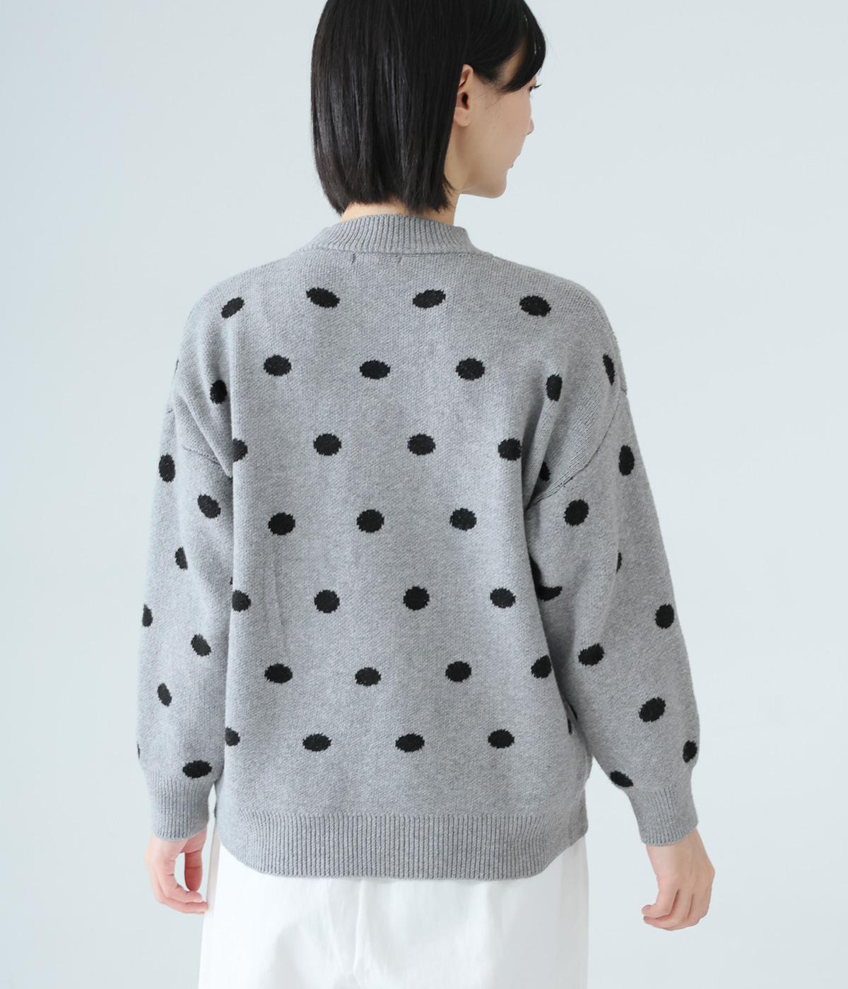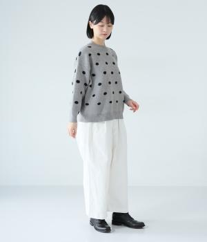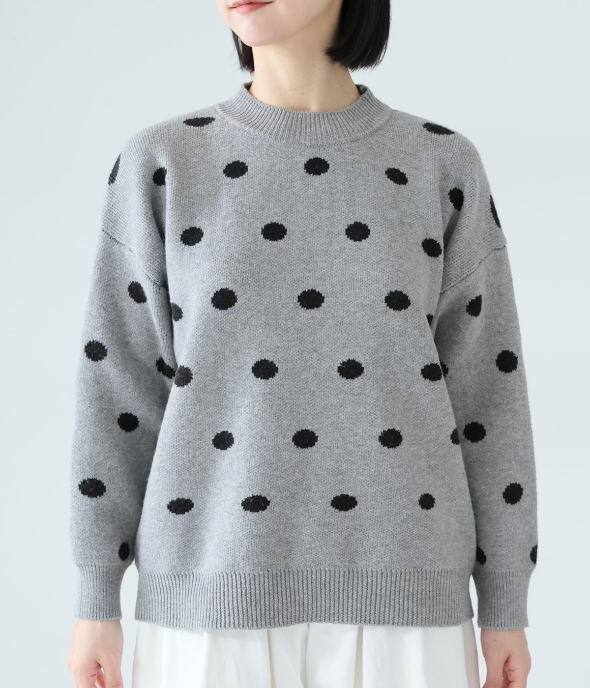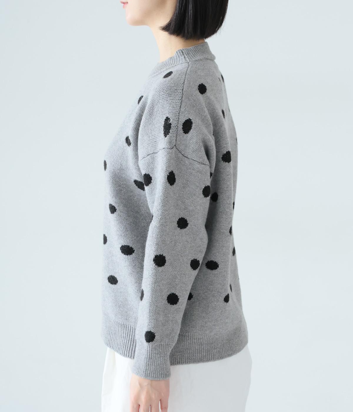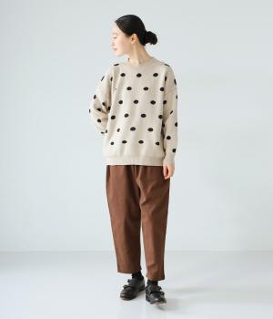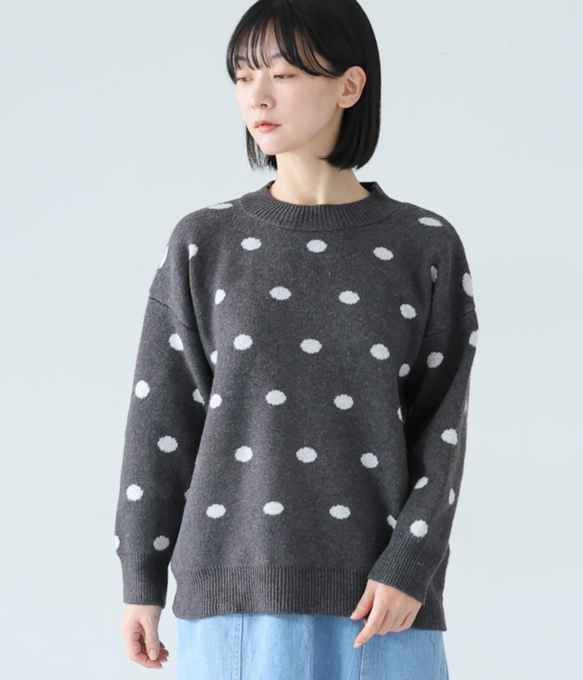 少し大きめのドット柄が大人かわいいニットプルオーバー。きゅっと詰まったネックラインで、カジュアルすぎない洗練されたムードをプラスしました。裾部分は無地の面積を大きくすることで自然と視線が上がり、スタイルを引き立ててくれます。