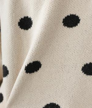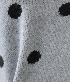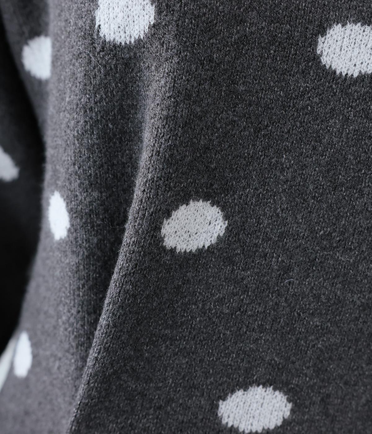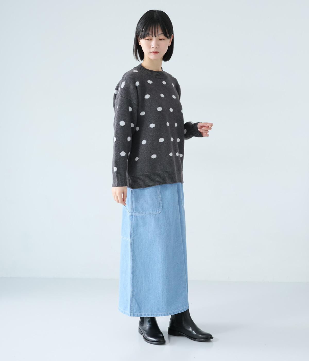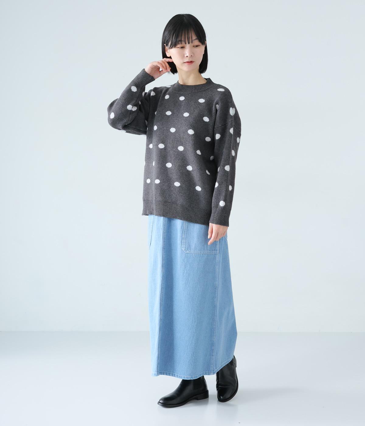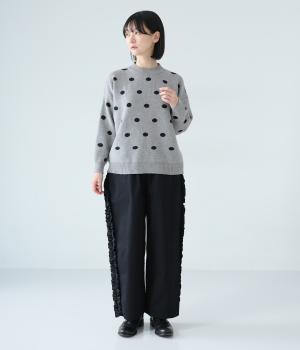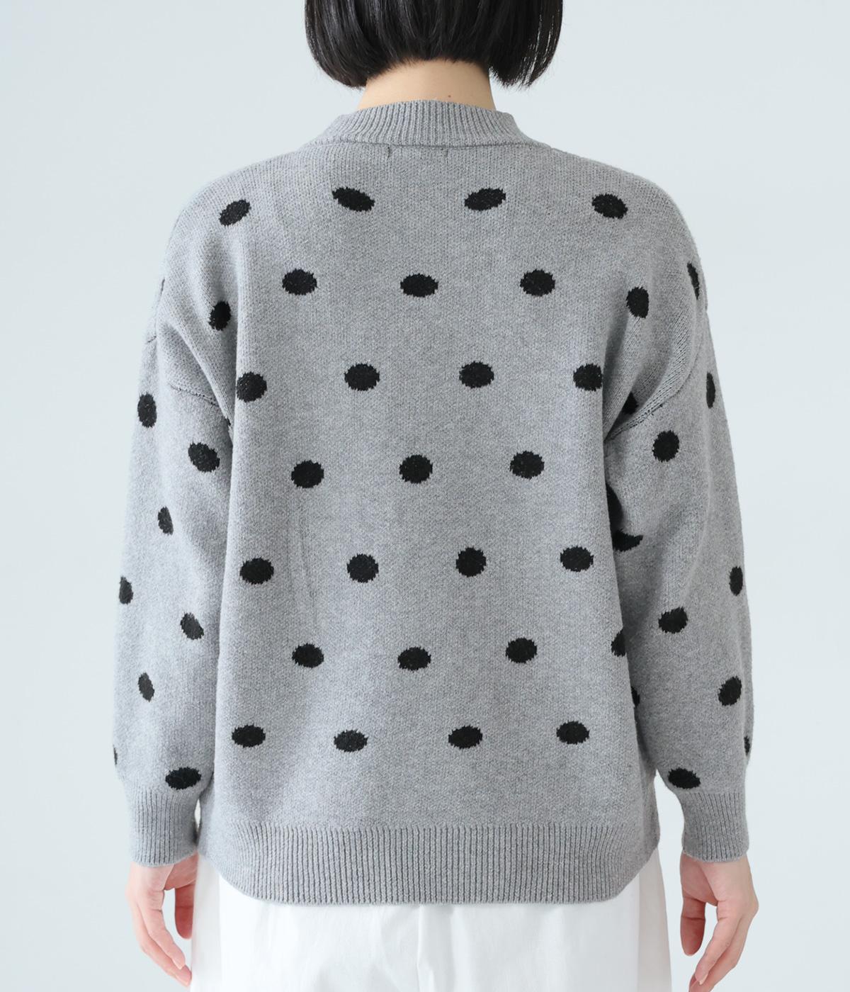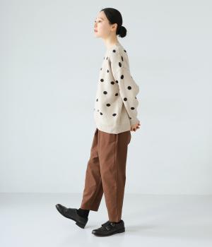 少し大きめのドット柄が大人かわいいニットプルオーバー。きゅっと詰まったネックラインで、カジュアルすぎない洗練されたムードをプラスしました。裾部分は無地の面積を大きくすることで自然と視線が上がり、スタイルを引き立ててくれます。