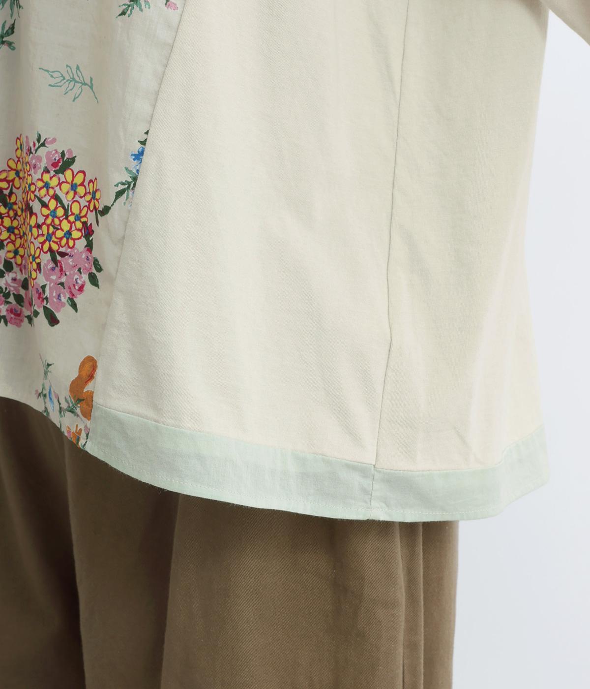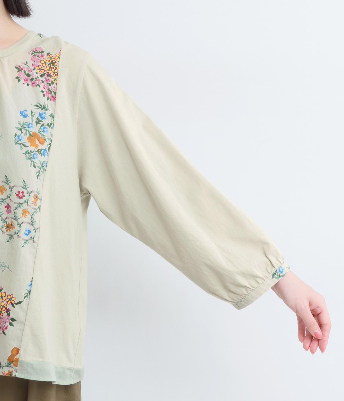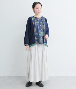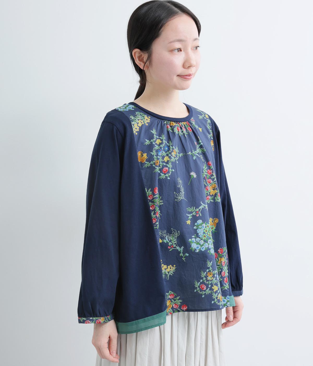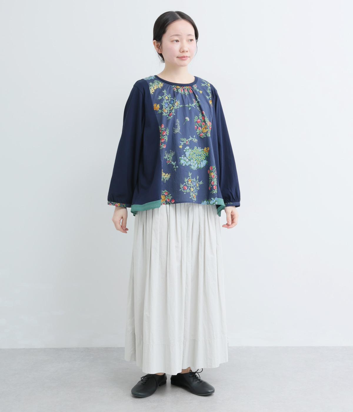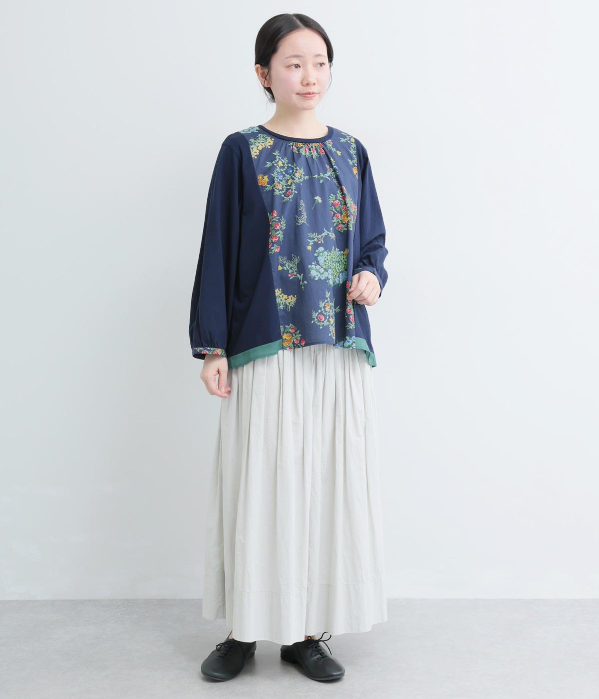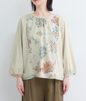 さまざまなブーケからリスがのぞく様子が愛らしいプリント生地をメインに、切り替えデザインですっきり見せたプルオーバー。ギャザーを寄せてフレア感を出し、軽い素材でノンストレスな着心地に。前後差や配色などヘムラインにも注目。