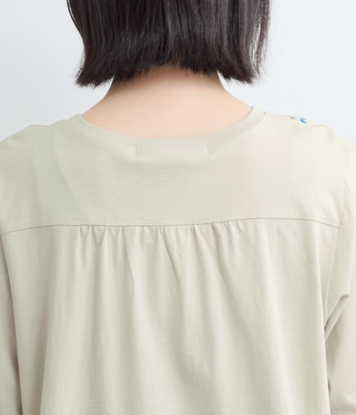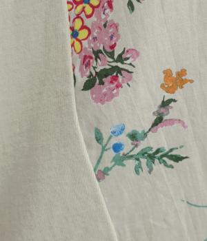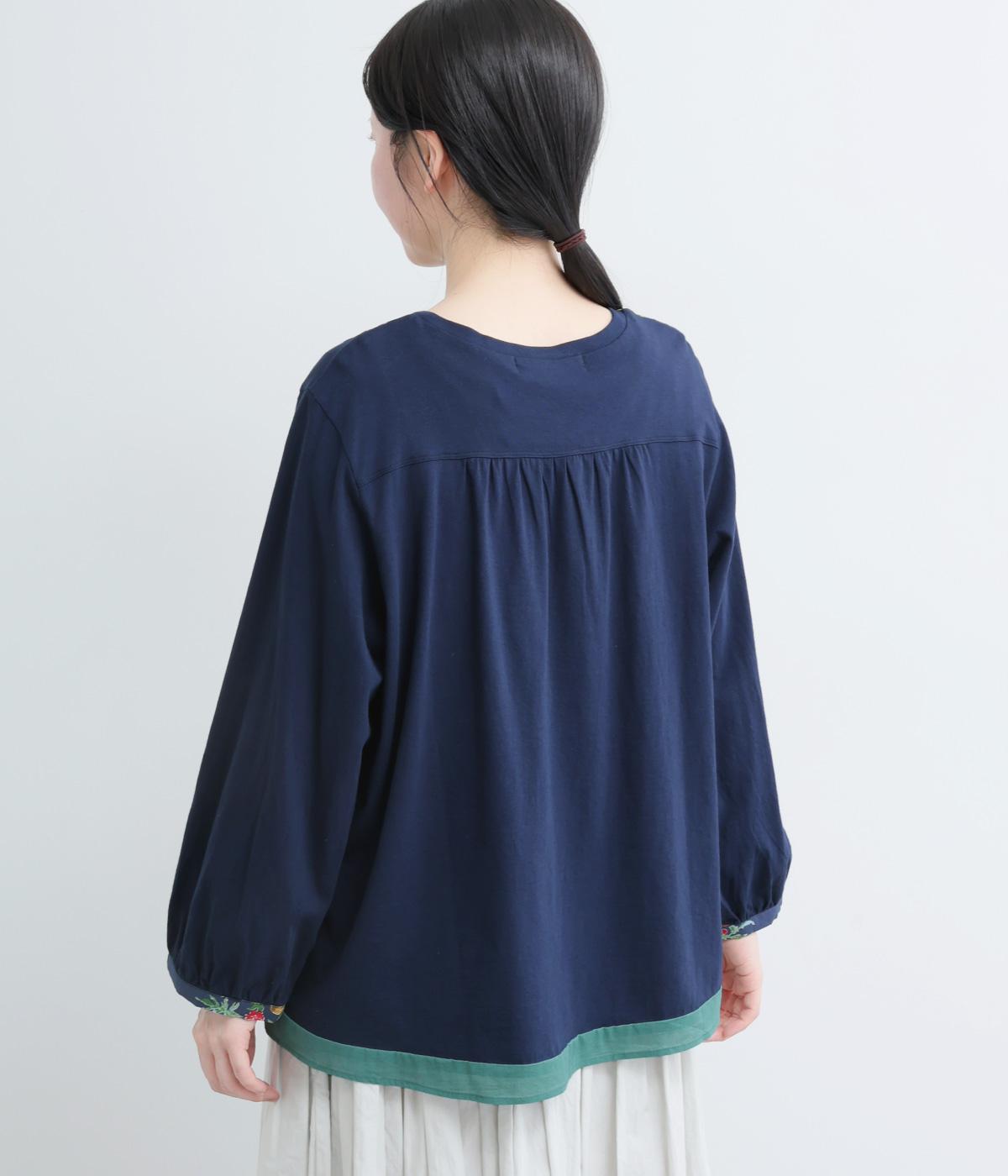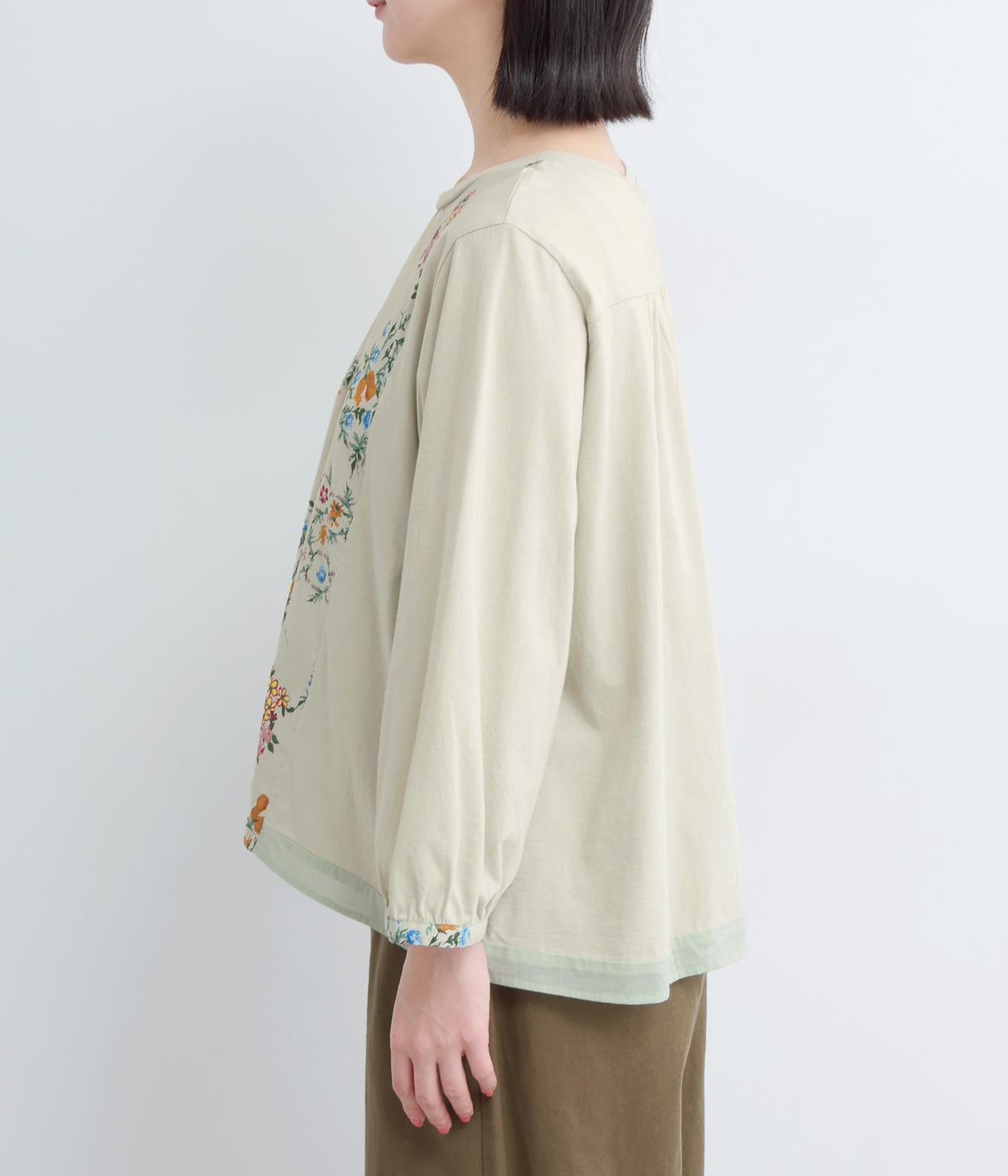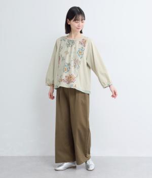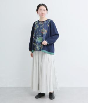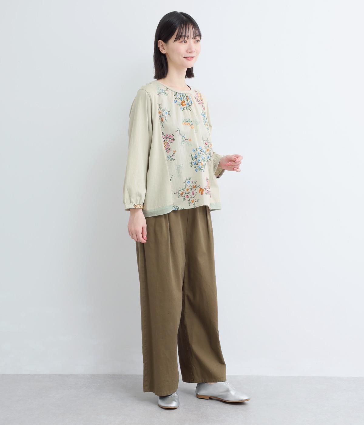 さまざまなブーケからリスがのぞく様子が愛らしいプリント生地をメインに、切り替えデザインですっきり見せたプルオーバー。ギャザーを寄せてフレア感を出し、軽い素材でノンストレスな着心地に。前後差や配色などヘムラインにも注目。
