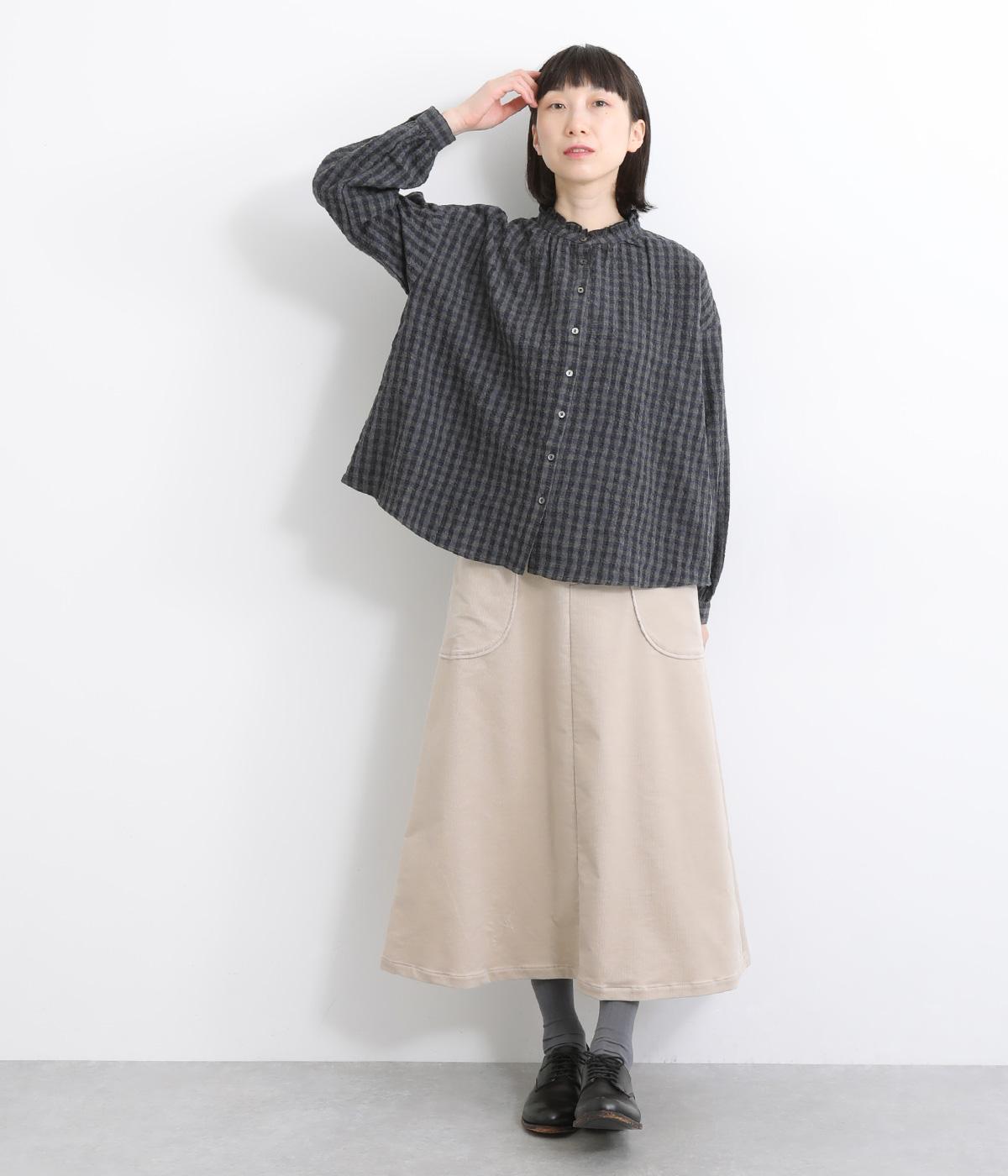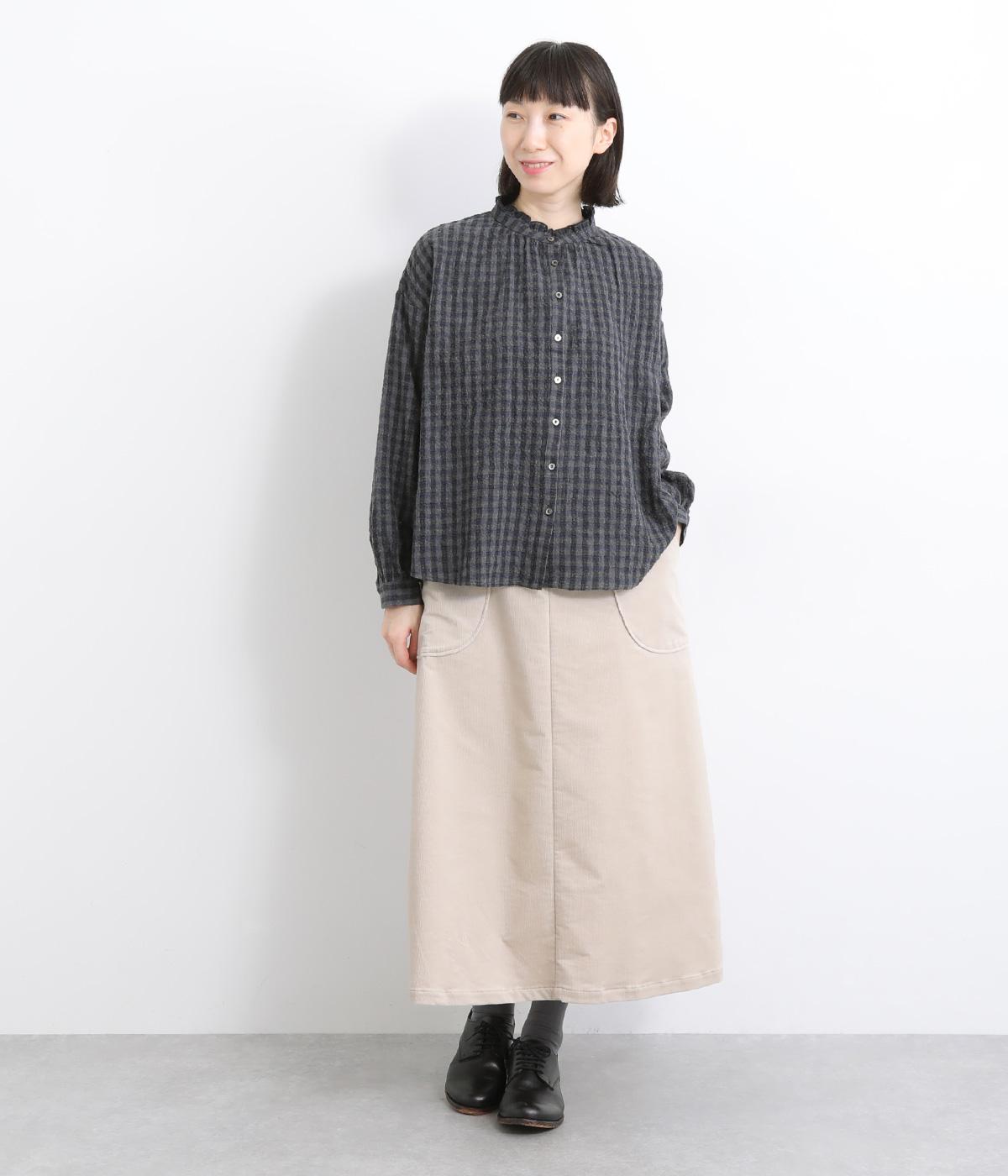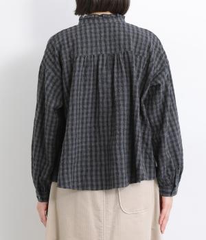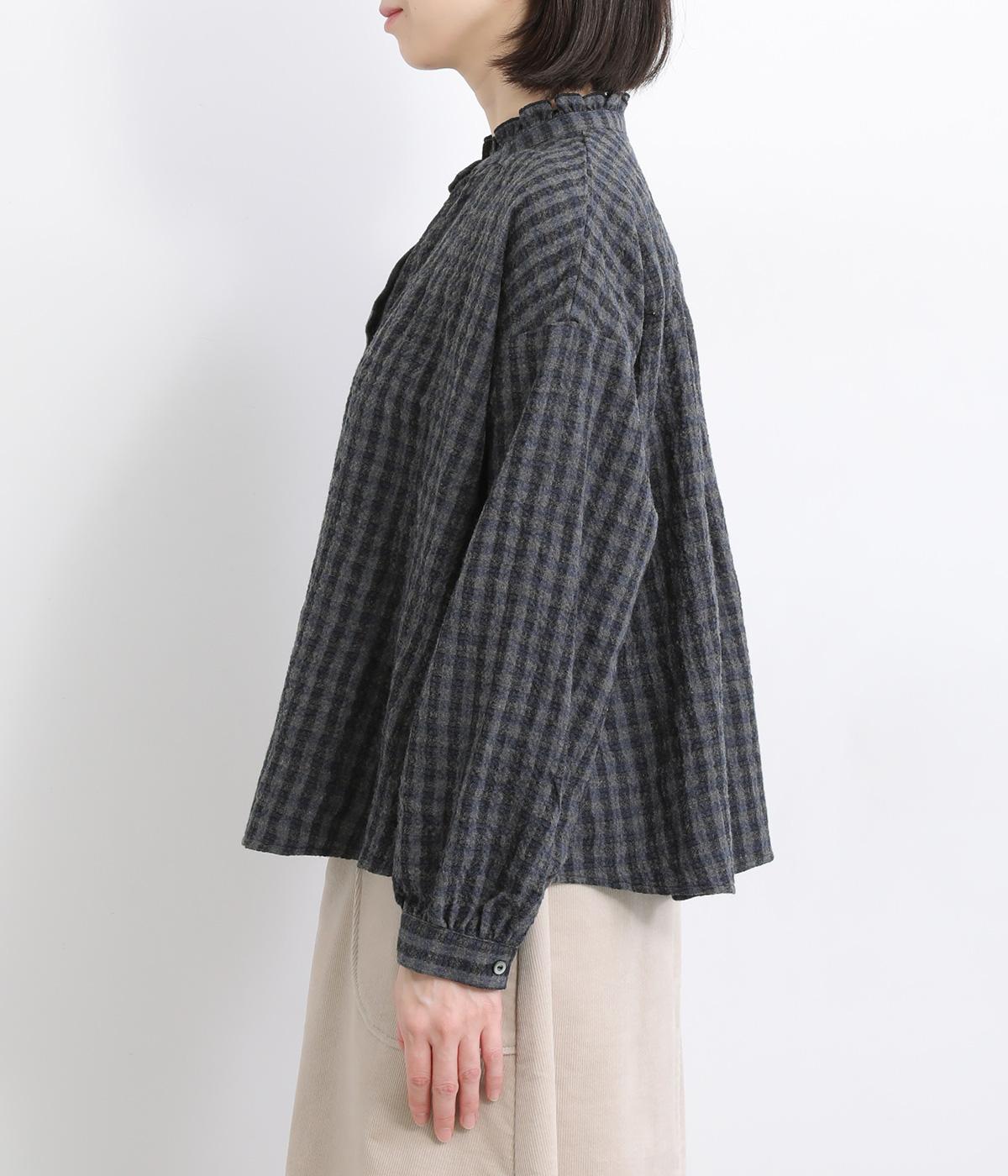 ギンガムチェックにフリルカラーで着こなしのポイントになる一枚。サイズ感もちょうどよく、ゆったりとしたスウェットやニットのインナー使いもおすすめ。ふわりとした袖も可愛らしく、甘すぎないフェミニンさが魅力です。