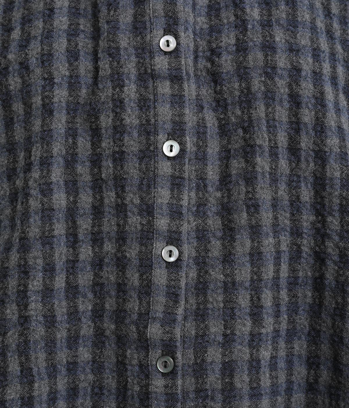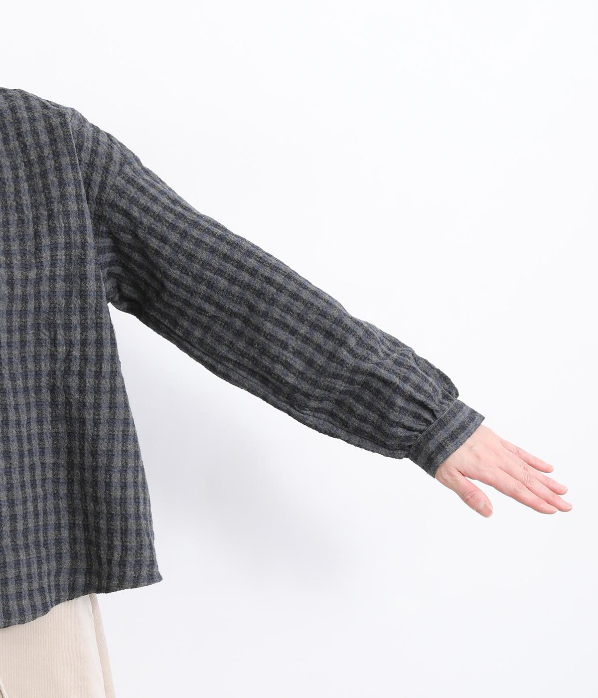 ウールやコットンをまぜた、あたたかみのある混紡素材を使用しています。交織織りに特殊加工で、ワッフルのようにポコポコとした表面感に仕上げました。薄手で軽く着心地も◎。