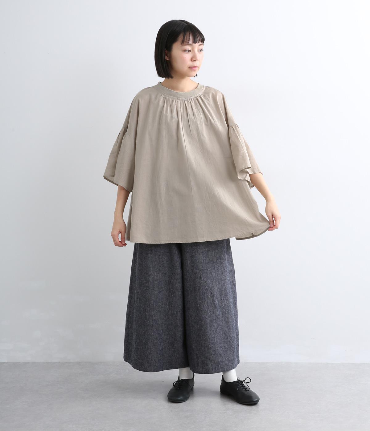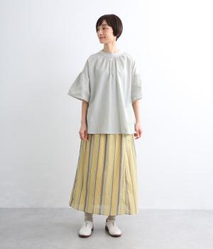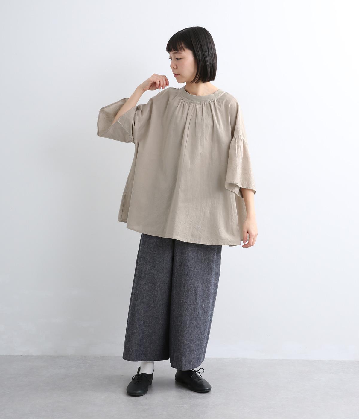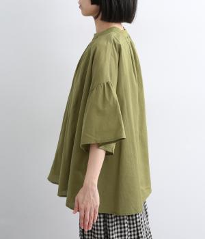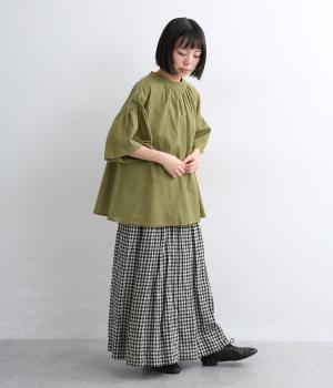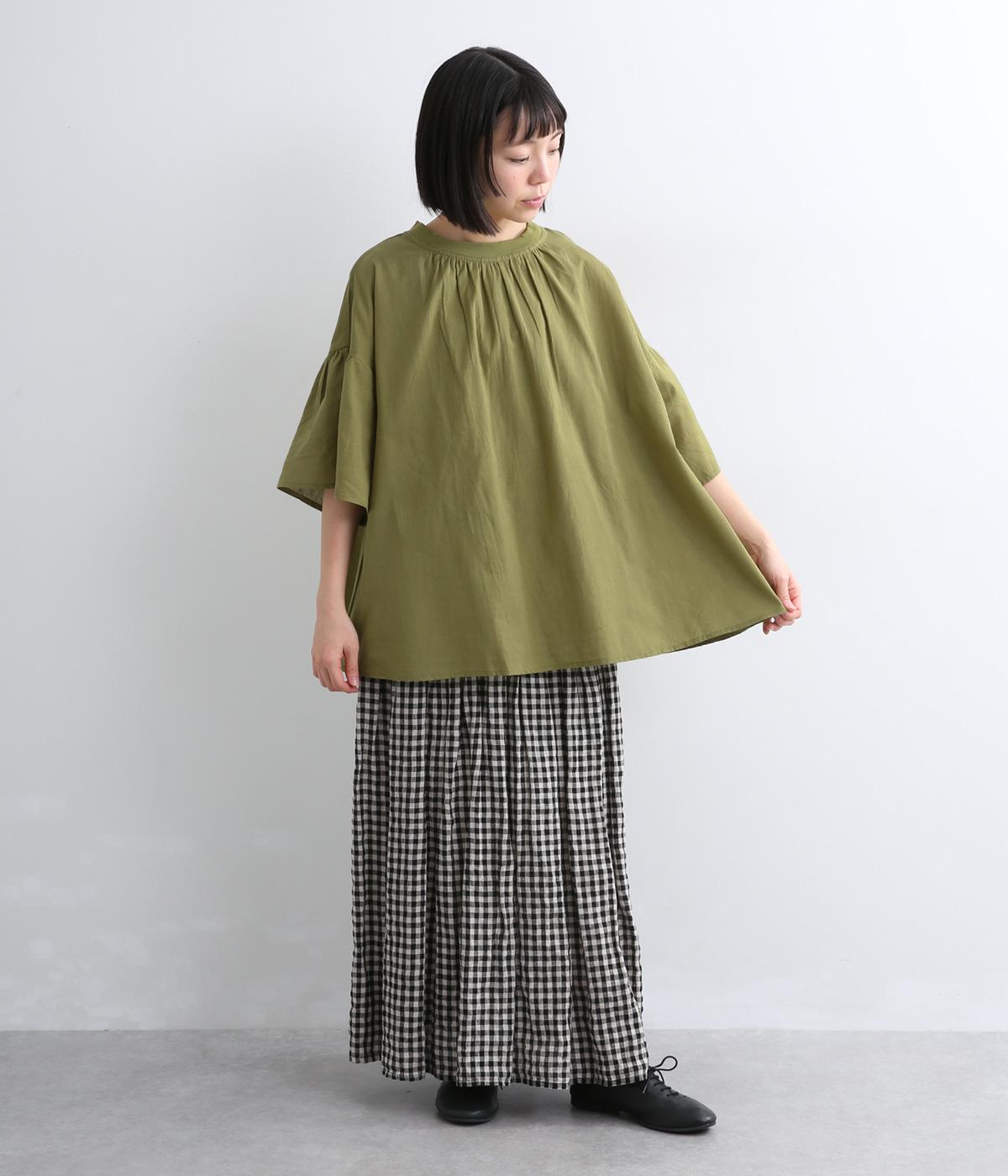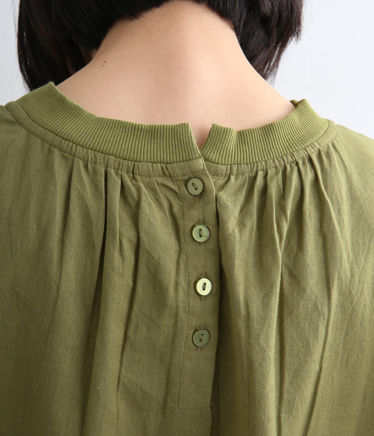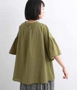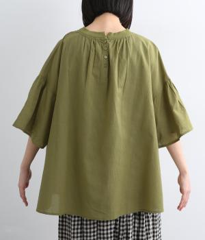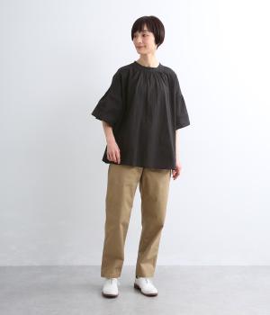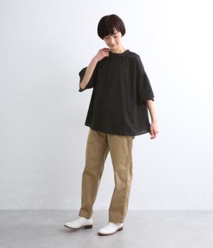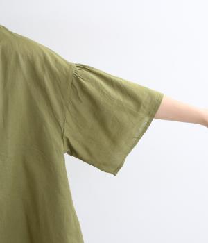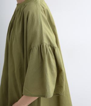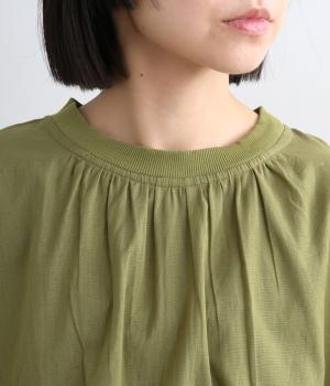 ギャザーでたっぷり生地を用いた、風に泳ぐフレアシルエットが優雅な印象を与えます。肌にまとわりつきにくく風が気持ちよく通る快適な着心地も魅力のひとつ。襟ぐりのリブが適度にカジュアルダウンさせ、後ろボタンが着脱をアシスト。
