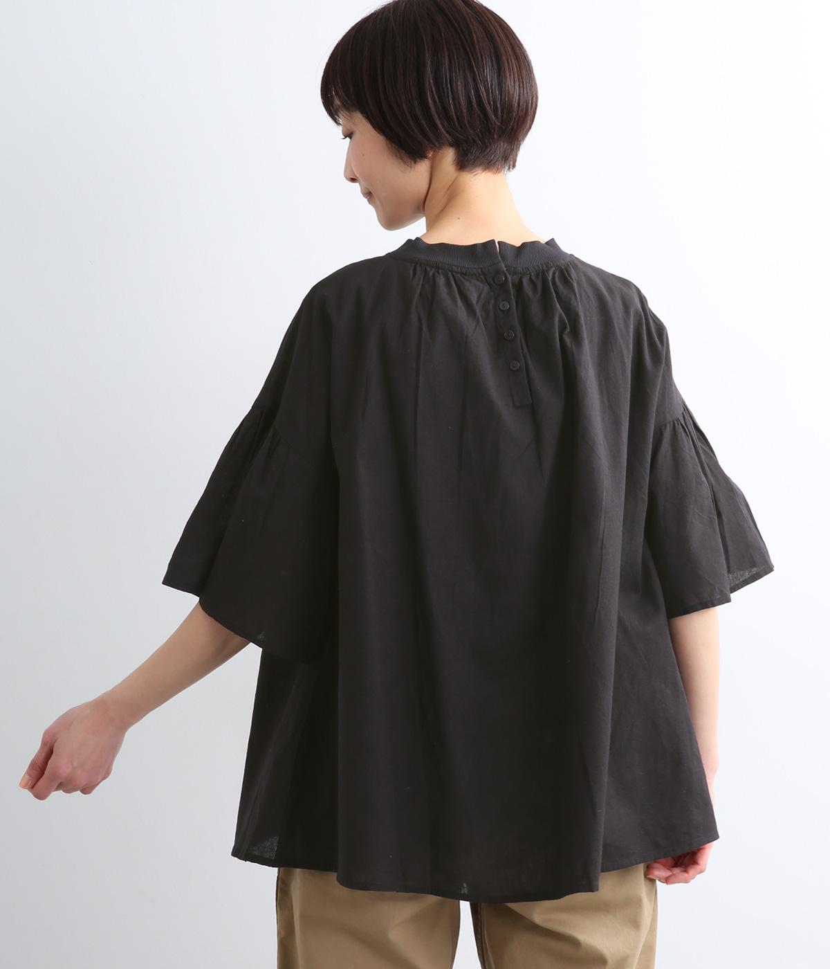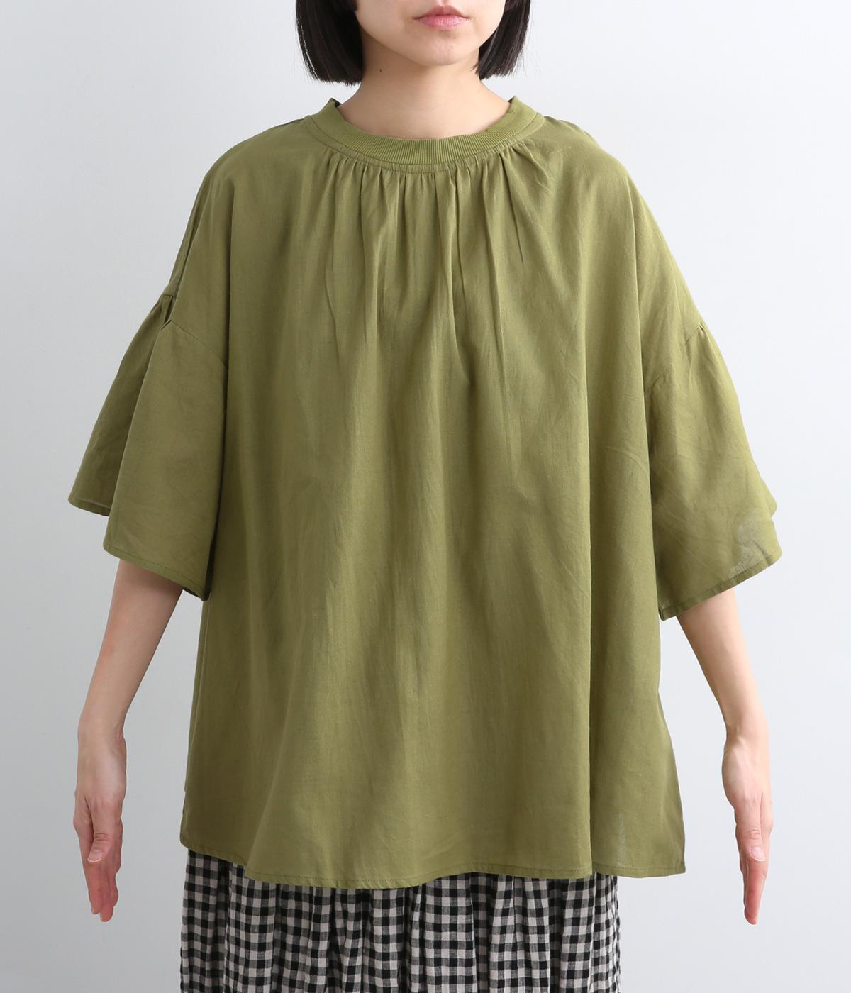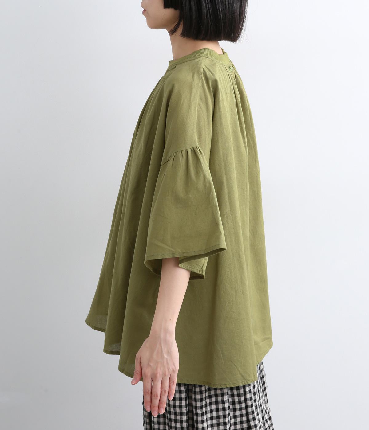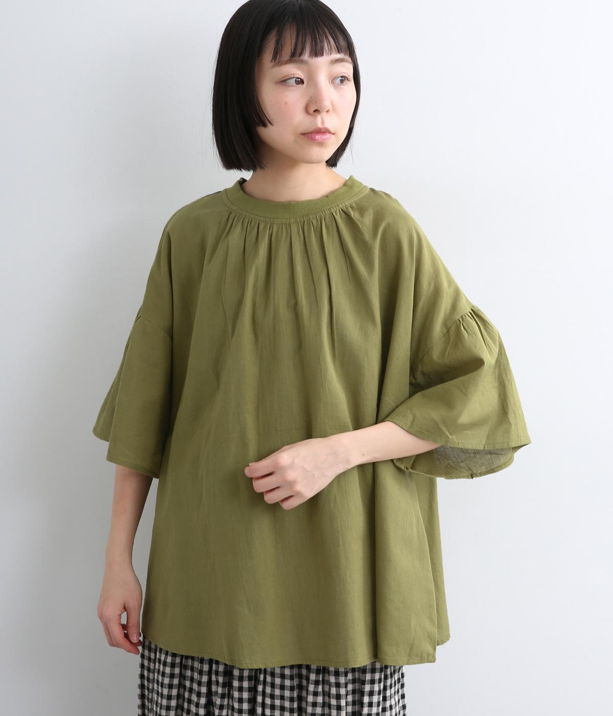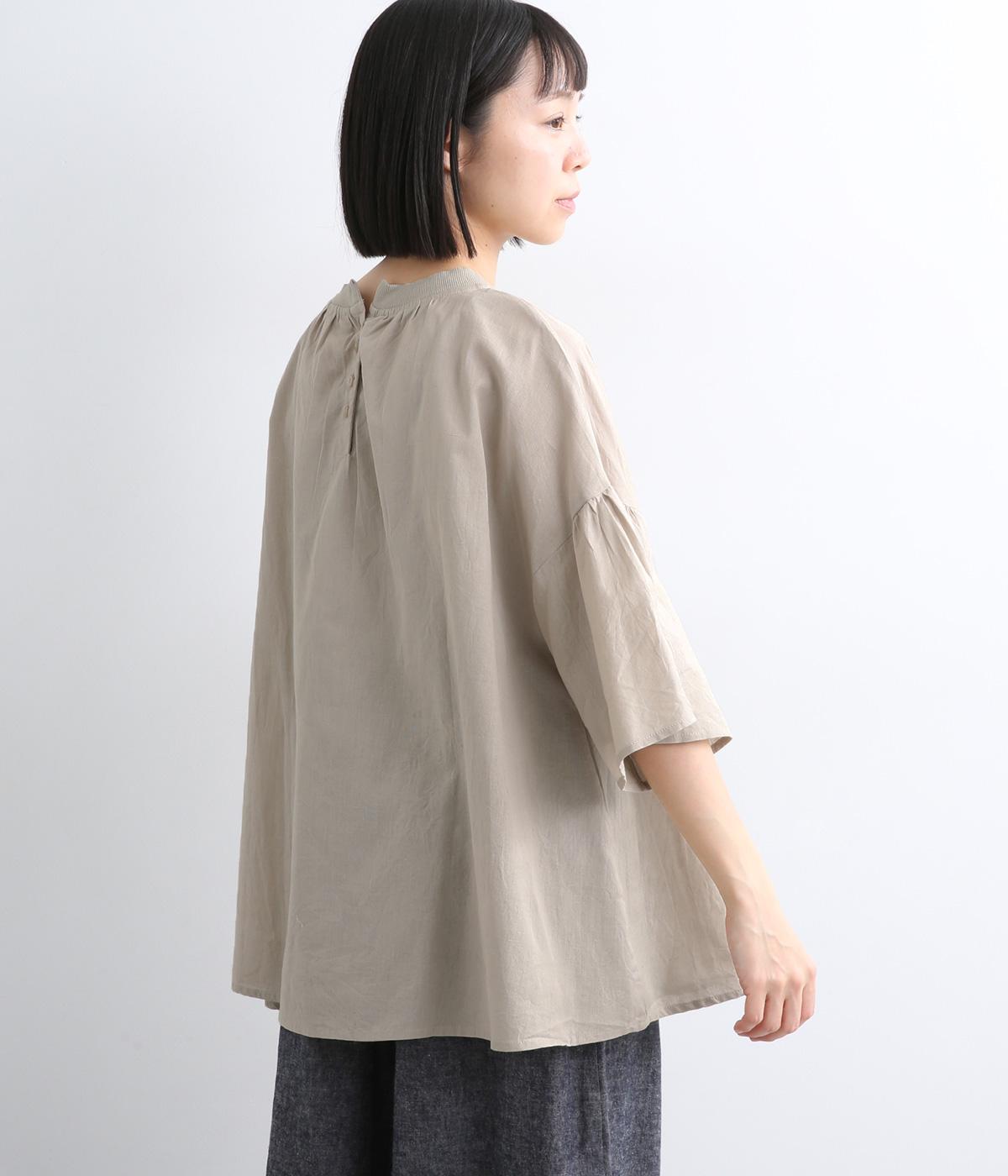 ギャザーでたっぷり生地を用いた、風に泳ぐフレアシルエットが優雅な印象を与えます。肌にまとわりつきにくく風が気持ちよく通る快適な着心地も魅力のひとつ。襟ぐりのリブが適度にカジュアルダウンさせ、後ろボタンが着脱をアシスト。