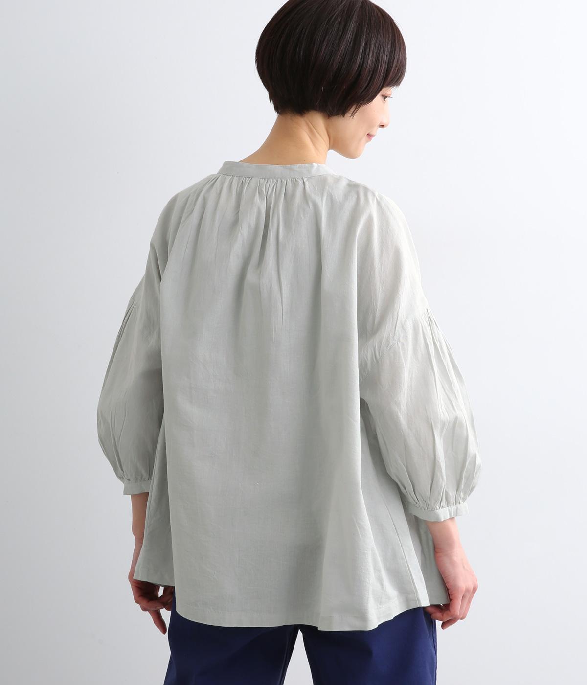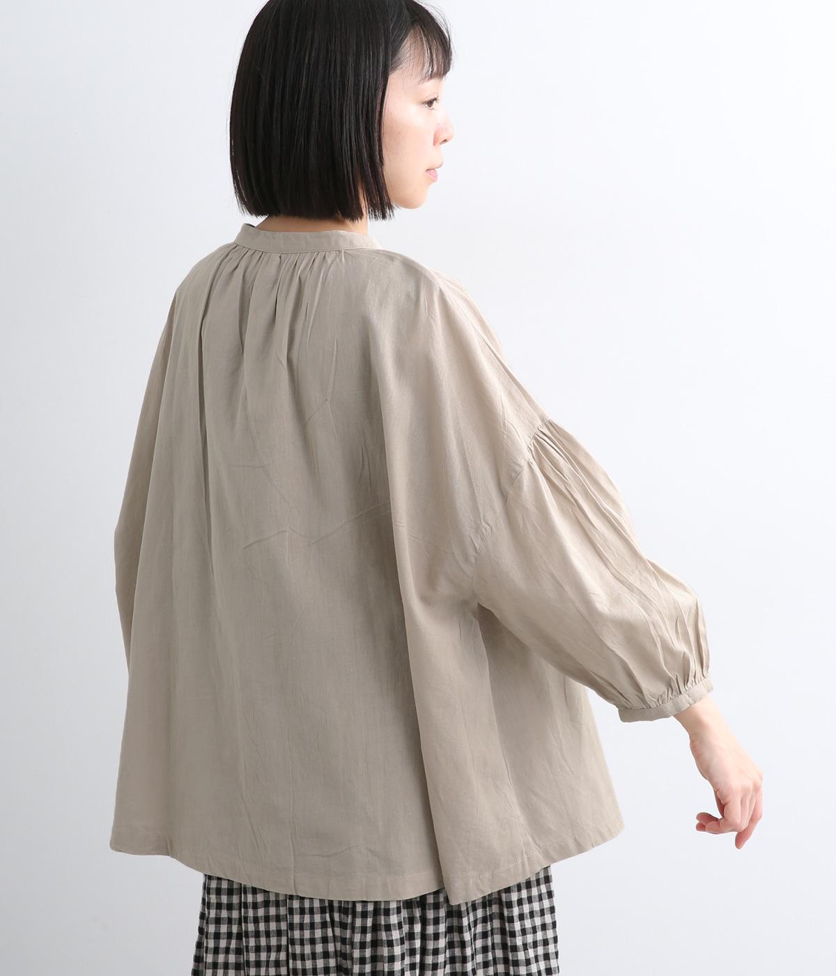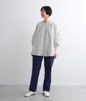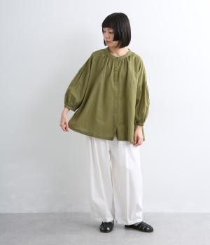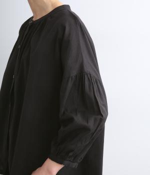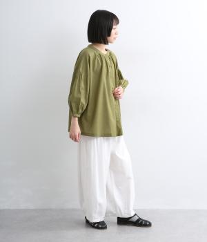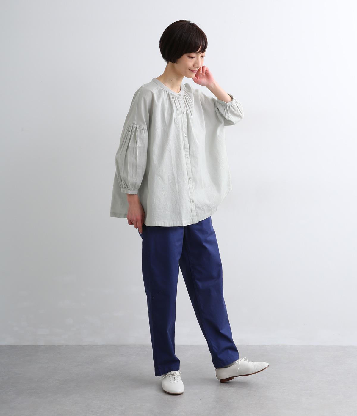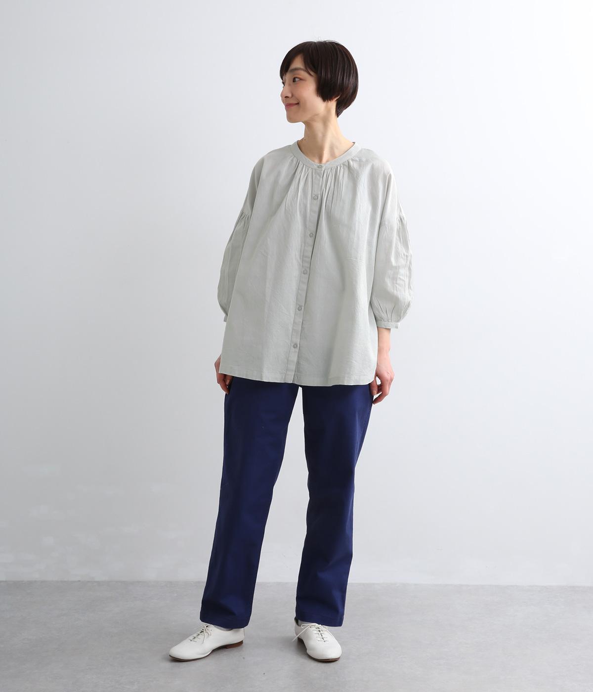 体のラインを拾いにくい、ふわりとしたディテールが特徴的なギャザープルオーバー。すっきりしたバンドカラーや手首をきれいに見せた袖丈がちょうどいい抜け感に。羽織りとしてレイヤードスタイルを楽しむのもおすすめ。