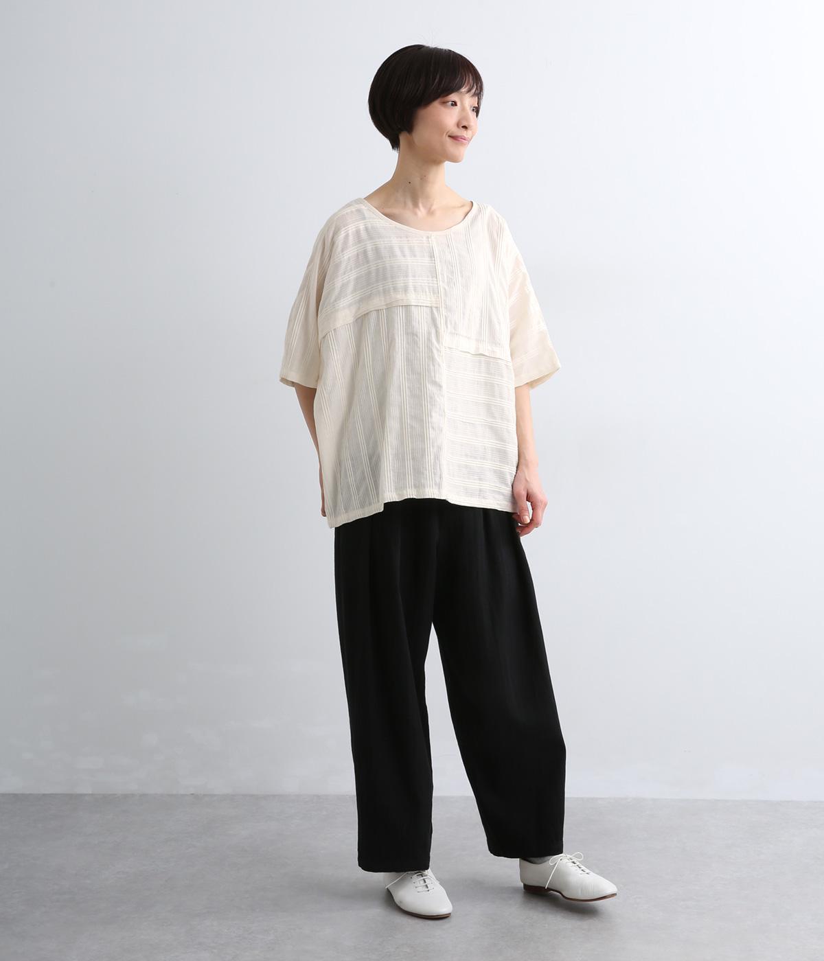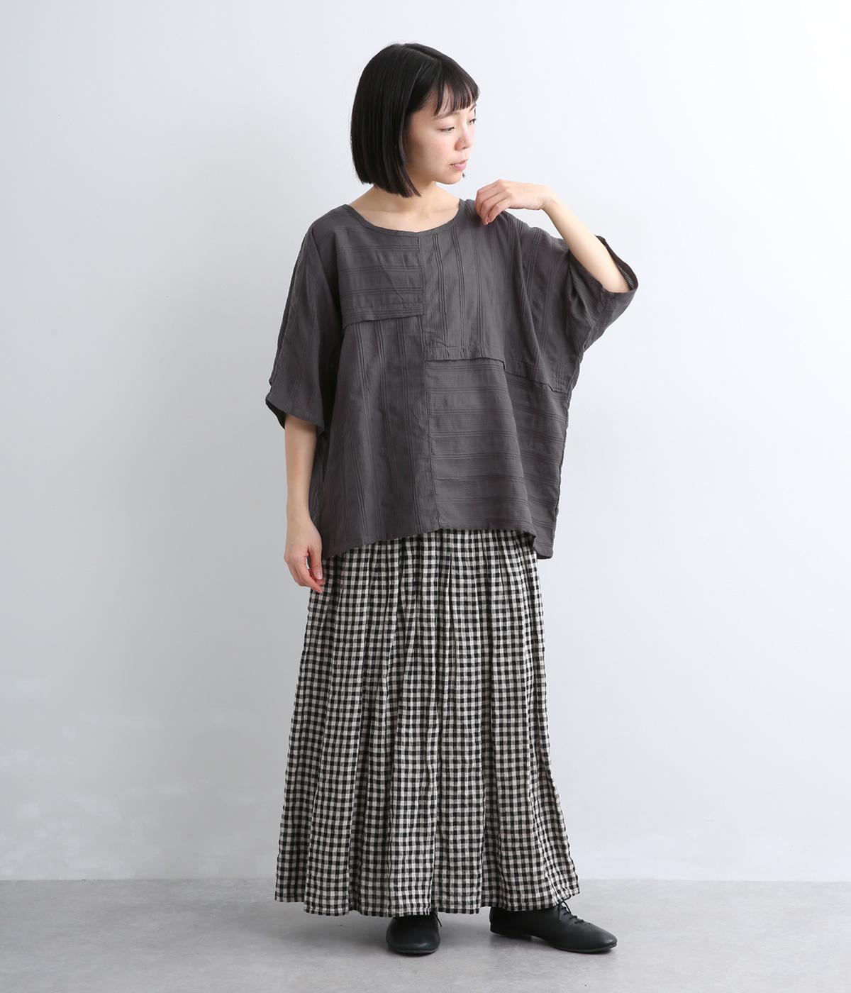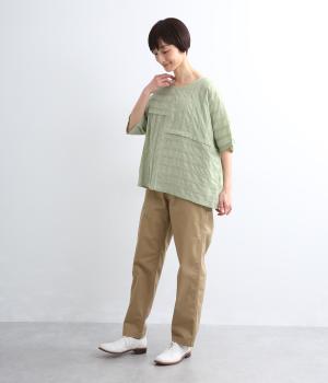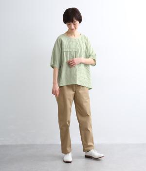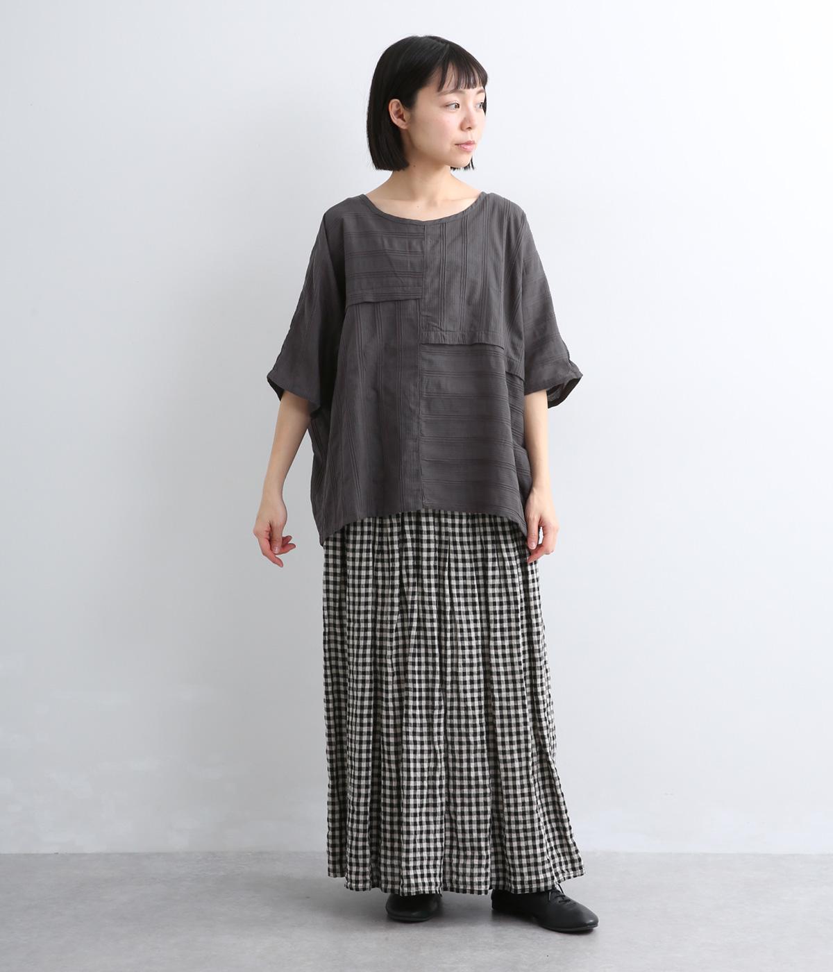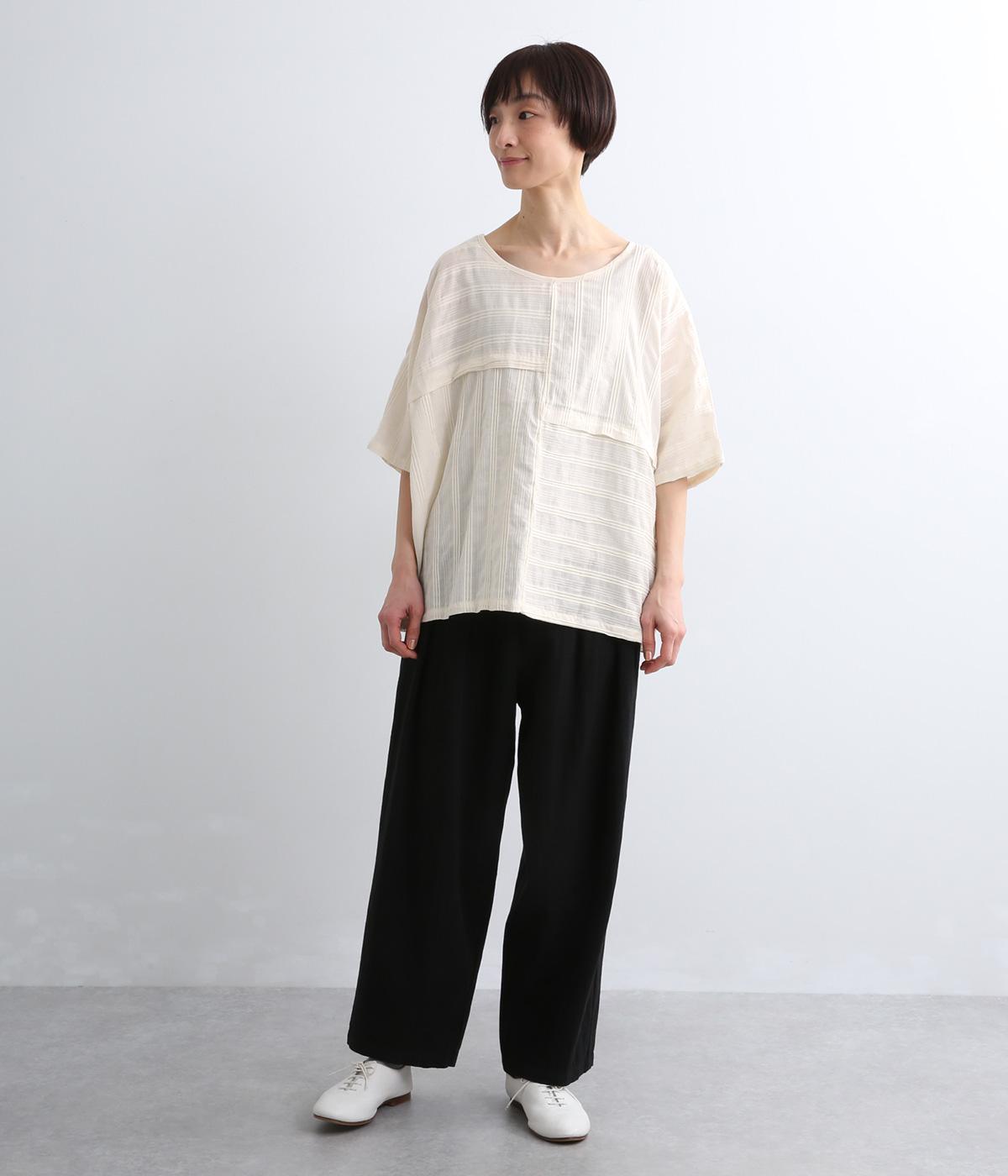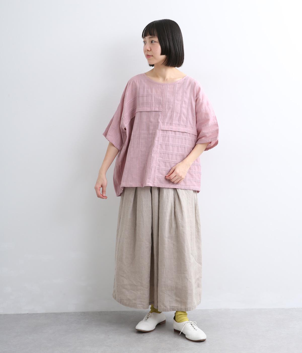 タックや切り替えでパッチワークのように変化をつけました。ゆったりとしたオーバーシルエットが気持ちよく、風通しのいいさわやかな一面も。淡い色合いもマッチしていて、デザインで主張しながらも品のいい印象に。