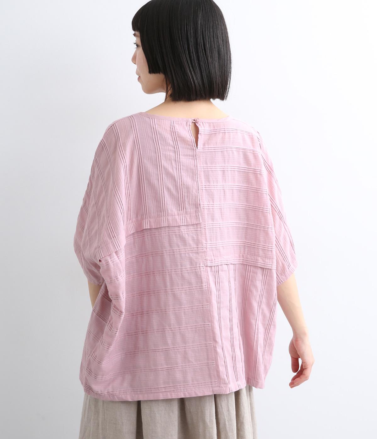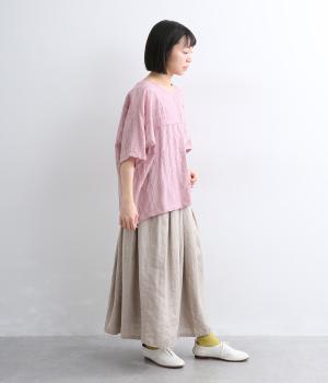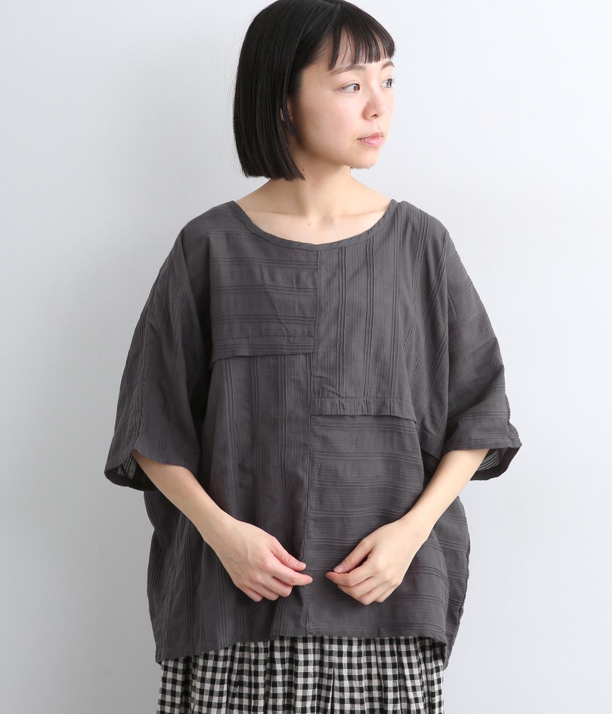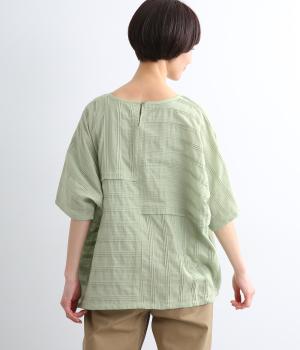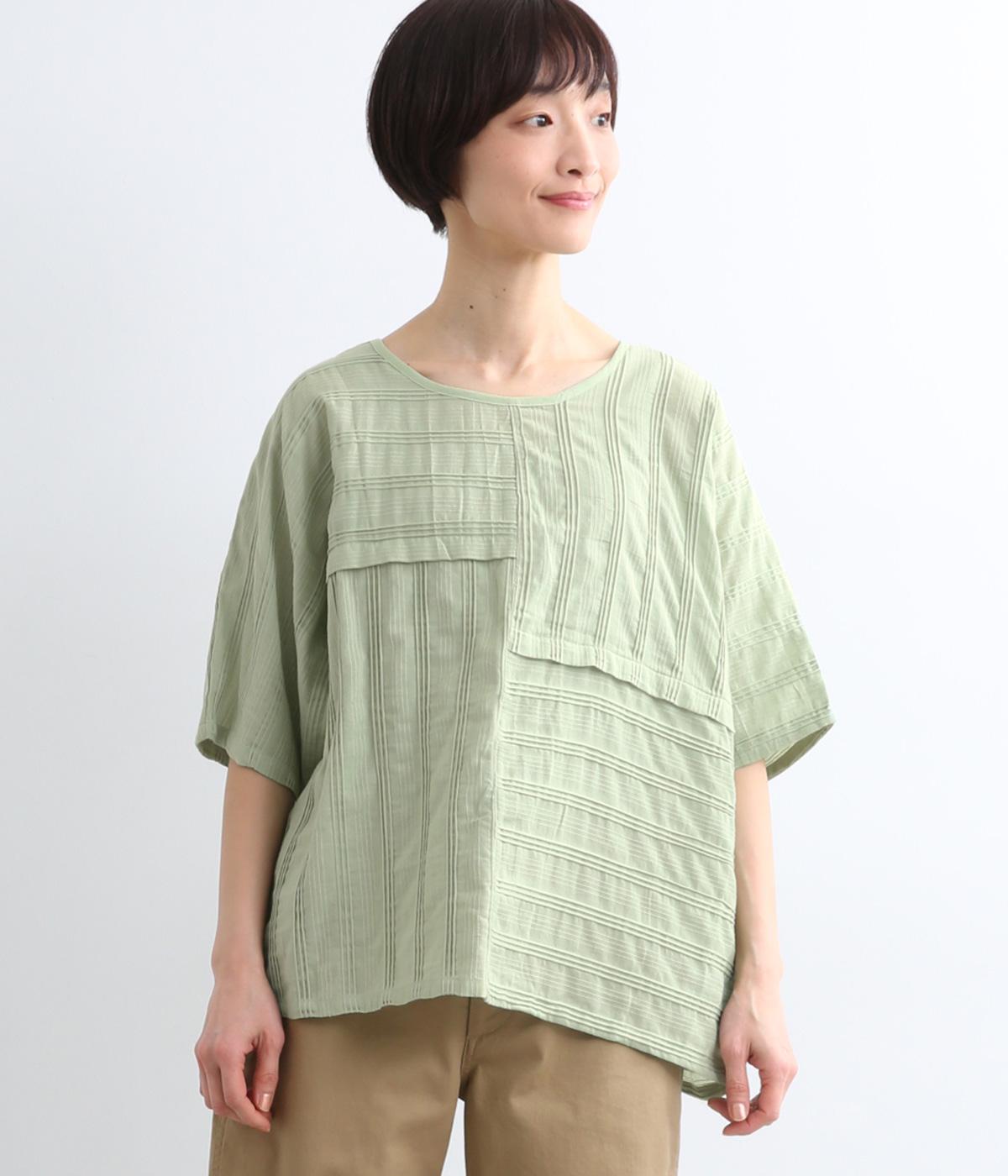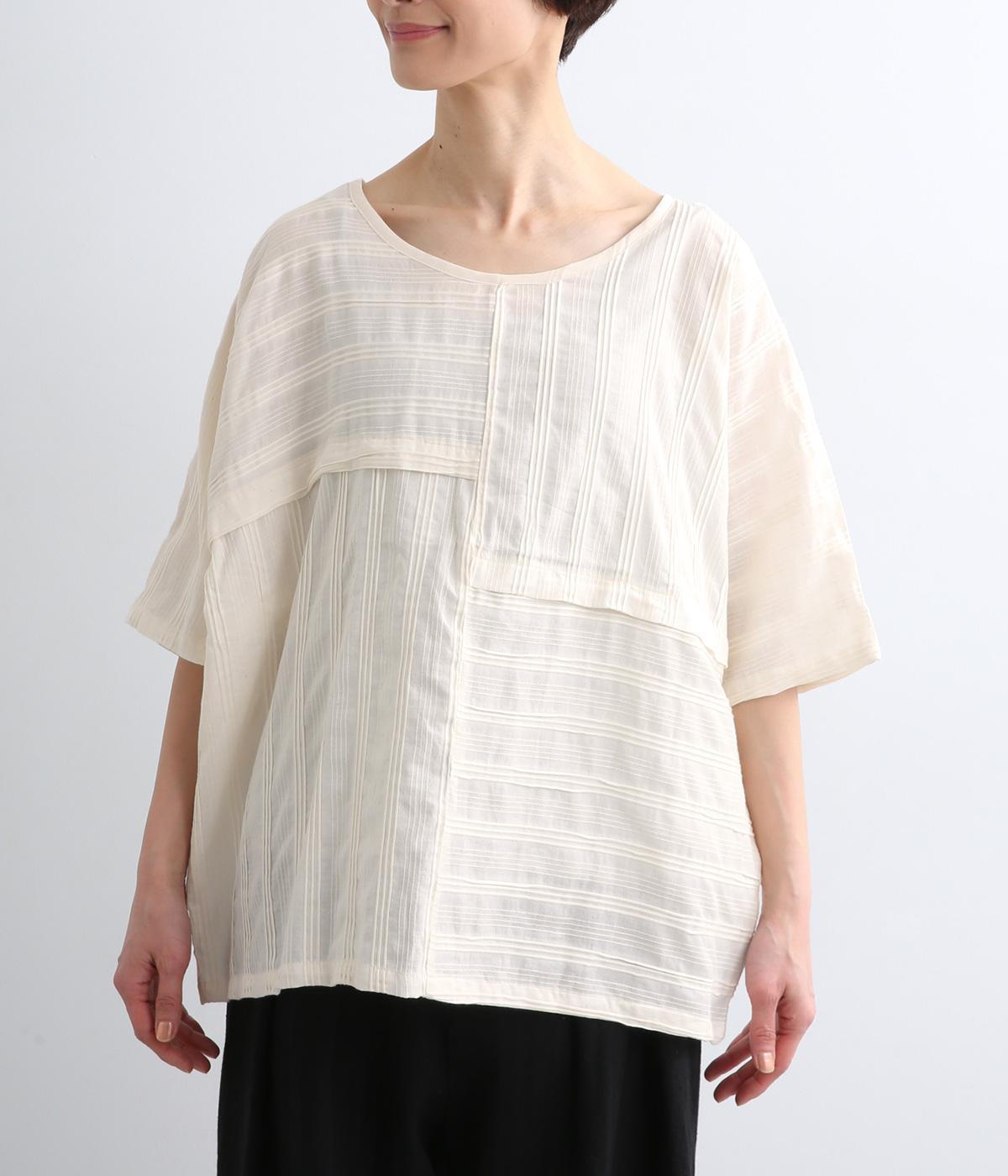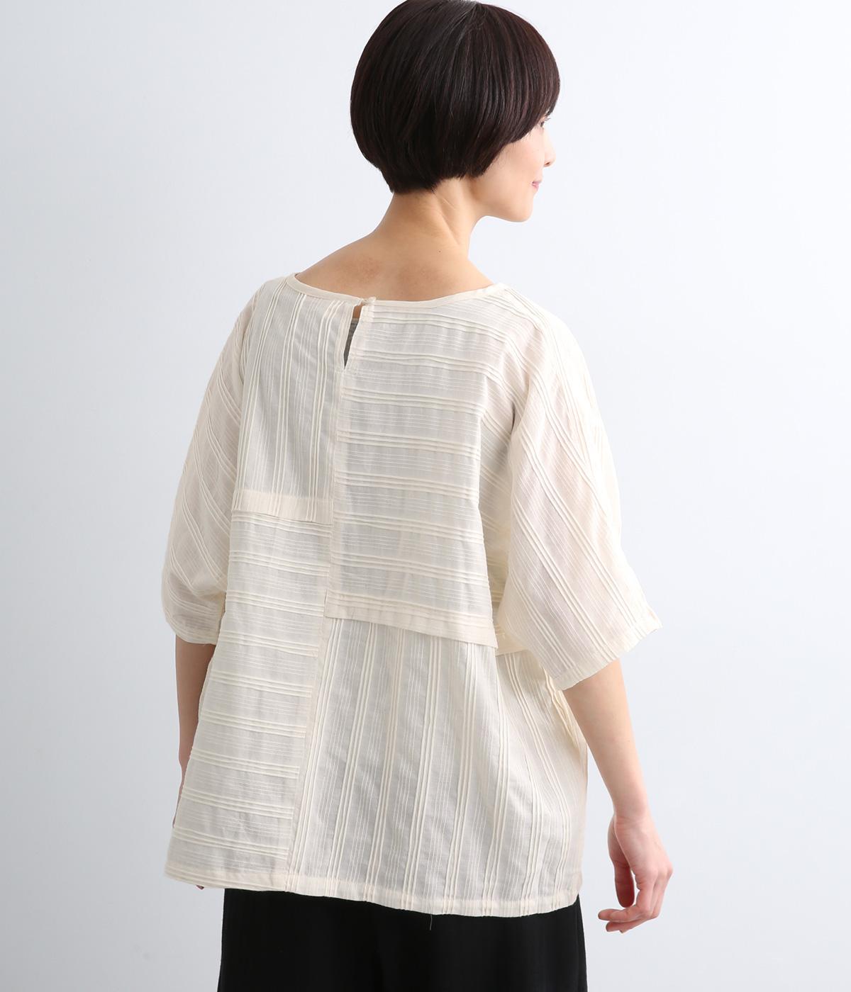 タックや切り替えでパッチワークのように変化をつけました。ゆったりとしたオーバーシルエットが気持ちよく、風通しのいいさわやかな一面も。淡い色合いもマッチしていて、デザインで主張しながらも品のいい印象に。