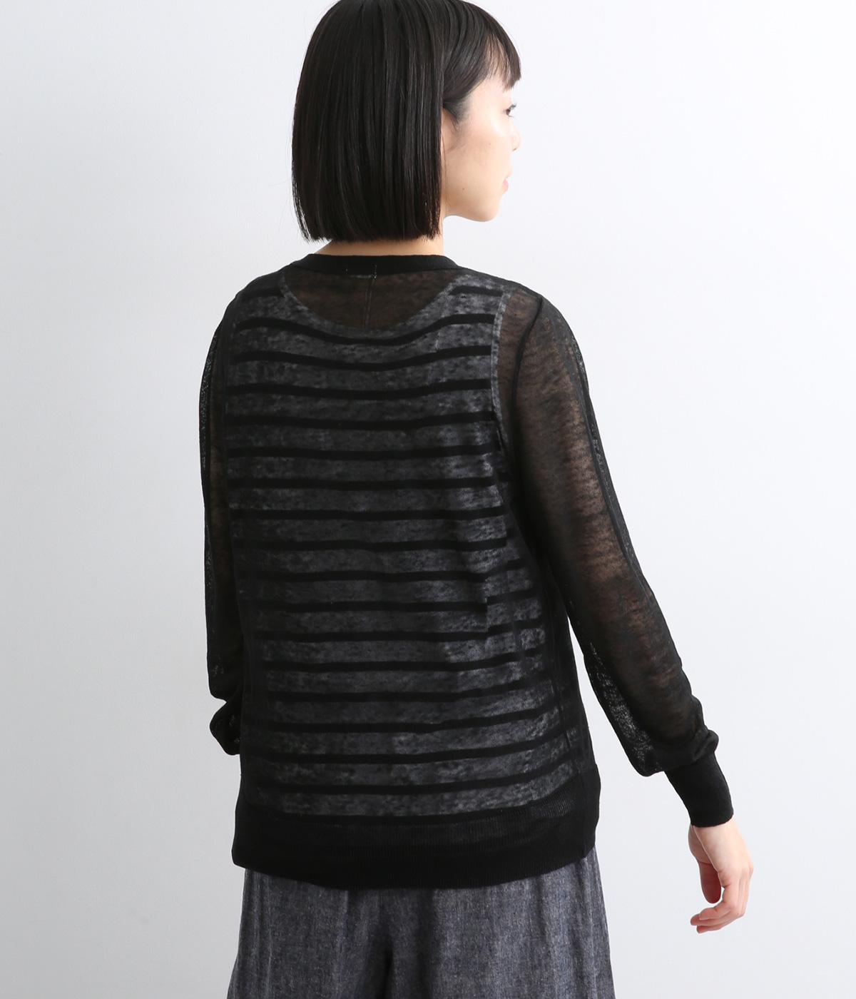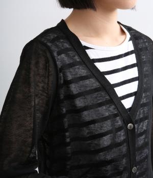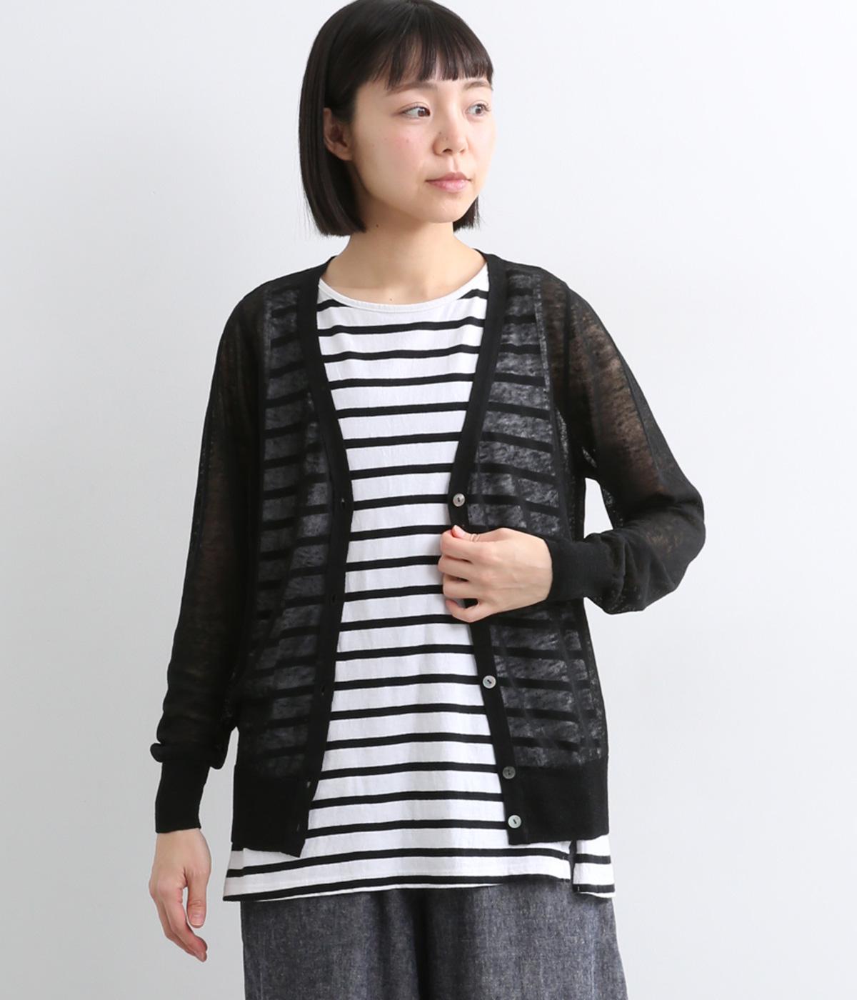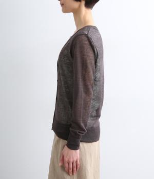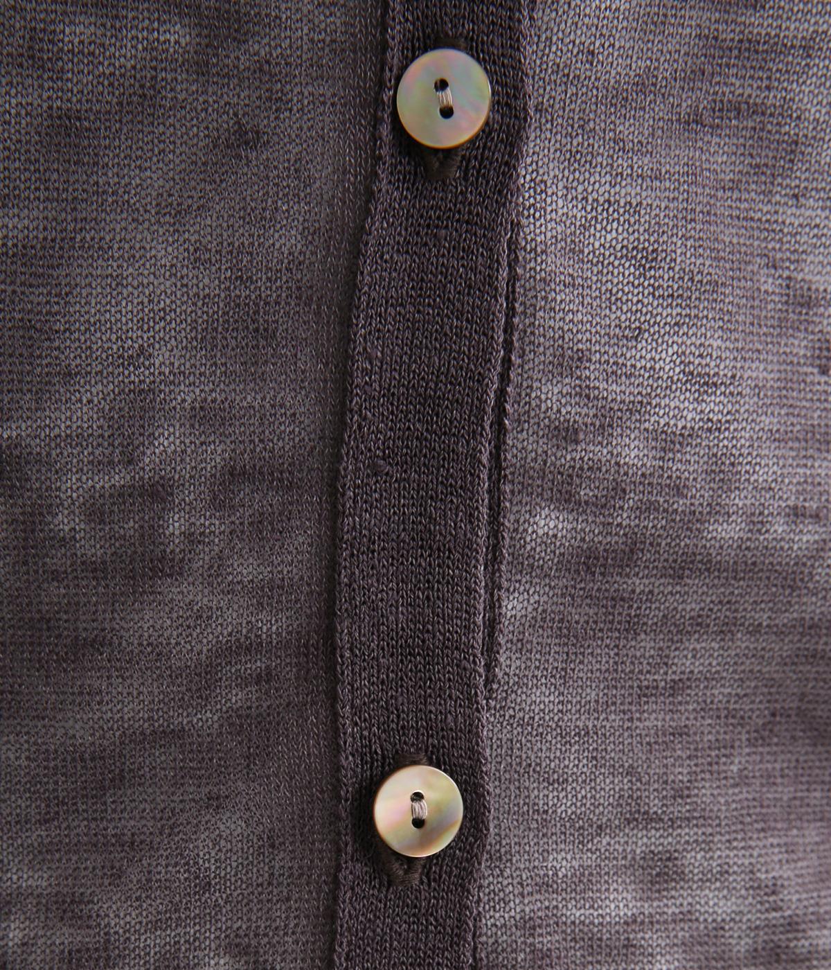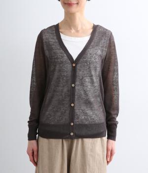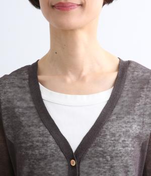 ベーシックなデザインでさまざまな着こなしに合わせやすく、上品な印象を与える一枚。シアーな素材はレイヤードしても軽やかさを保ち、シワも気になりにくいので夏場の冷房対策として持ち歩くのにも最適。きらめくシェルボタンがさり気ないアクセントに。