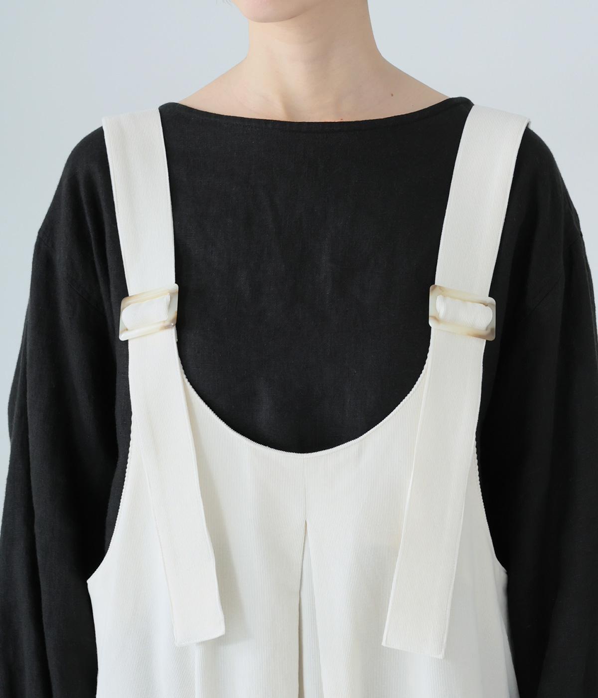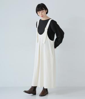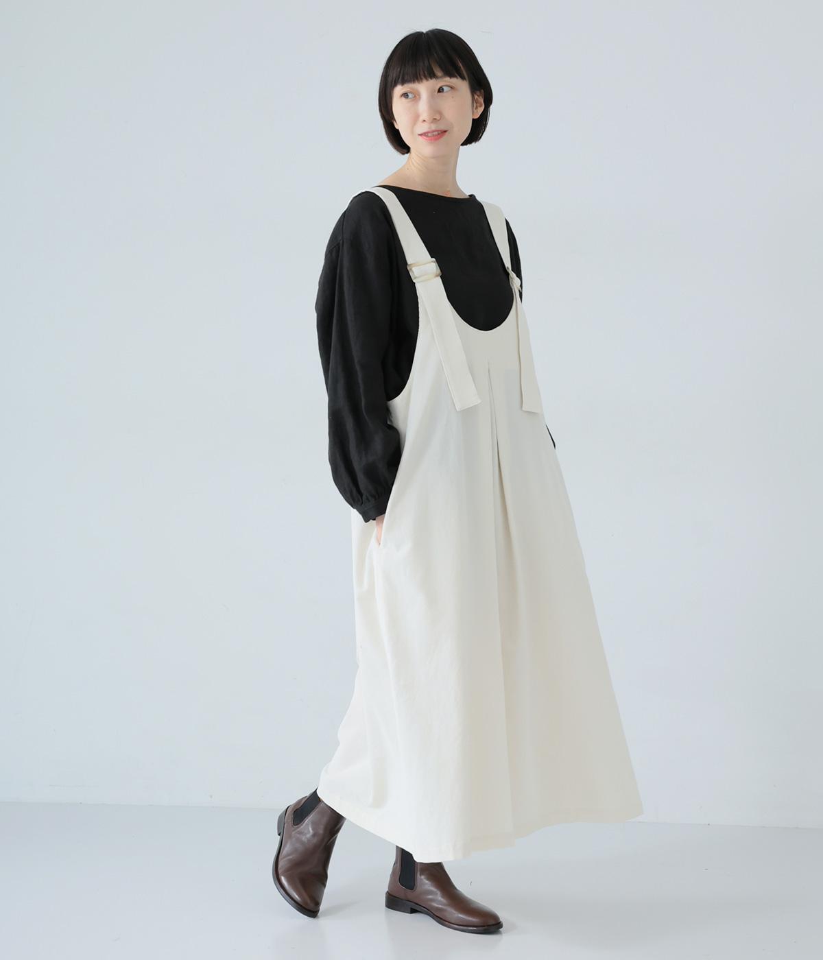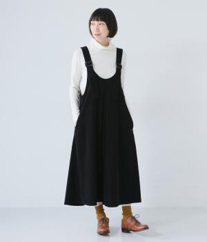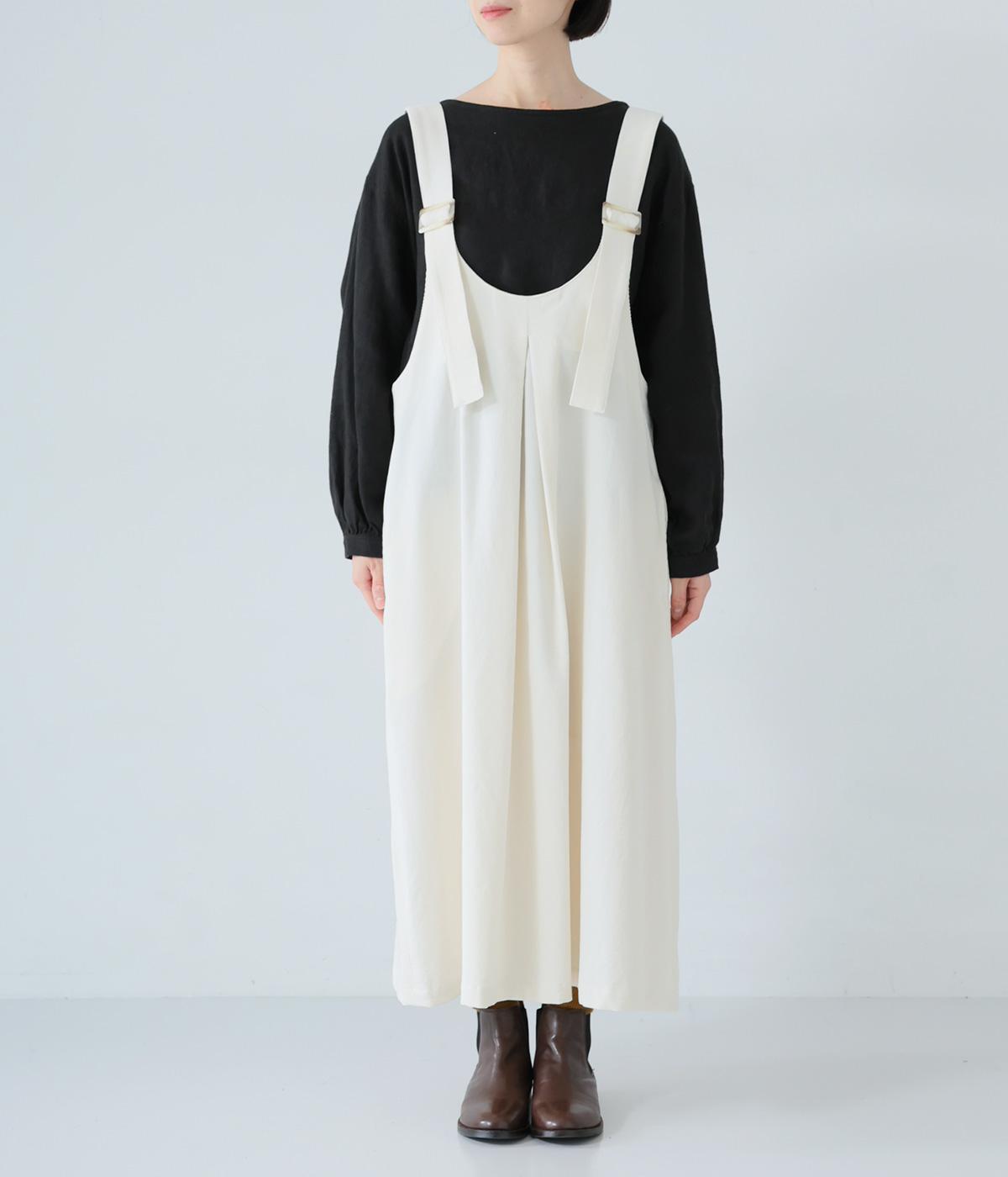 合わせるインナー次第で着こなしの幅が広がるジャンパースカート。前後にタックを入れてゆとりを持たせつつ、落ち感のある生地がボリュームをおさえてすっきりと着こなせます。フロントのバックルでショルダー紐の長さを自在に調整可能です。
