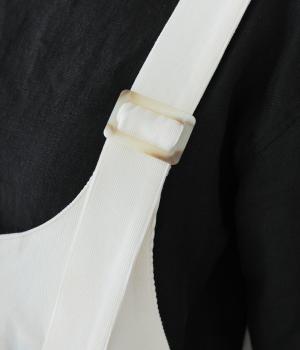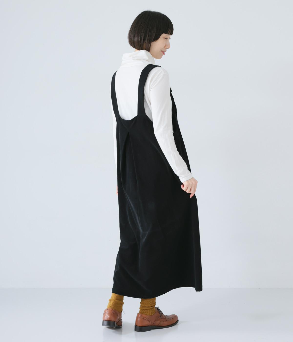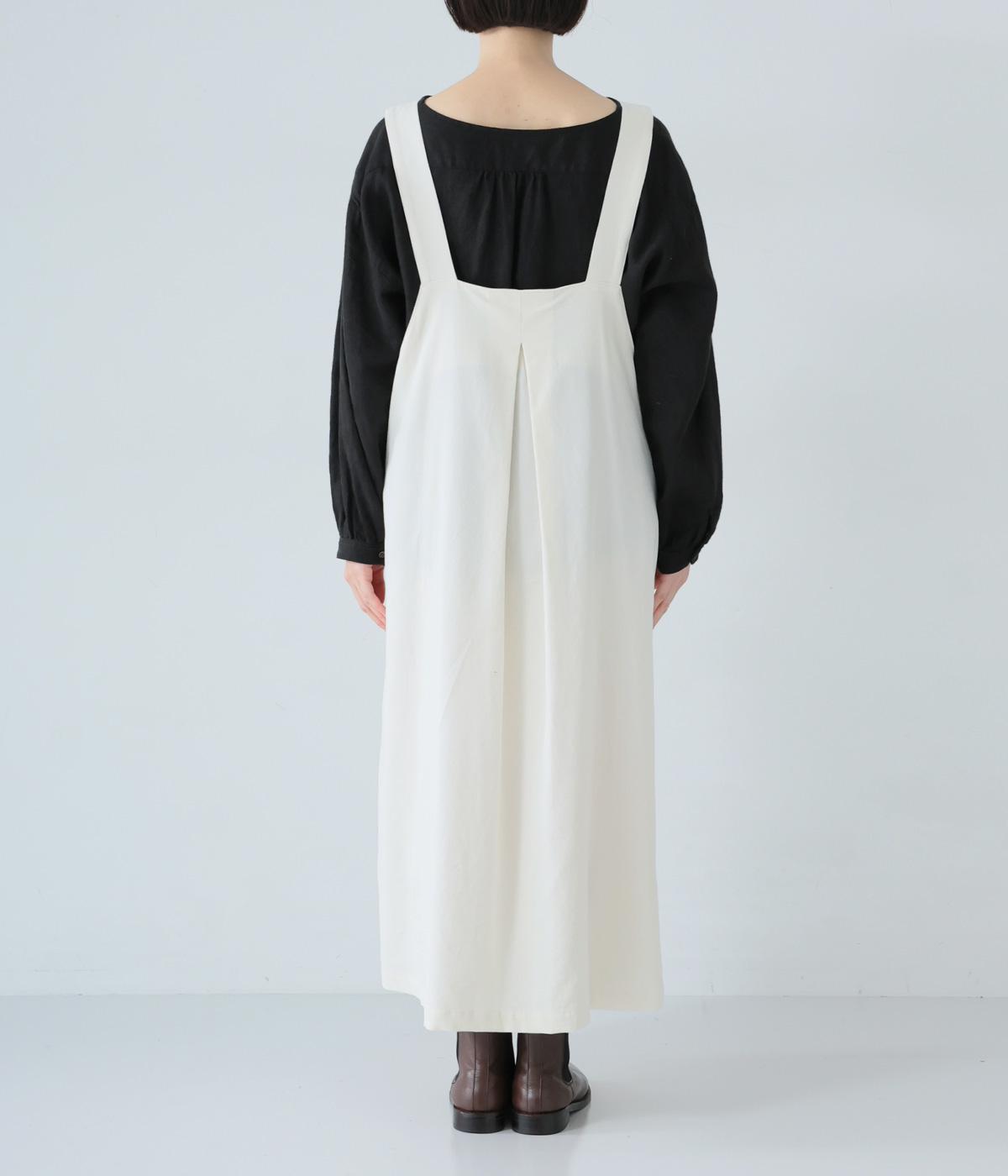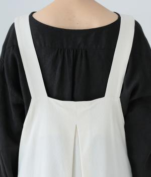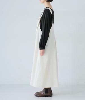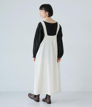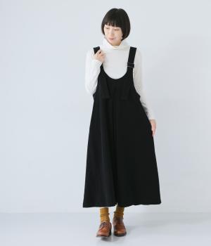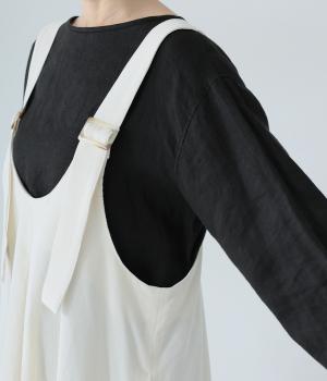 合わせるインナー次第で着こなしの幅が広がるジャンパースカート。前後にタックを入れてゆとりを持たせつつ、落ち感のある生地がボリュームをおさえてすっきりと着こなせます。フロントのバックルでショルダー紐の長さを自在に調整可能です。