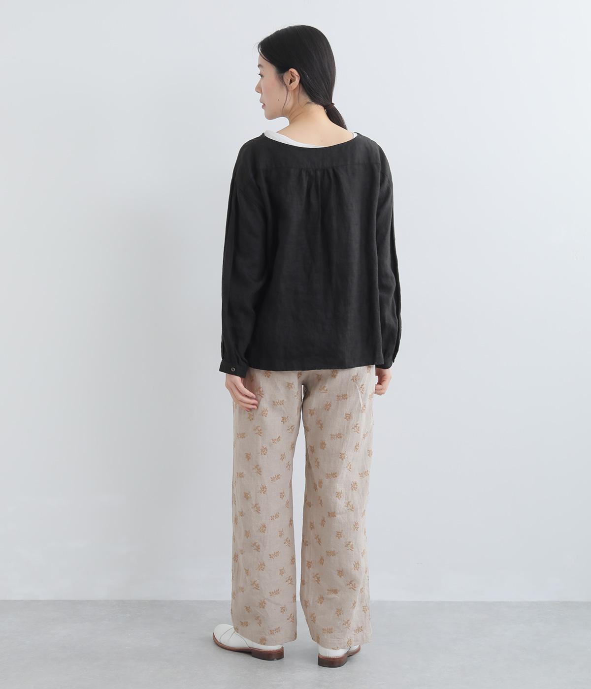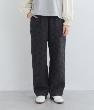 全体にオリーブ柄の刺繍をあしらった上品な印象のパンツ。太すぎず細すぎないほどよい幅のストレートパンツで、イージーな穿き心地です。ウエストは総ゴム仕様で内紐つきです。