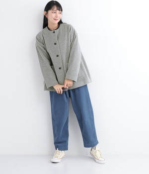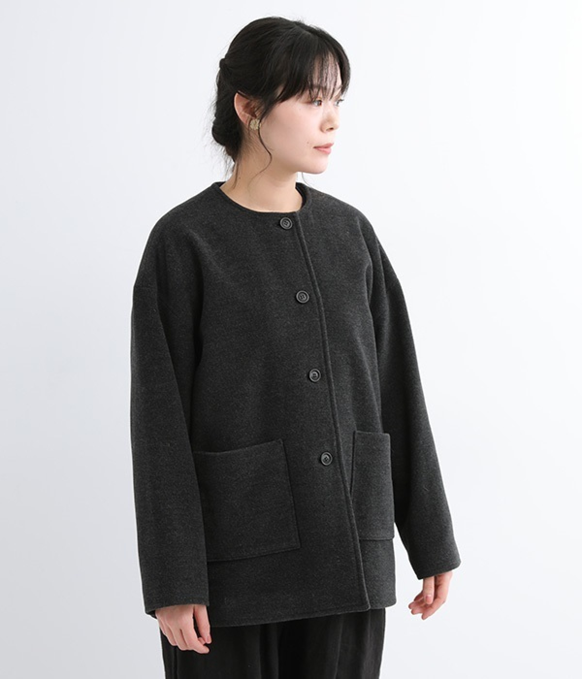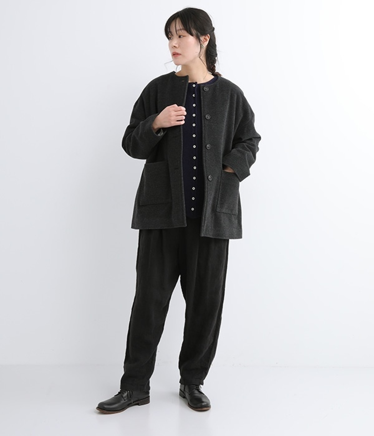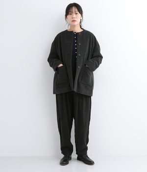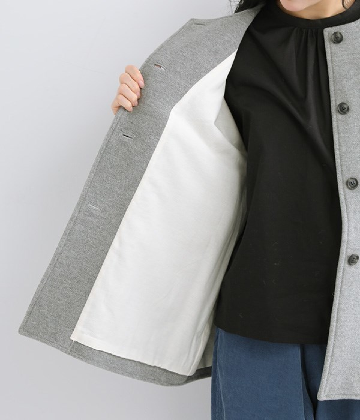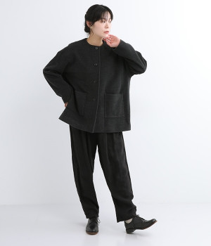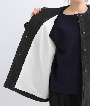 しっかりとしたスエードのような、なめらかな肌触りがとても心地よいジャケットです。軽くあたたかみのあるアンゴラ混素材で仕立てました。やわらかな肌あたりのコットン裏地もセットして、着脱もスムーズに。襟高のインナーや巻きものでアクセントをつけやすいノーカラーデザインです。