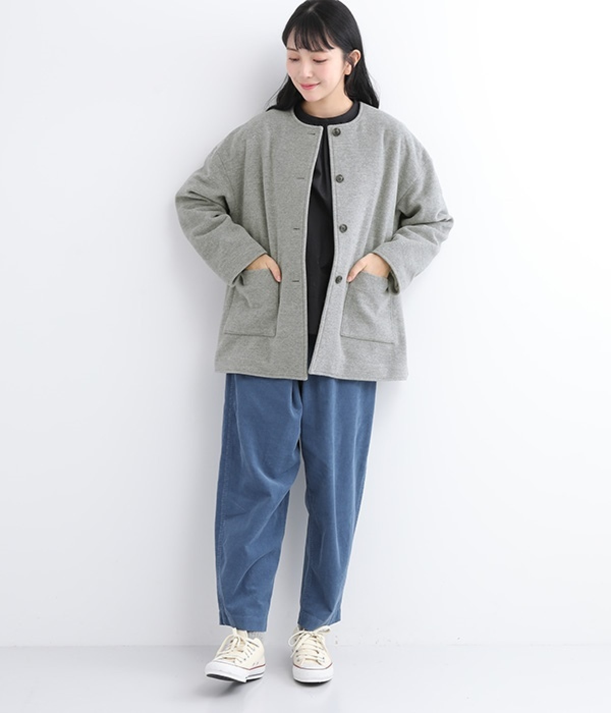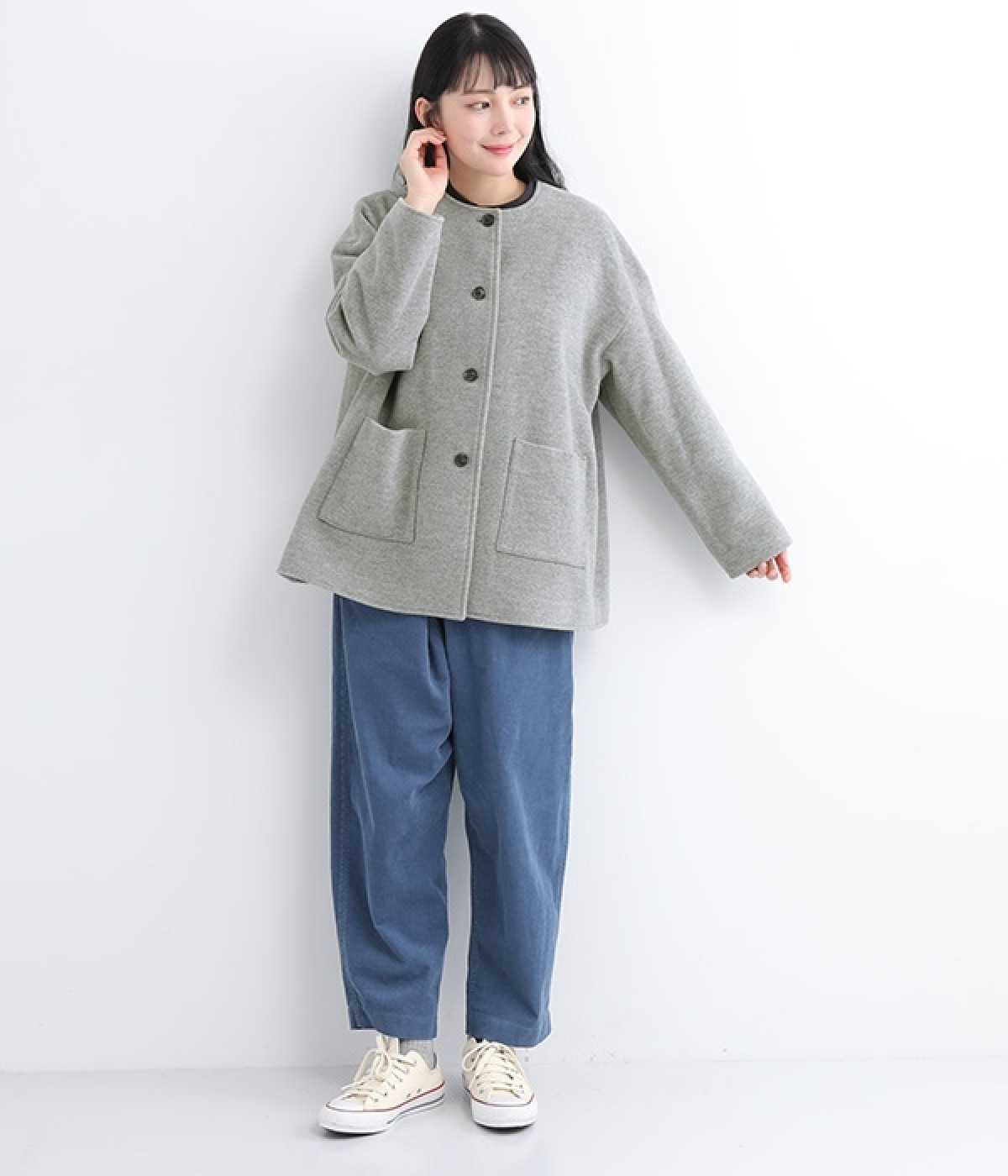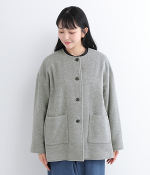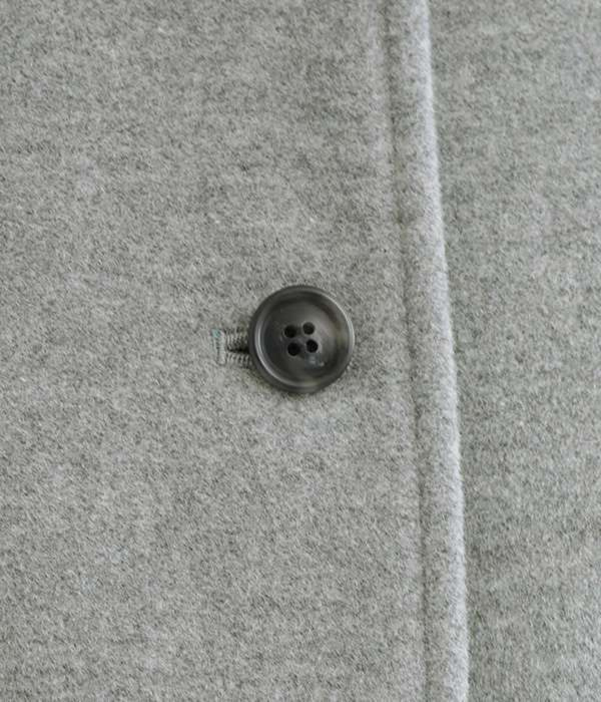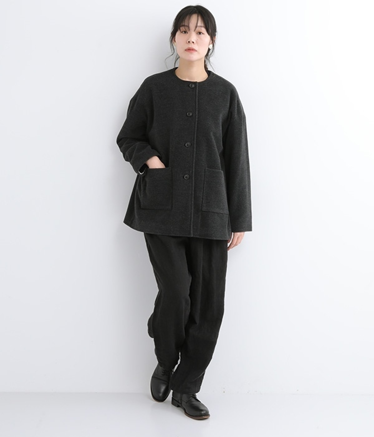 しっかりとしたスエードのような、なめらかな肌触りがとても心地よいジャケットです。軽くあたたかみのあるアンゴラ混素材で仕立てました。やわらかな肌あたりのコットン裏地もセットして、着脱もスムーズに。襟高のインナーや巻きものでアクセントをつけやすいノーカラーデザインです。