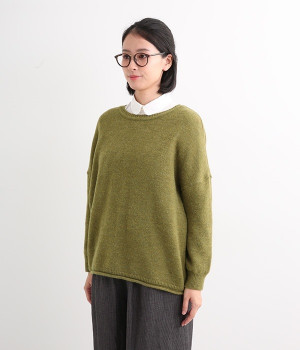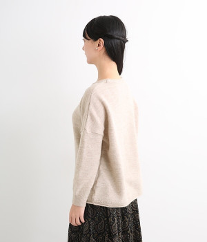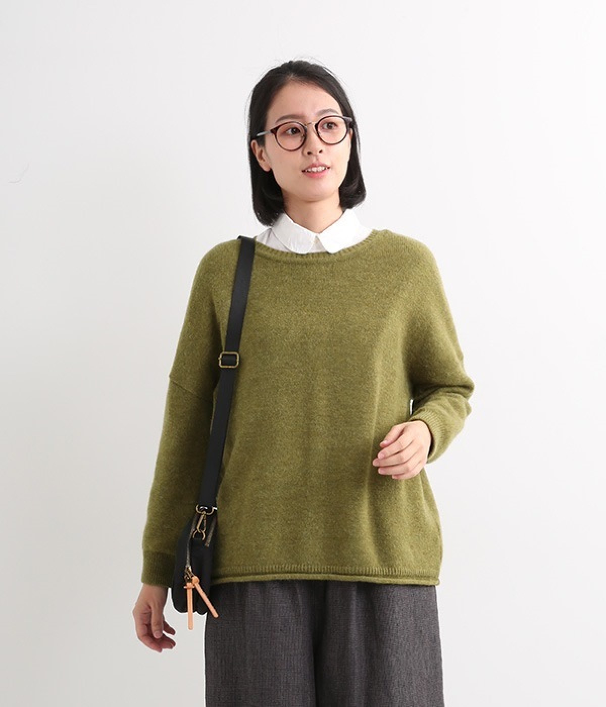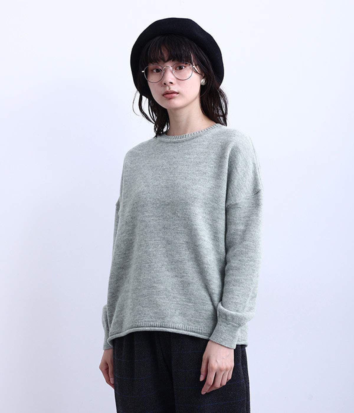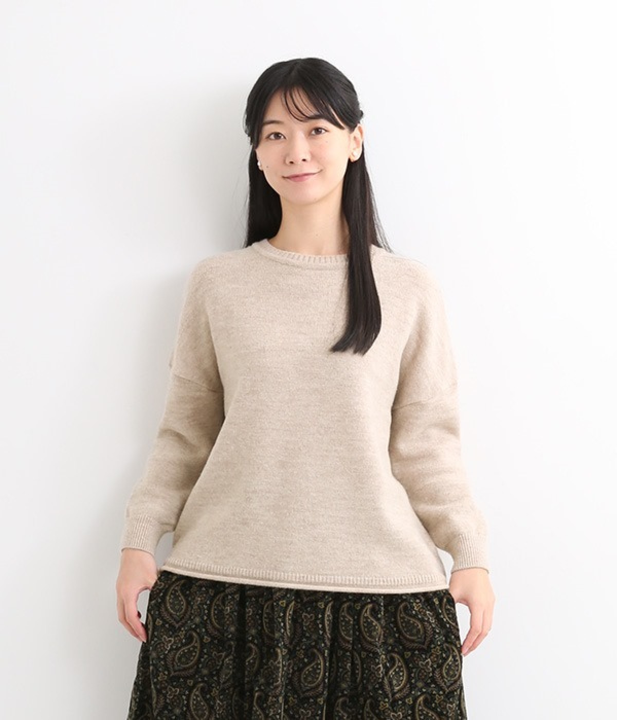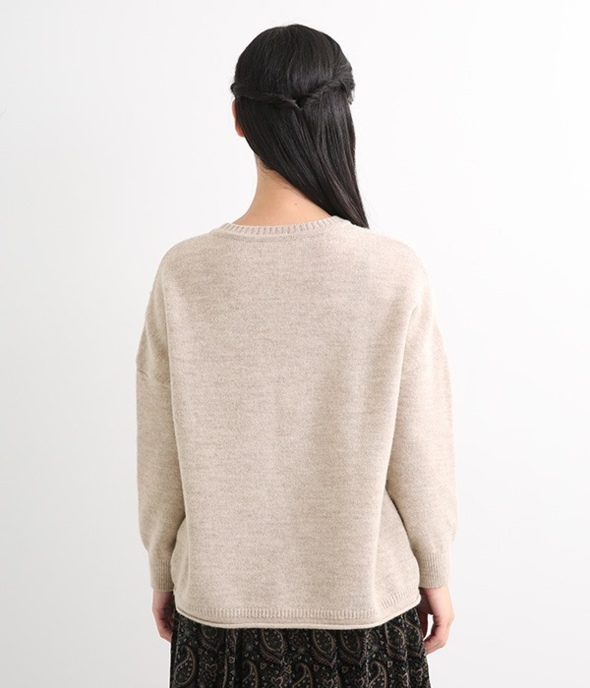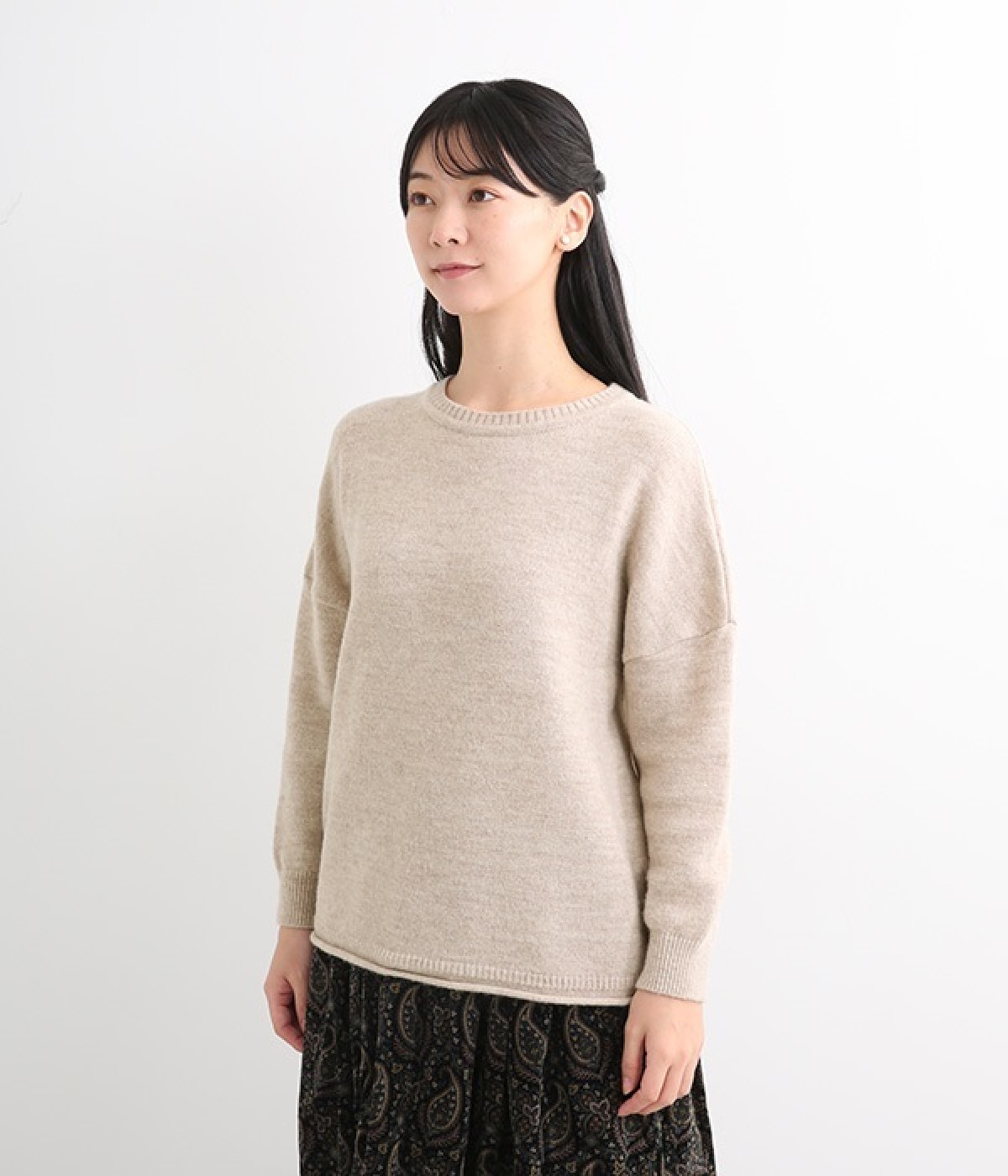 ベビーアルパカとウールをミックスした上質な素材を使用。やわらかくふんわりとした肌触りが気持ちいいニットプルオーバーです。シャツやカットソーなどのインナーを合わせやすく、一枚で着てもきれいに見えるよう、襟ぐりの開きにこだわったデザイン。着心地のよさはもちろん、ボリュームのあるボトムにもバランスのいいシルエットに仕上げました。ロールした裾がナチュラルな雰囲気を漂わせます。