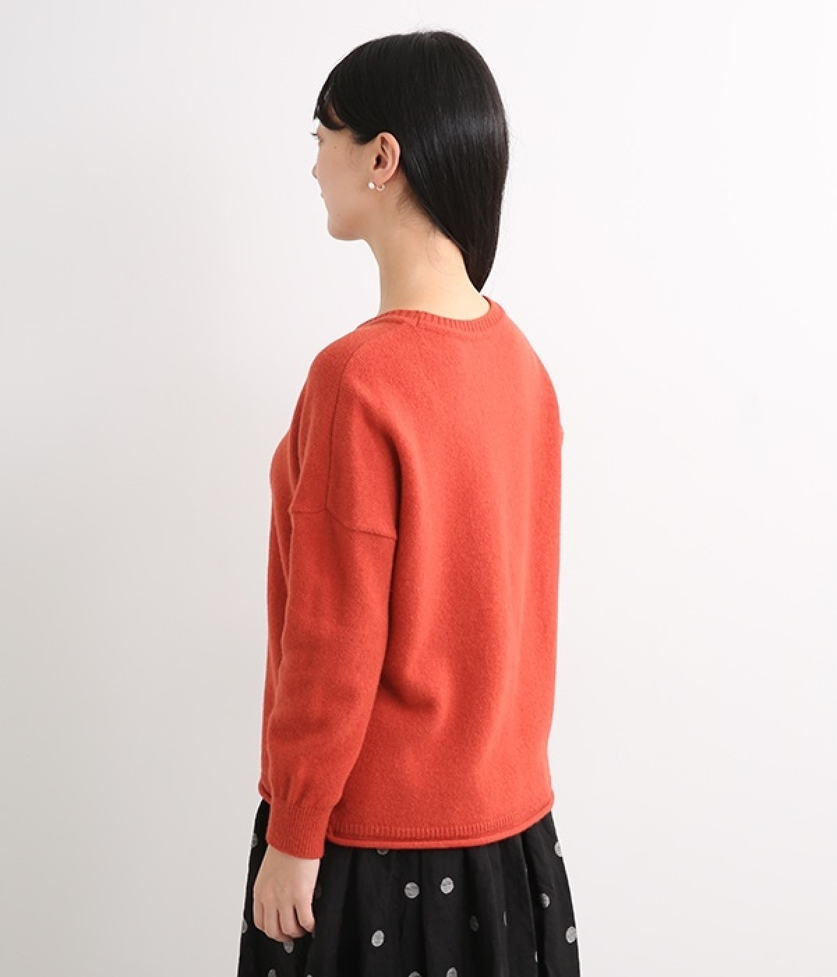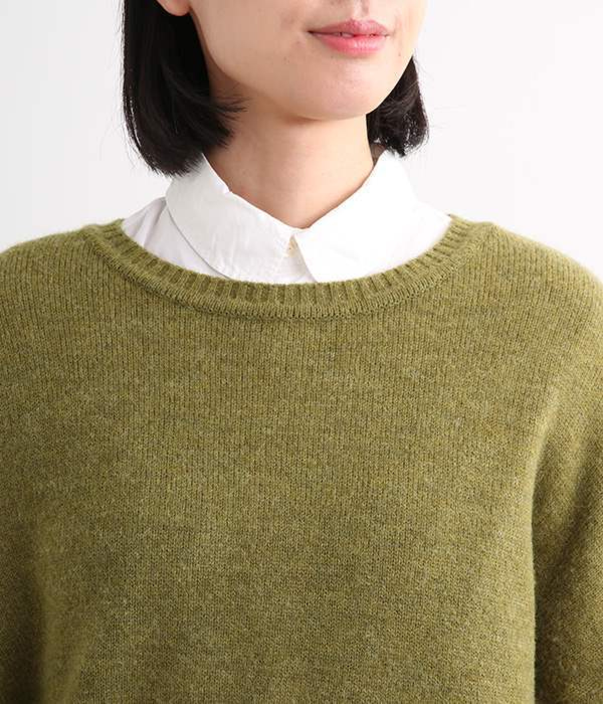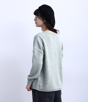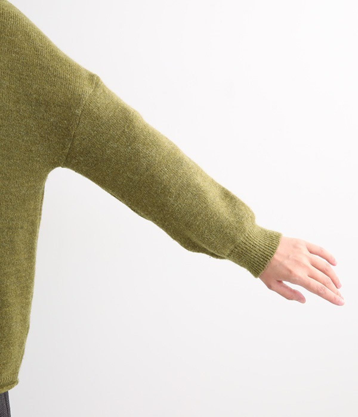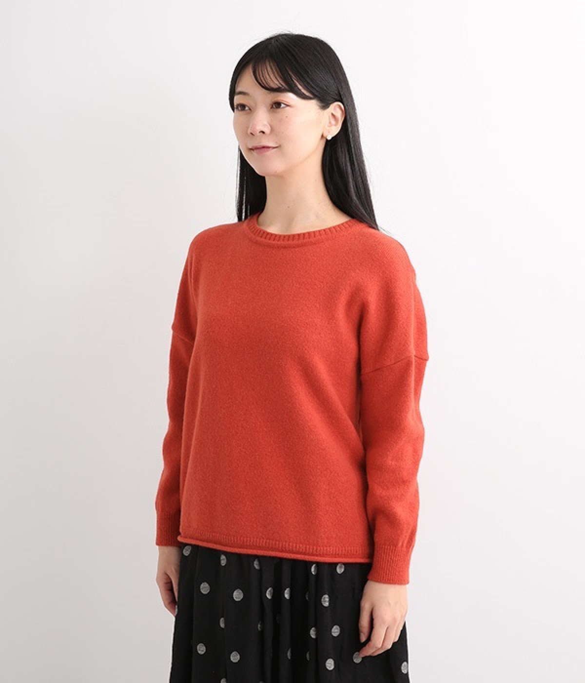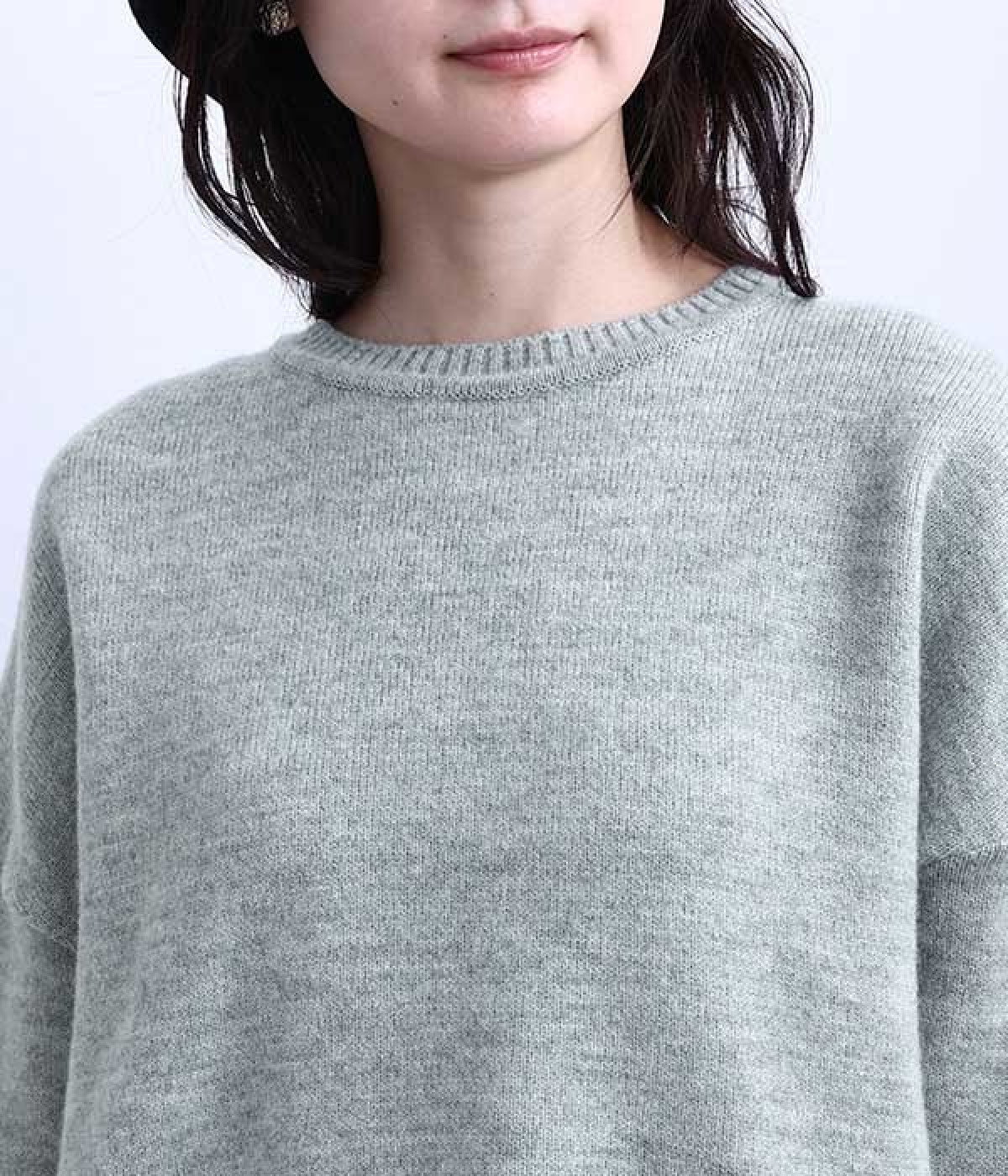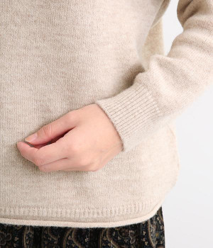 ベビーアルパカとウールをミックスした上質な素材を使用。やわらかくふんわりとした肌触りが気持ちいいニットプルオーバーです。シャツやカットソーなどのインナーを合わせやすく、一枚で着てもきれいに見えるよう、襟ぐりの開きにこだわったデザイン。着心地のよさはもちろん、ボリュームのあるボトムにもバランスのいいシルエットに仕上げました。ロールした裾がナチュラルな雰囲気を漂わせます。