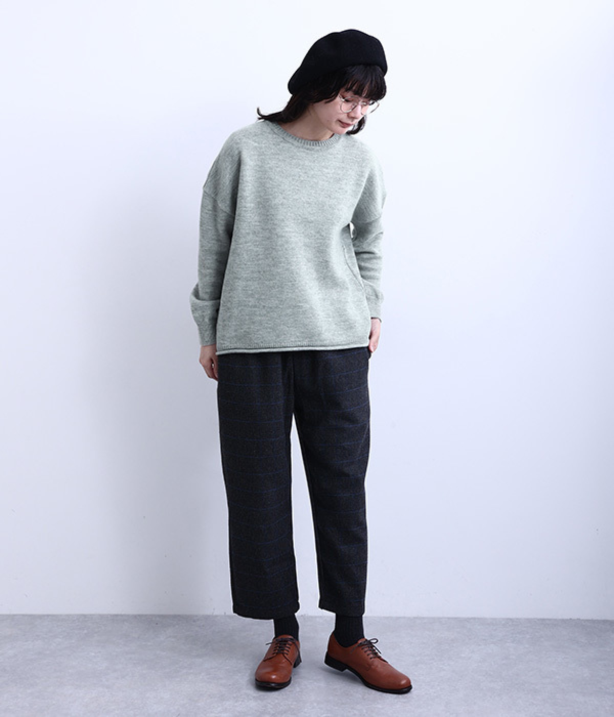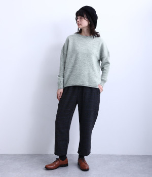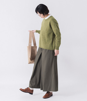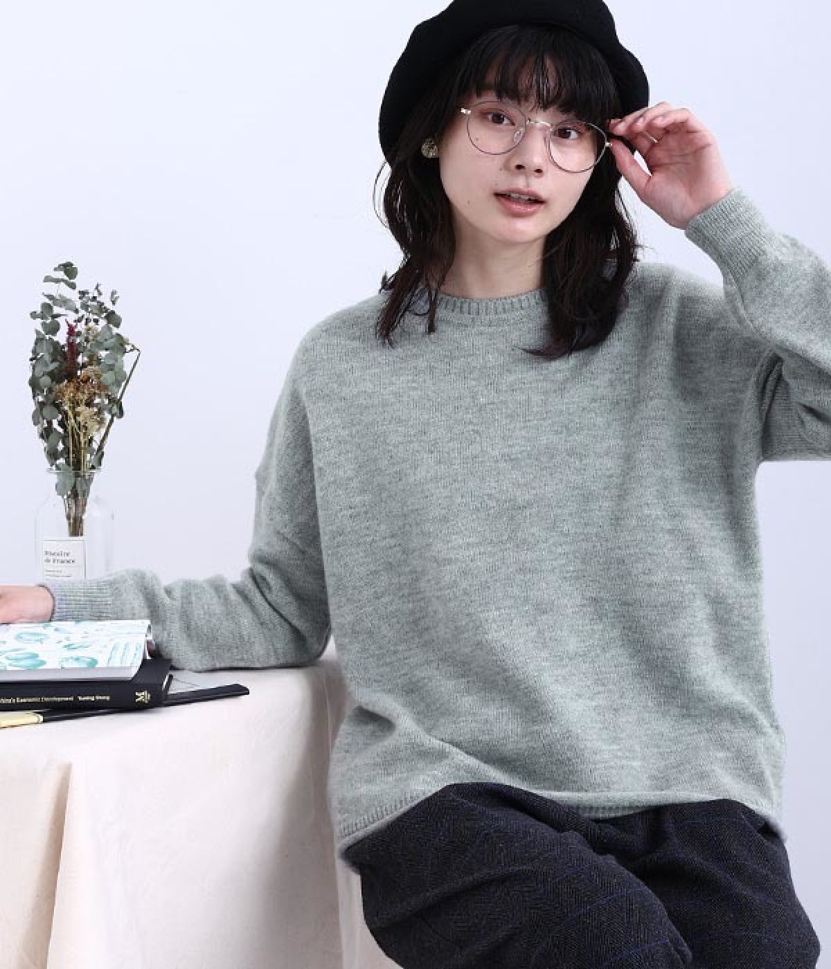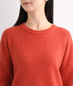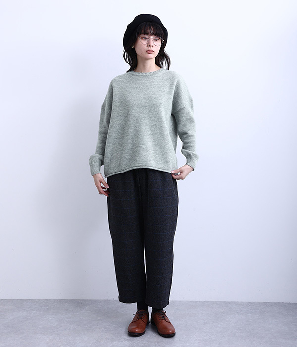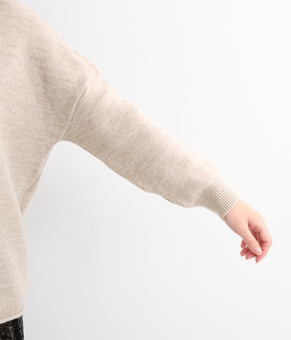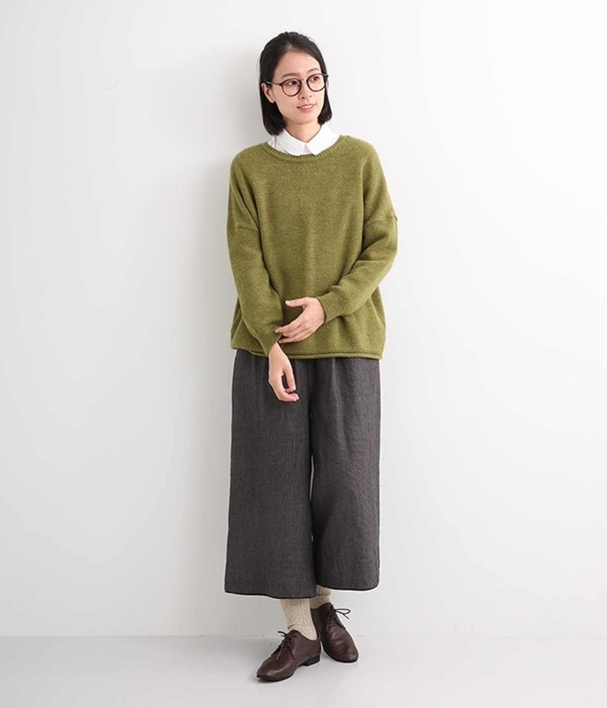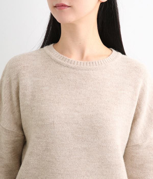 ベビーアルパカとウールをミックスした上質な素材を使用。やわらかくふんわりとした肌触りが気持ちいいニットプルオーバーです。シャツやカットソーなどのインナーを合わせやすく、一枚で着てもきれいに見えるよう、襟ぐりの開きにこだわったデザイン。着心地のよさはもちろん、ボリュームのあるボトムにもバランスのいいシルエットに仕上げました。ロールした裾がナチュラルな雰囲気を漂わせます。