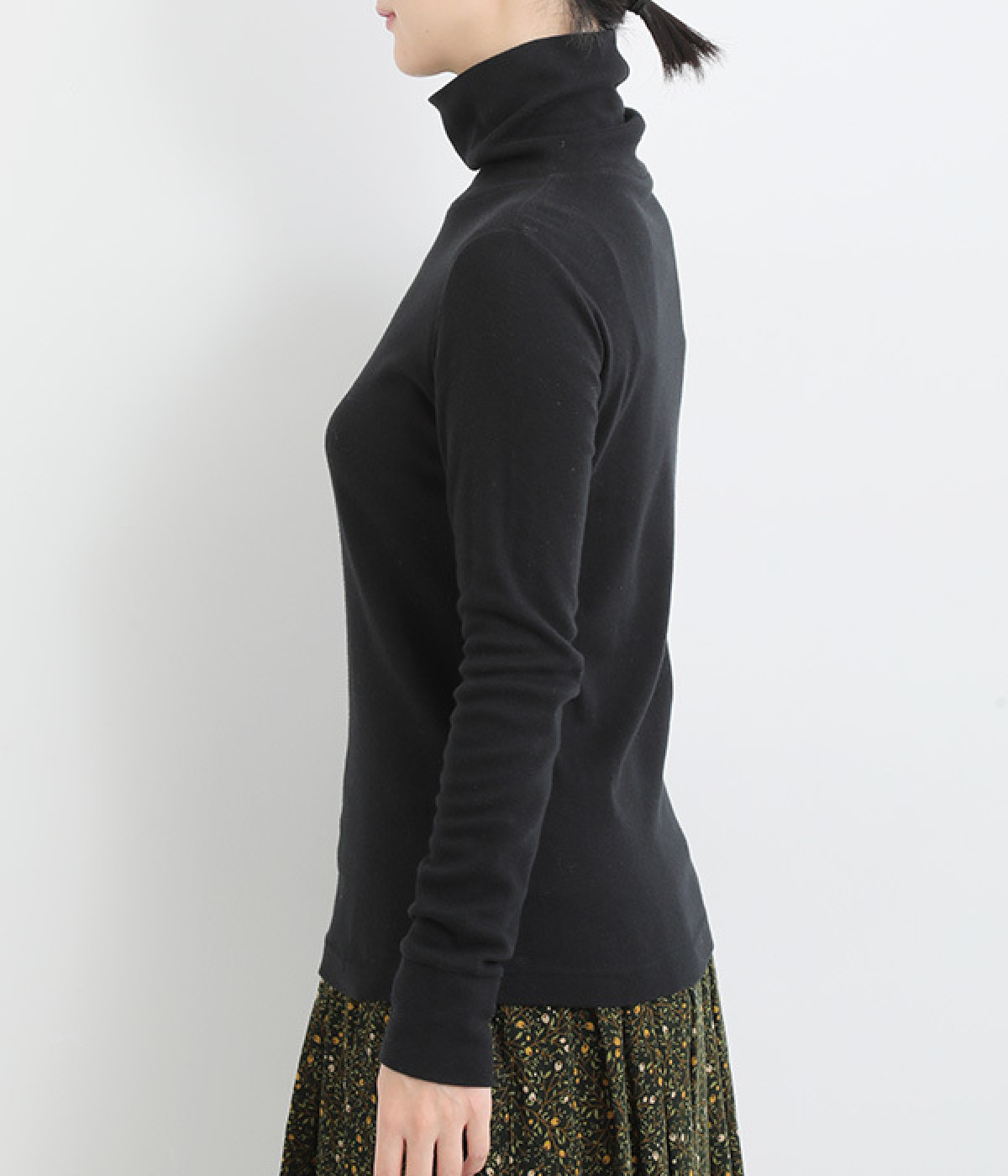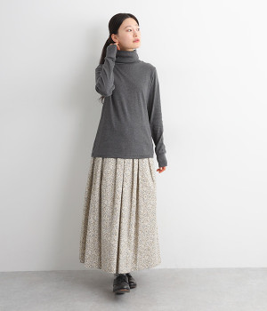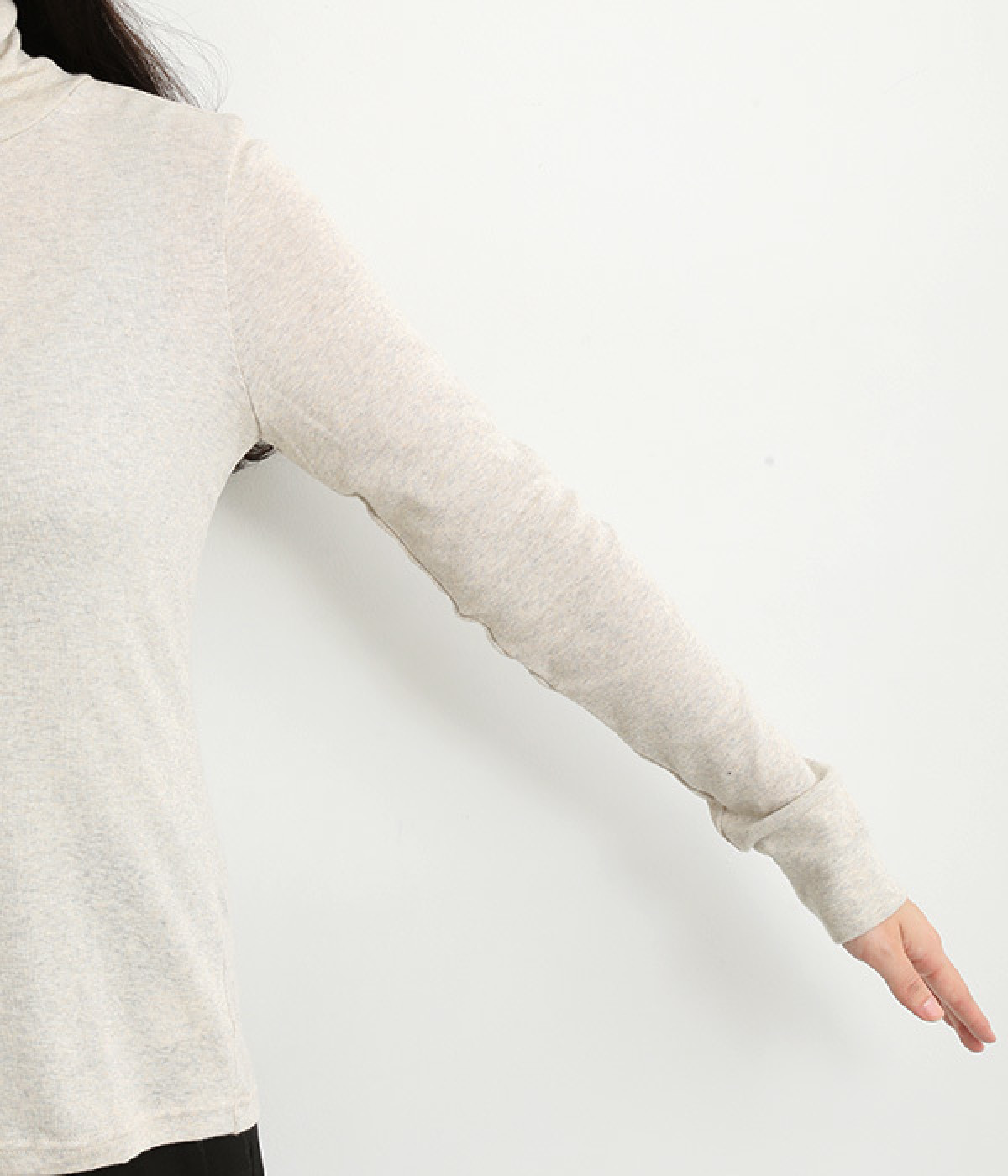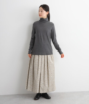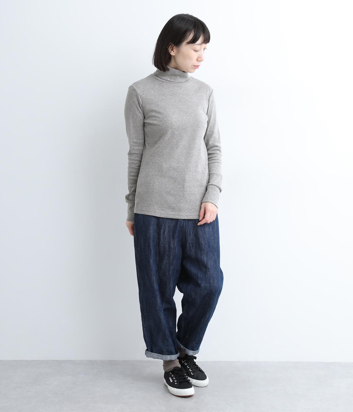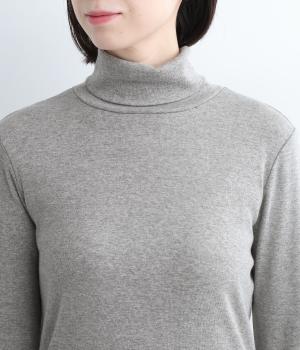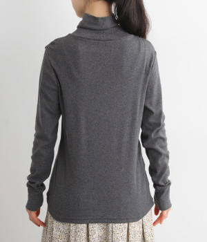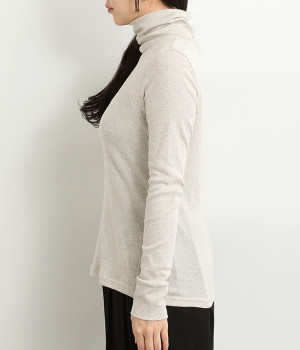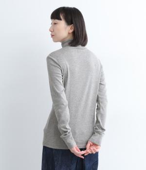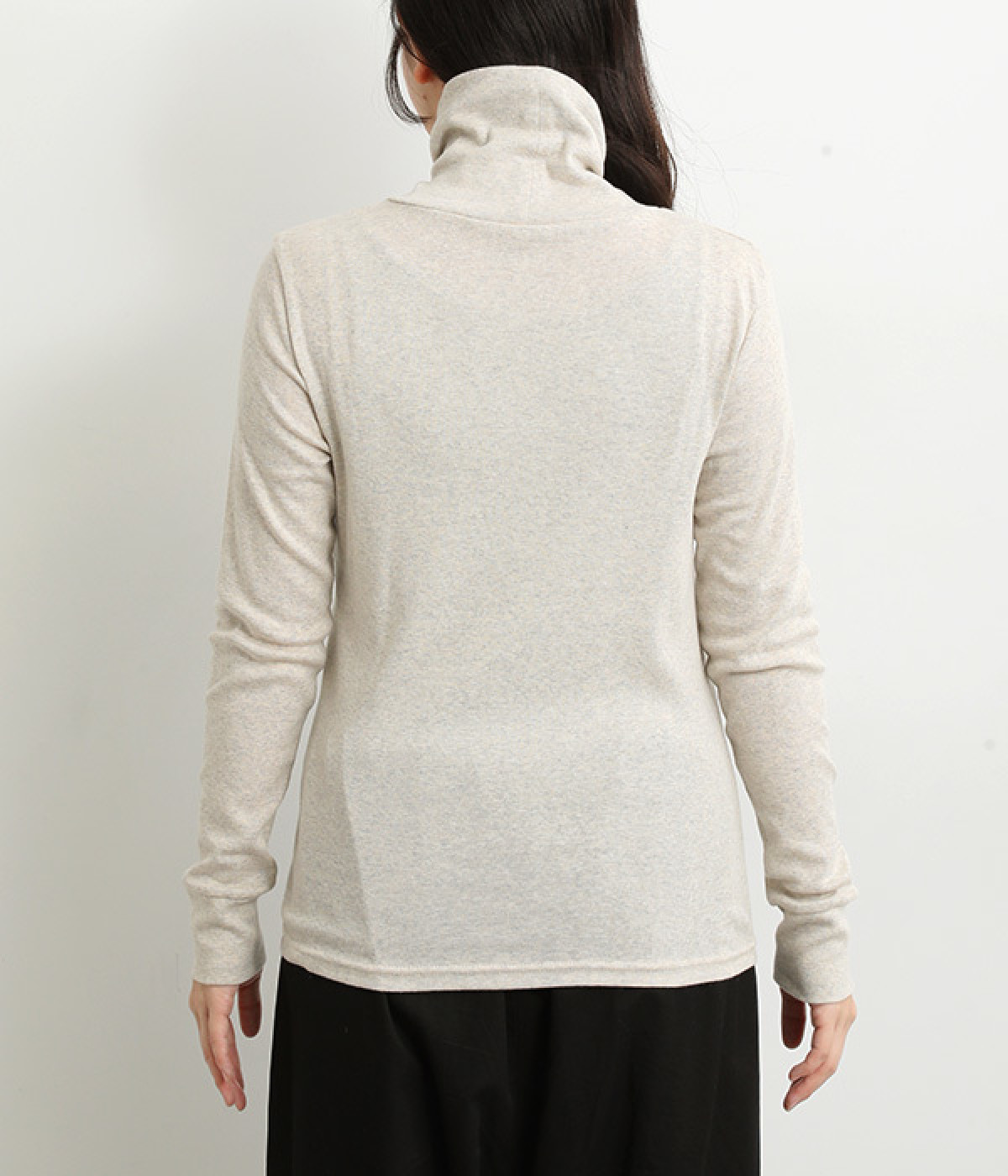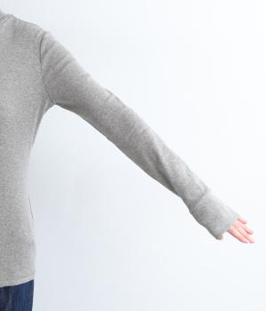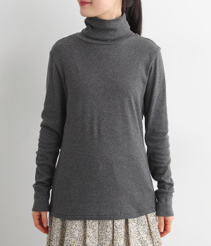 シンプルなデザインで羽織りものやニットのインナー使いなどに着まわせるプルオーバーは、袖口の切り替えでポイントを持たせました。タートルネックは折り返してモックネック風にしても◎。