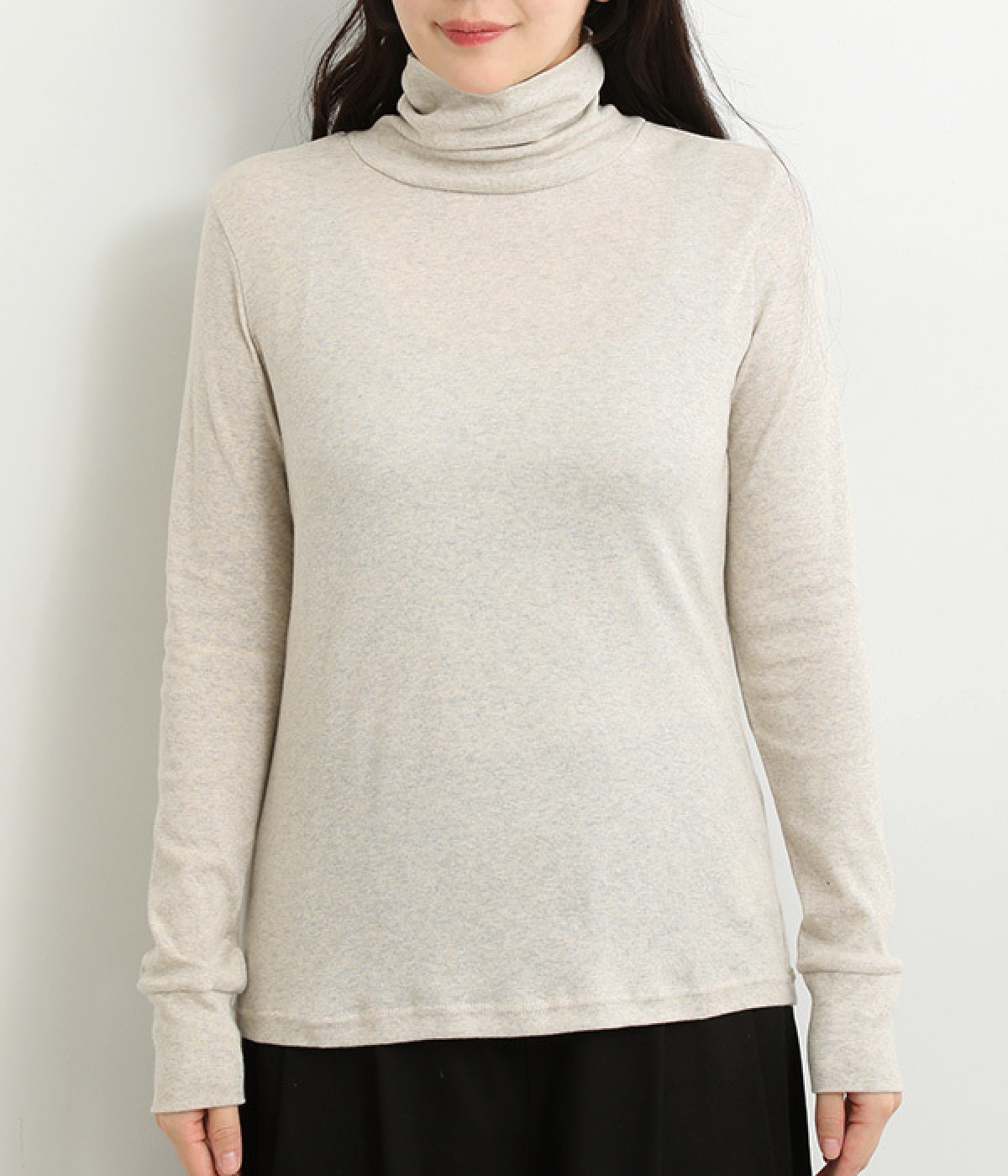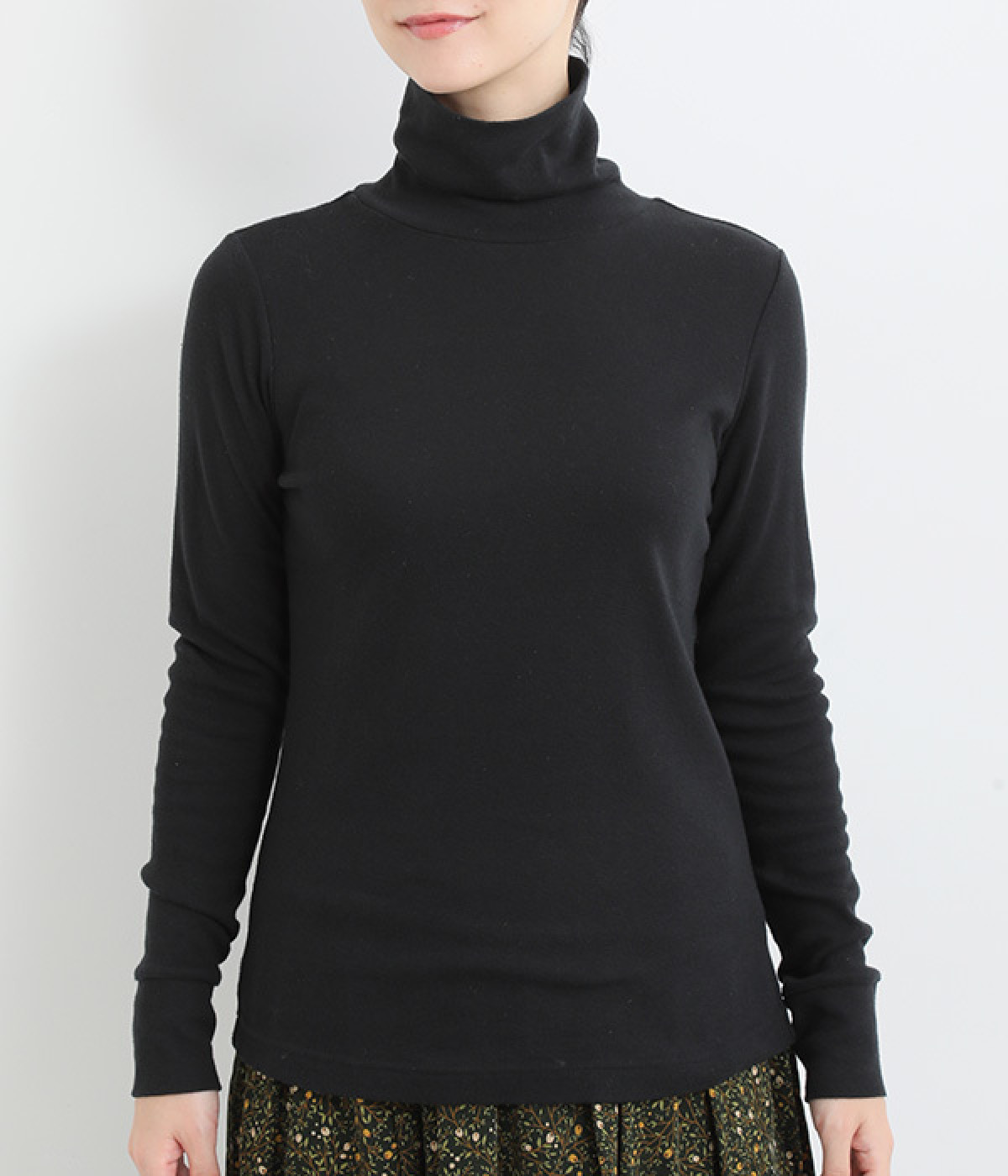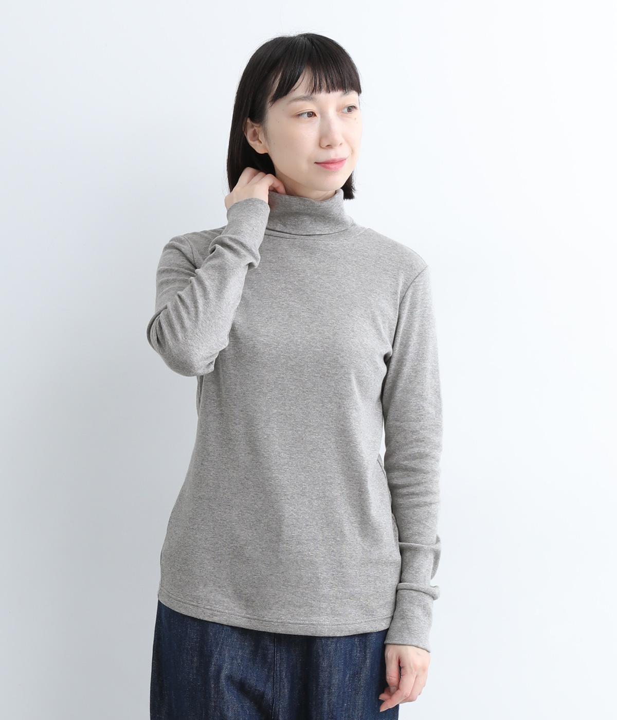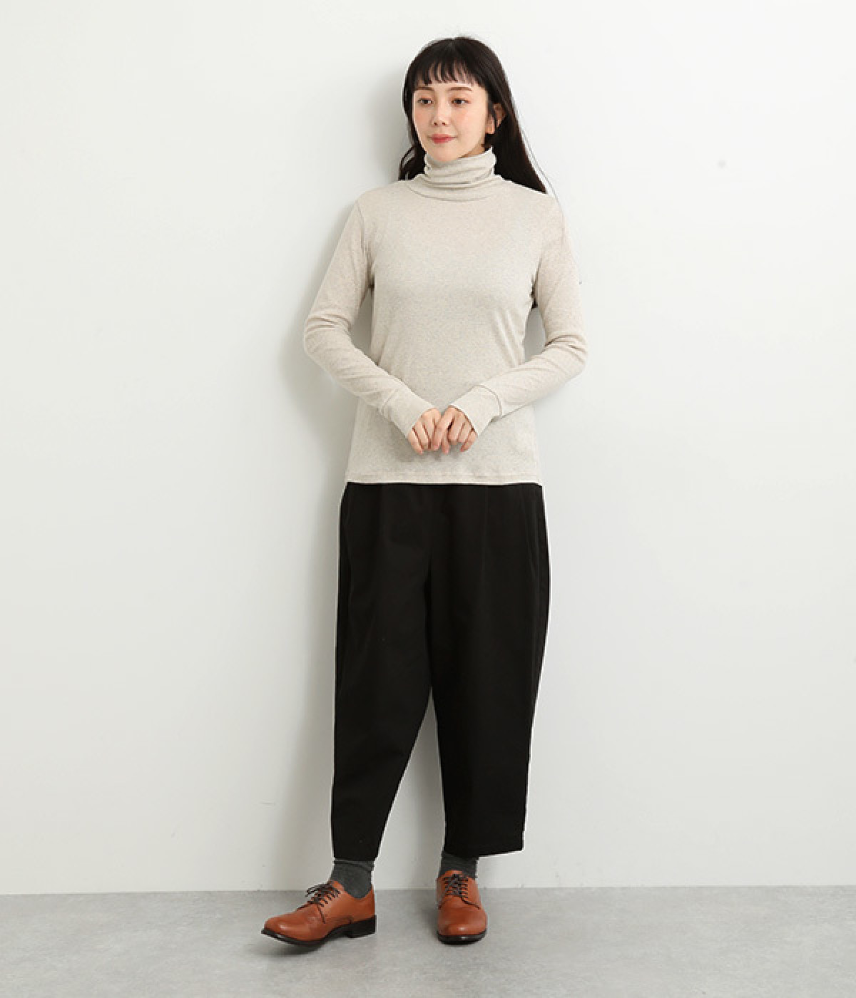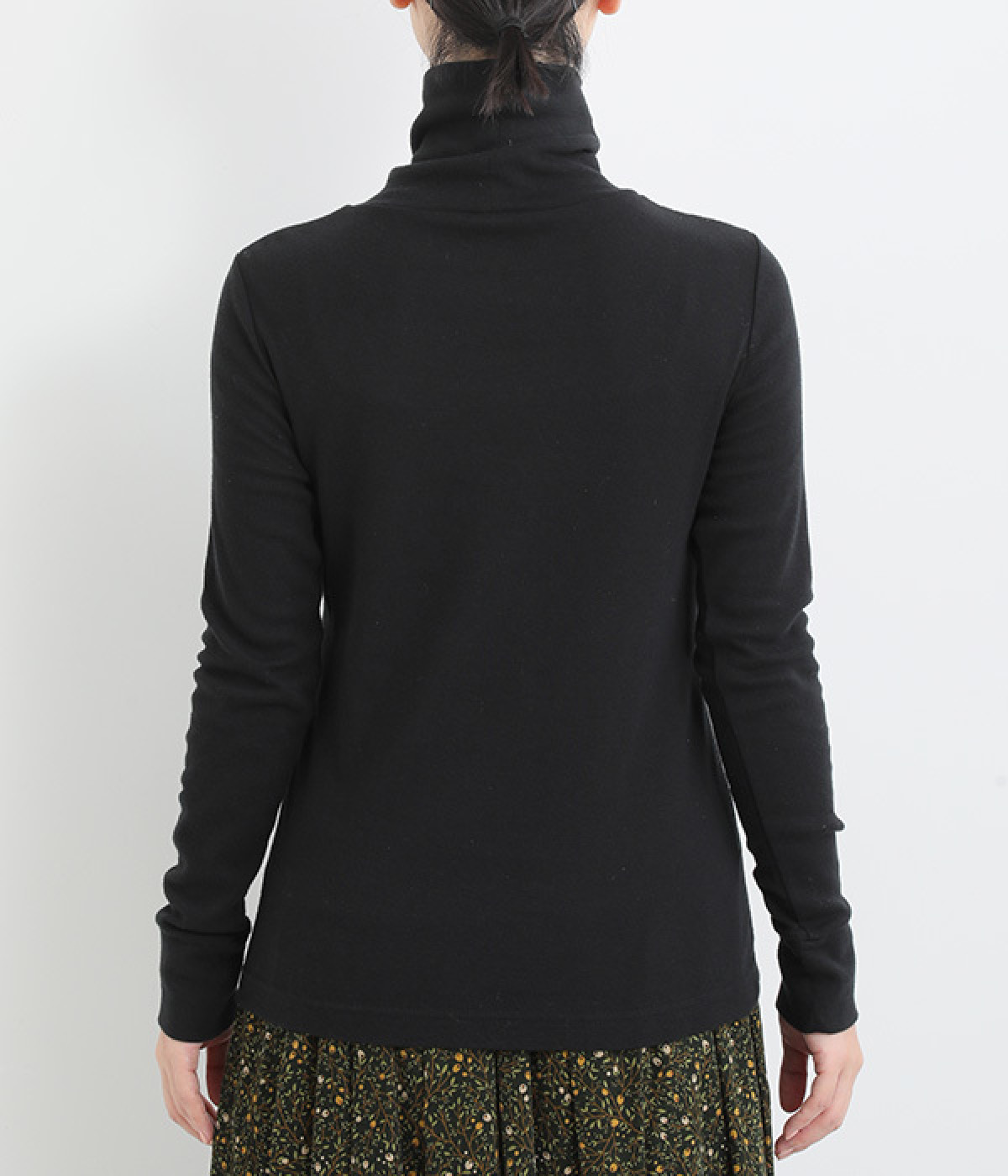 シンプルなデザインで羽織りものやニットのインナー使いなどに着まわせるプルオーバーは、袖口の切り替えでポイントを持たせました。タートルネックは折り返してモックネック風にしても◎。