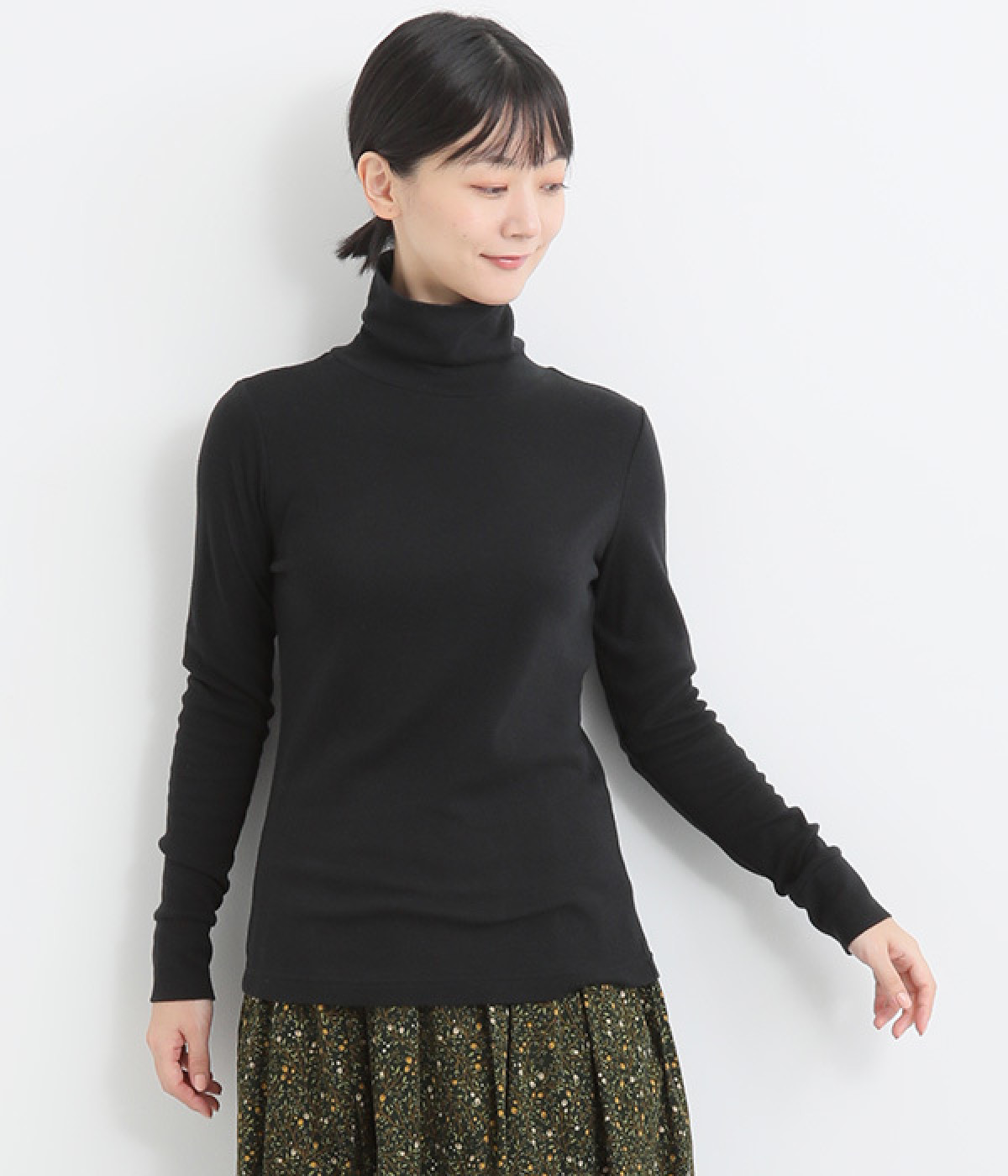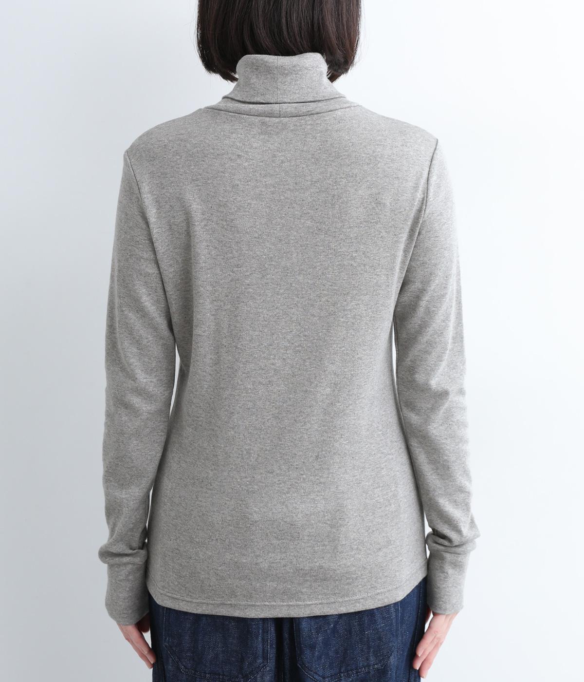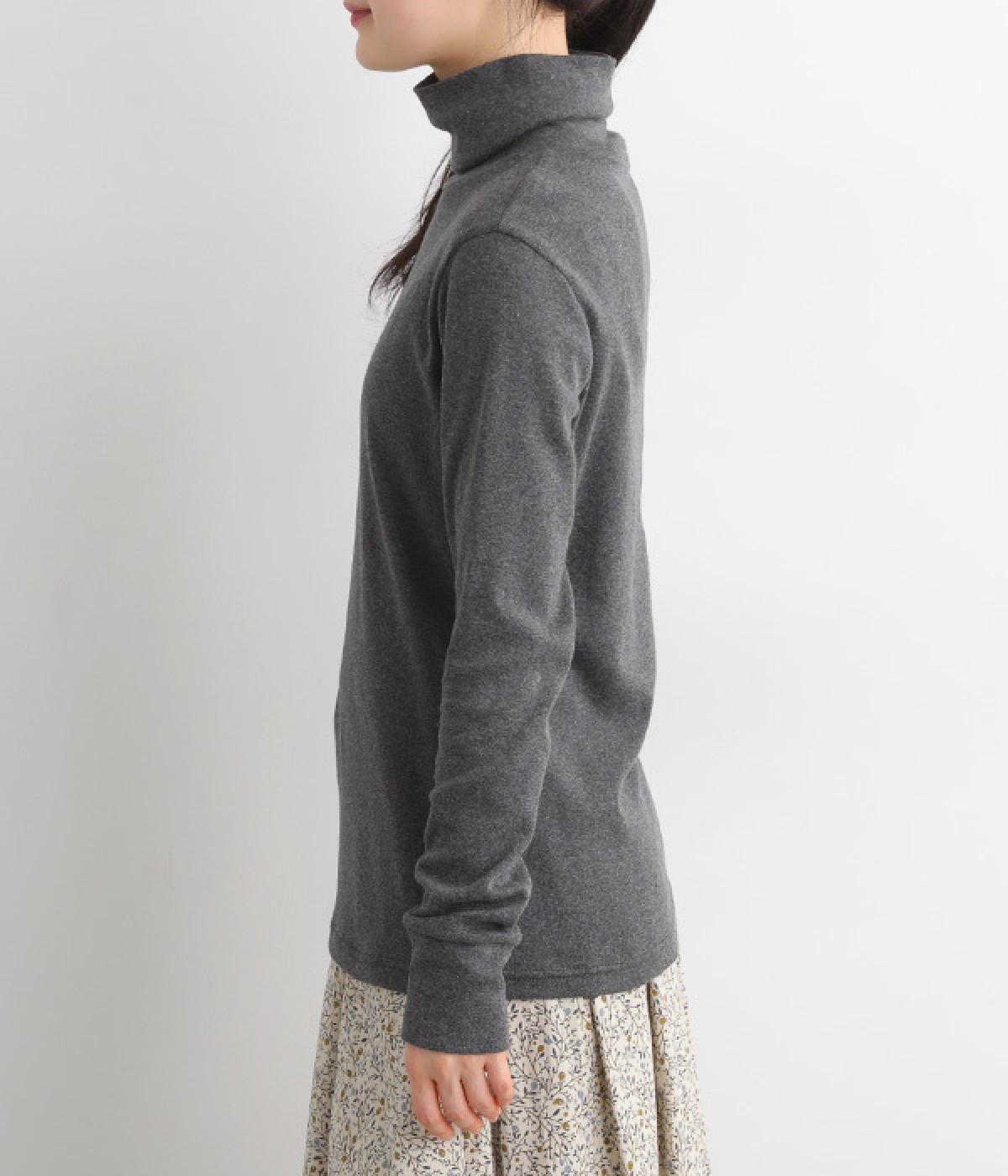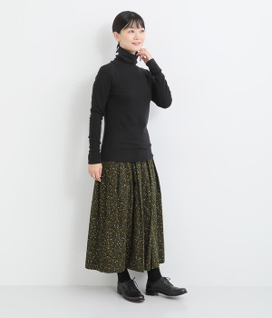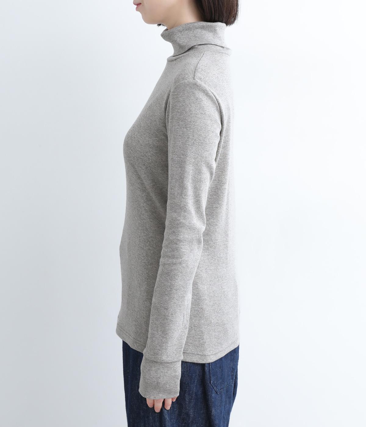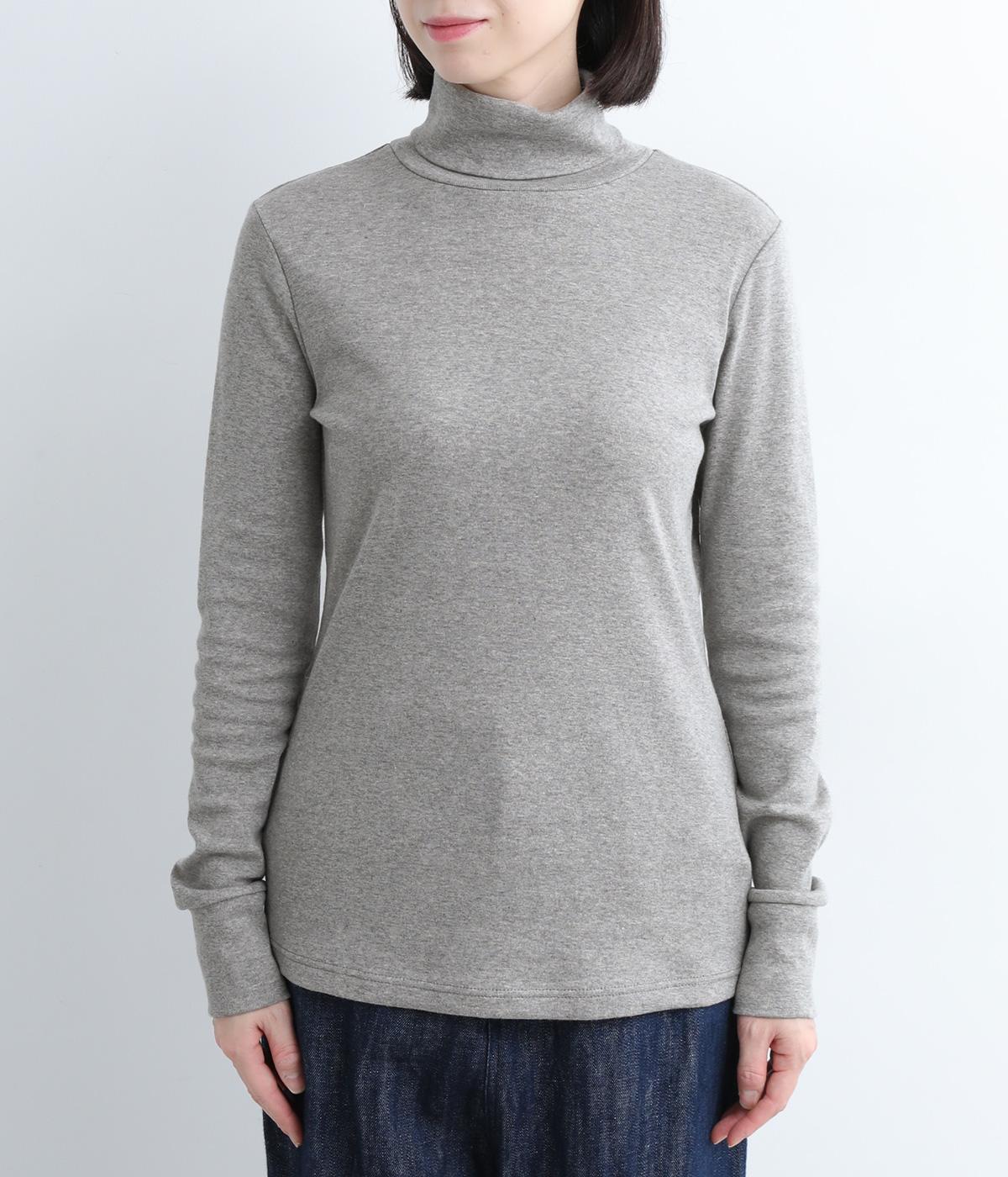 シンプルなデザインで羽織りものやニットのインナー使いなどに着まわせるプルオーバーは、袖口の切り替えでポイントを持たせました。タートルネックは折り返してモックネック風にしても◎。