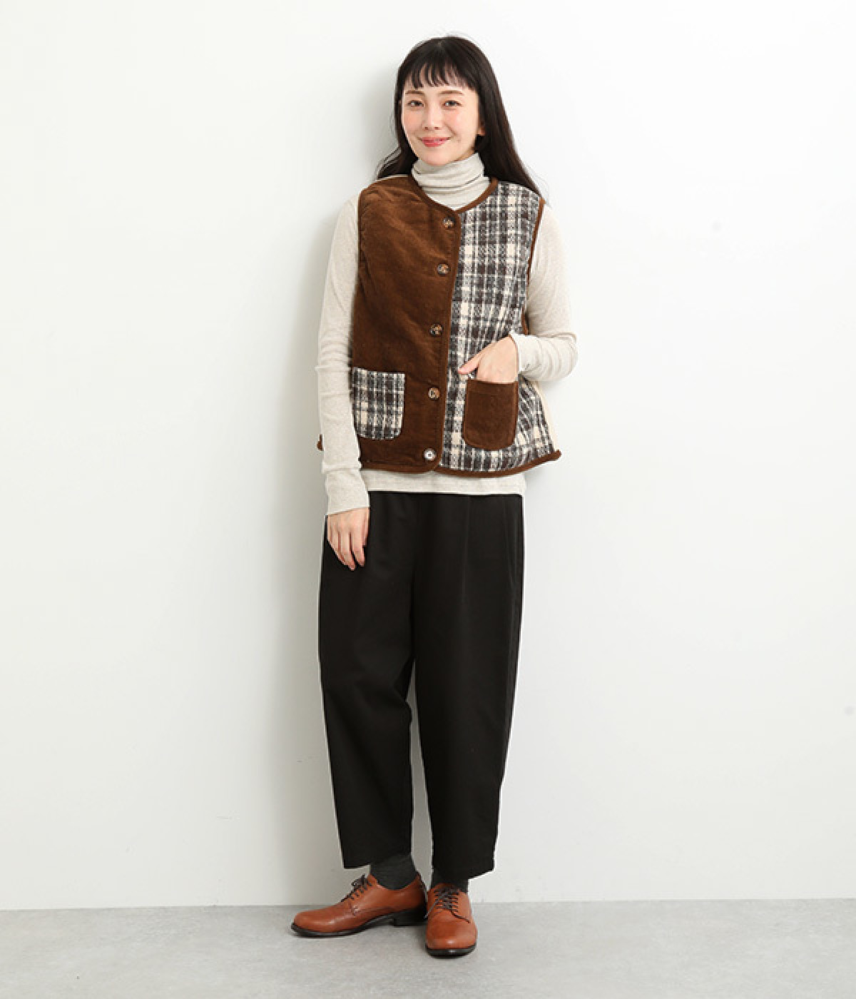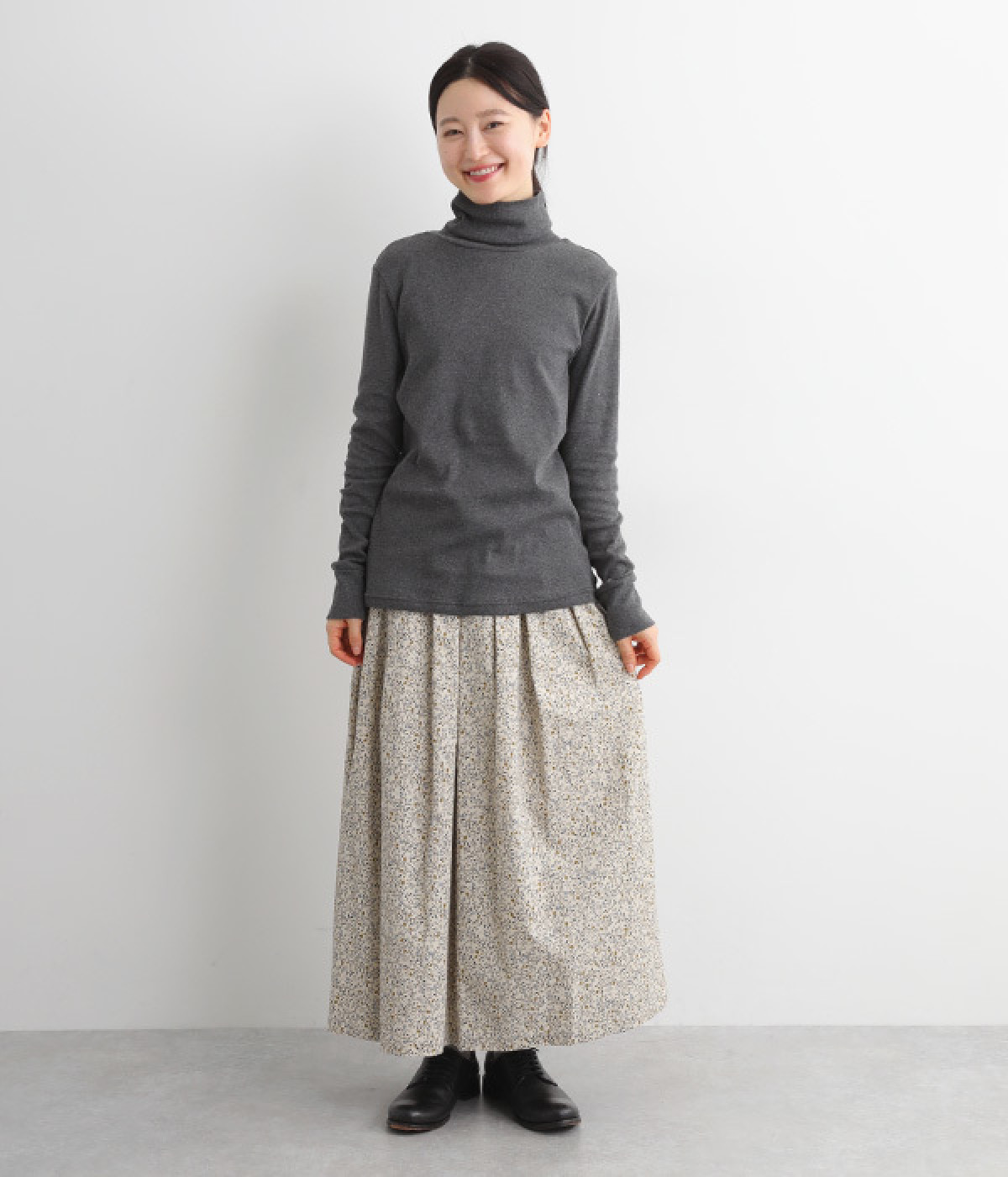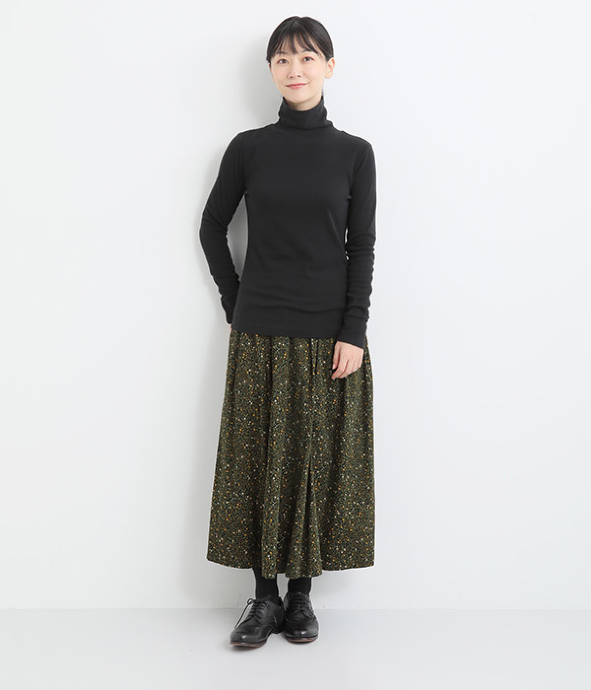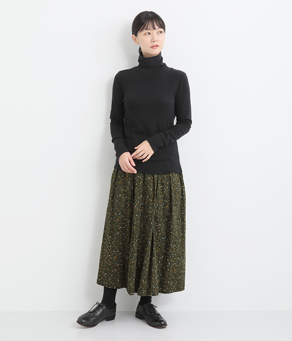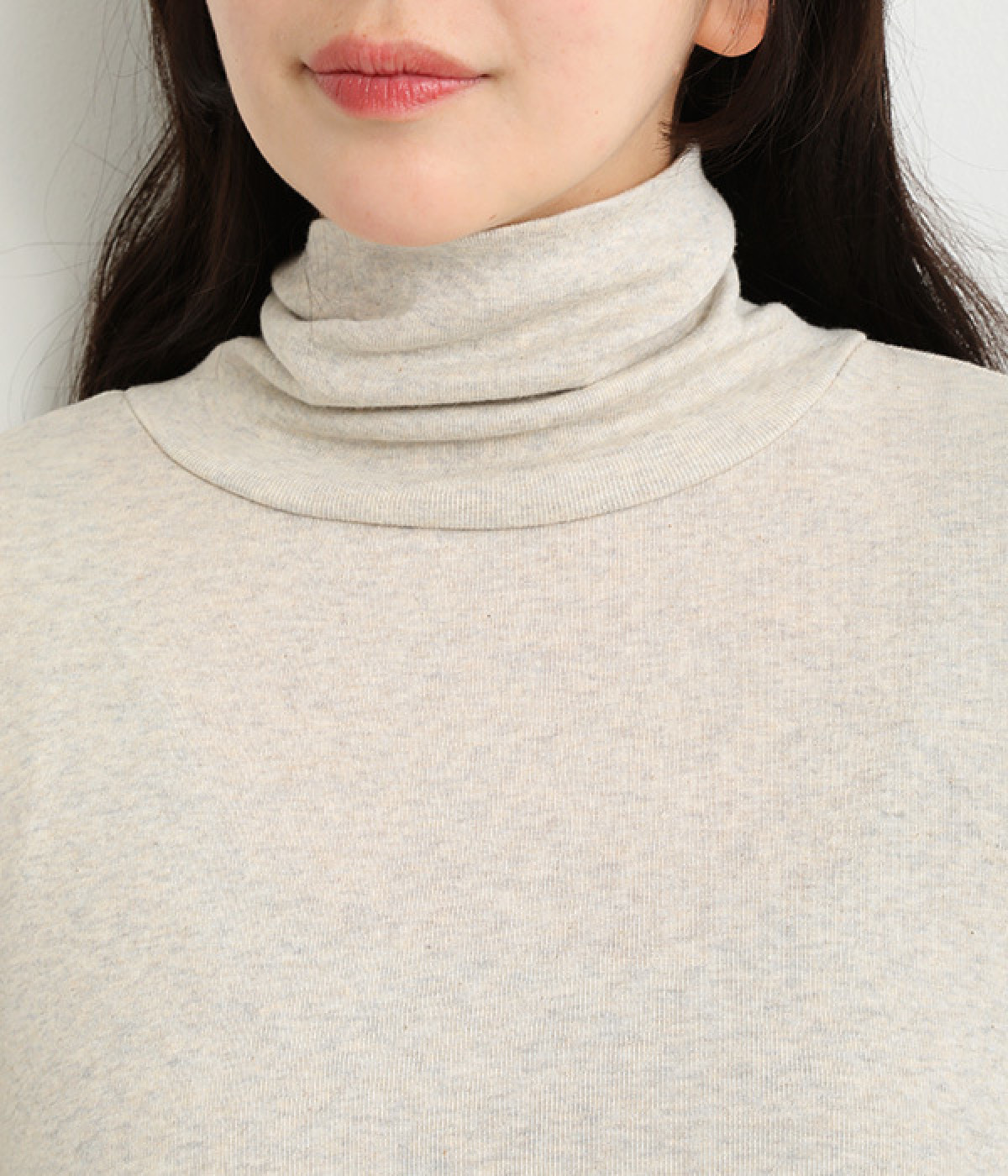 シンプルなデザインで羽織りものやニットのインナー使いなどに着まわせるプルオーバーは、袖口の切り替えでポイントを持たせました。タートルネックは折り返してモックネック風にしても◎。