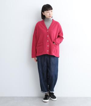 肌触りが心地良いオーガニックコットンを使用した、伸縮性抜群で着心地のいいフライス生地を使用。厚さもちょうどよく、あたたかなインナーにもメインにもなる生地感です。