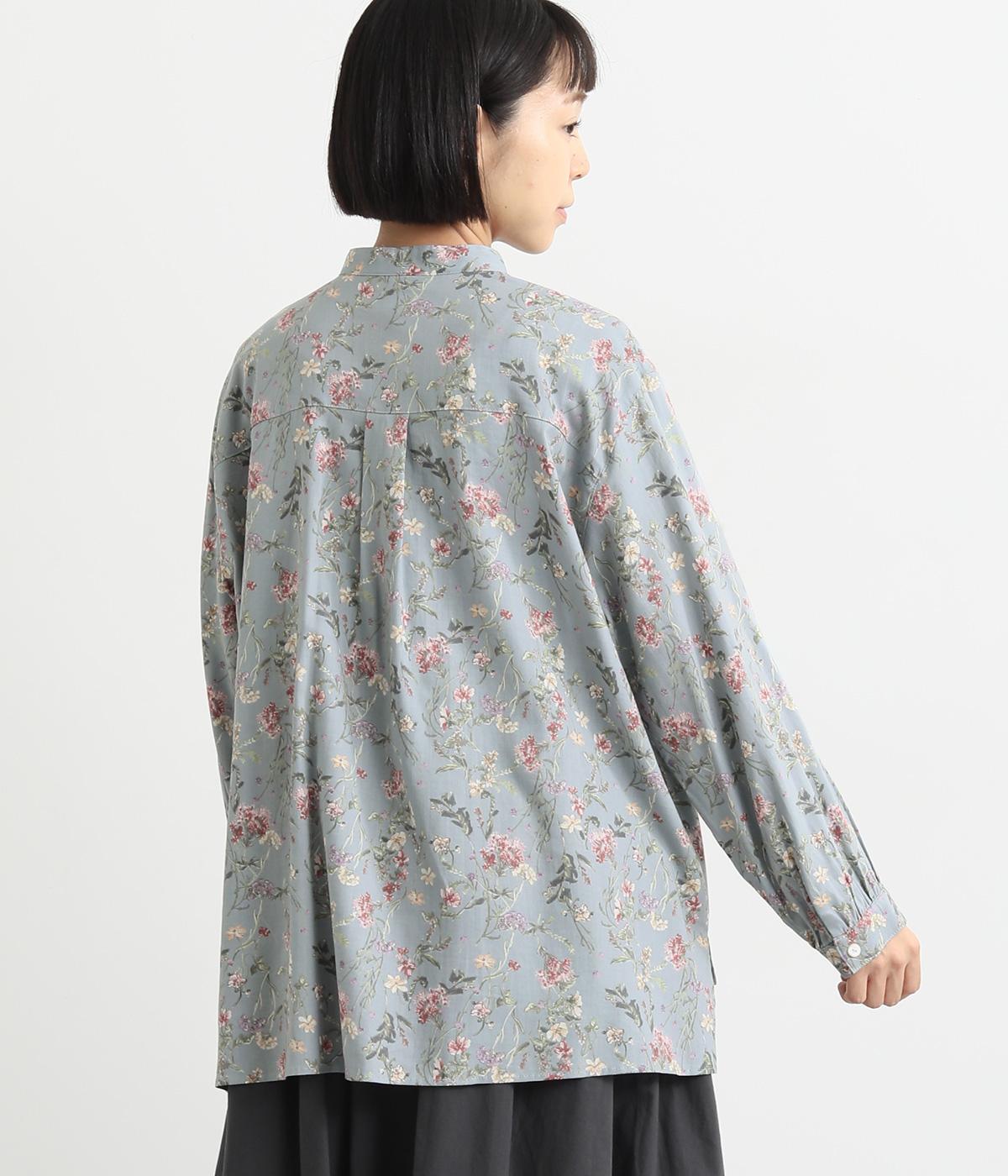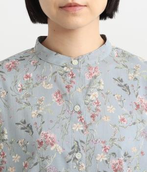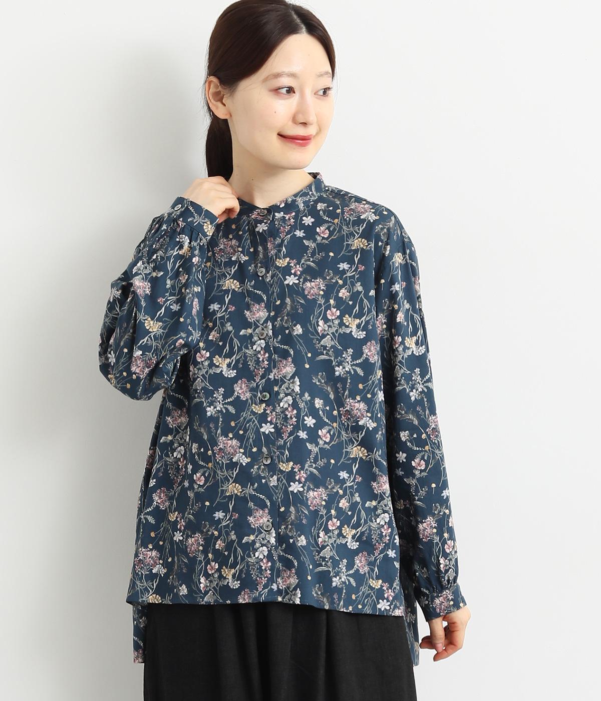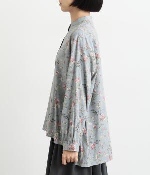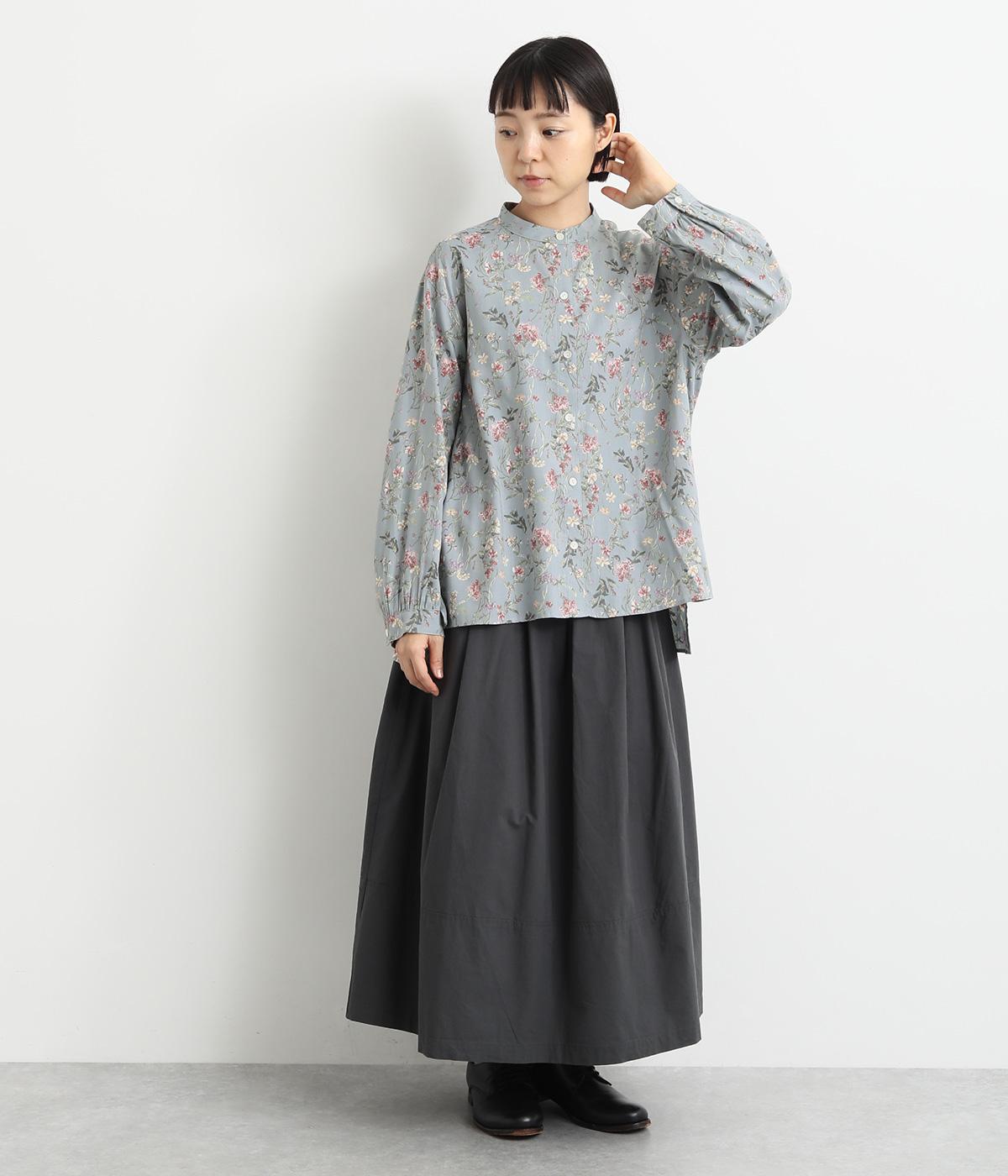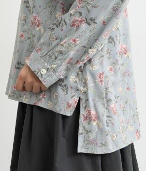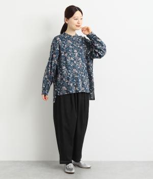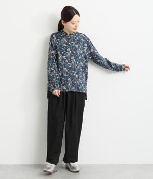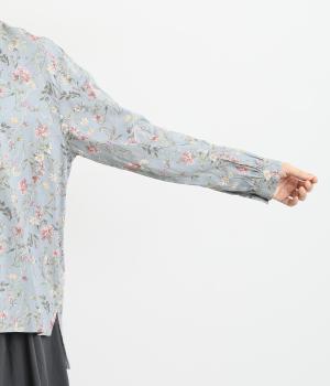 甘すぎない花柄なので幅広い方に着ていただけるブラウスです。小さめのスタンドカラーや、袖口のギャザーでさりげなく可愛らしさをプラス。裾サイドにはスリットが入っていて後ろ丈が長く、体型カバーも叶います。