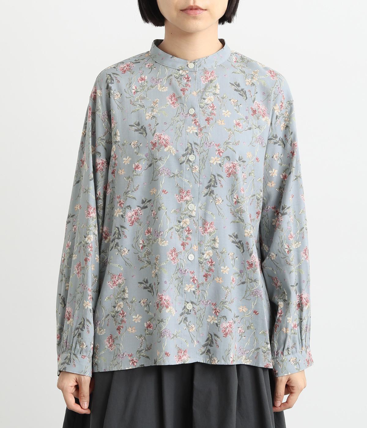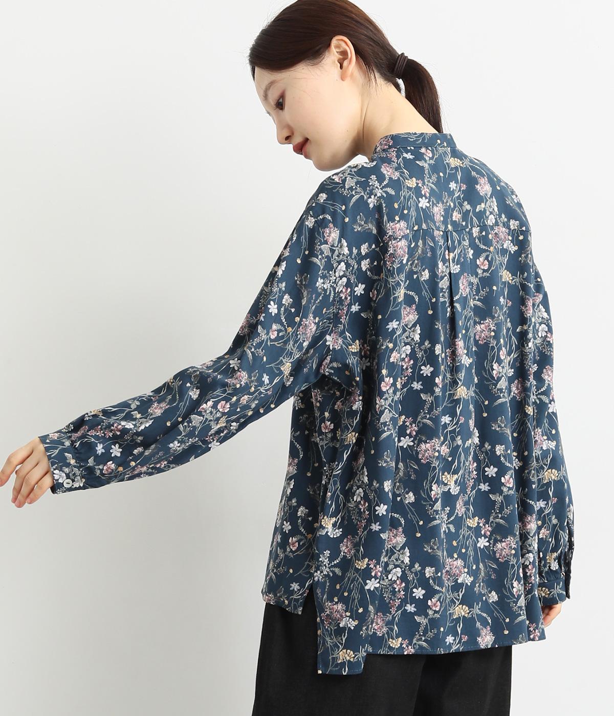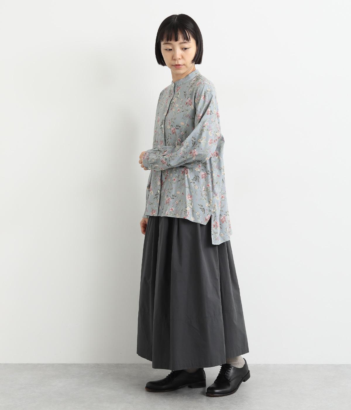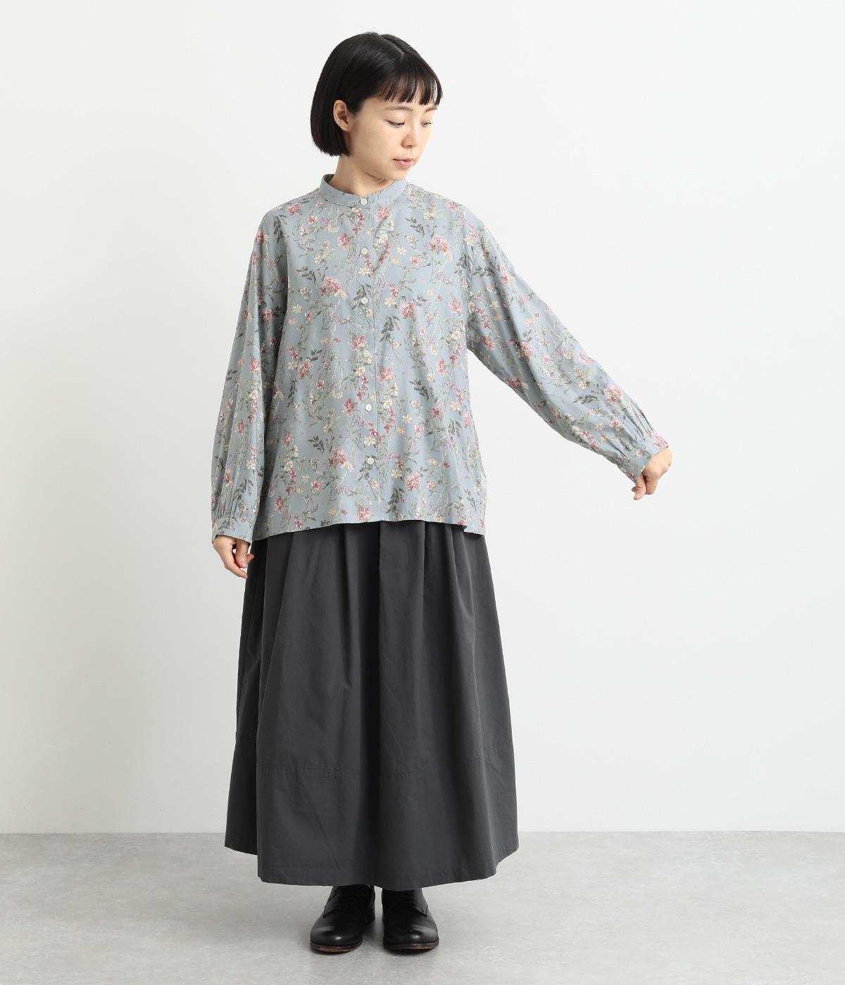 甘すぎない花柄なので幅広い方に着ていただけるブラウスです。小さめのスタンドカラーや、袖口のギャザーでさりげなく可愛らしさをプラス。裾サイドにはスリットが入っていて後ろ丈が長く、体型カバーも叶います。