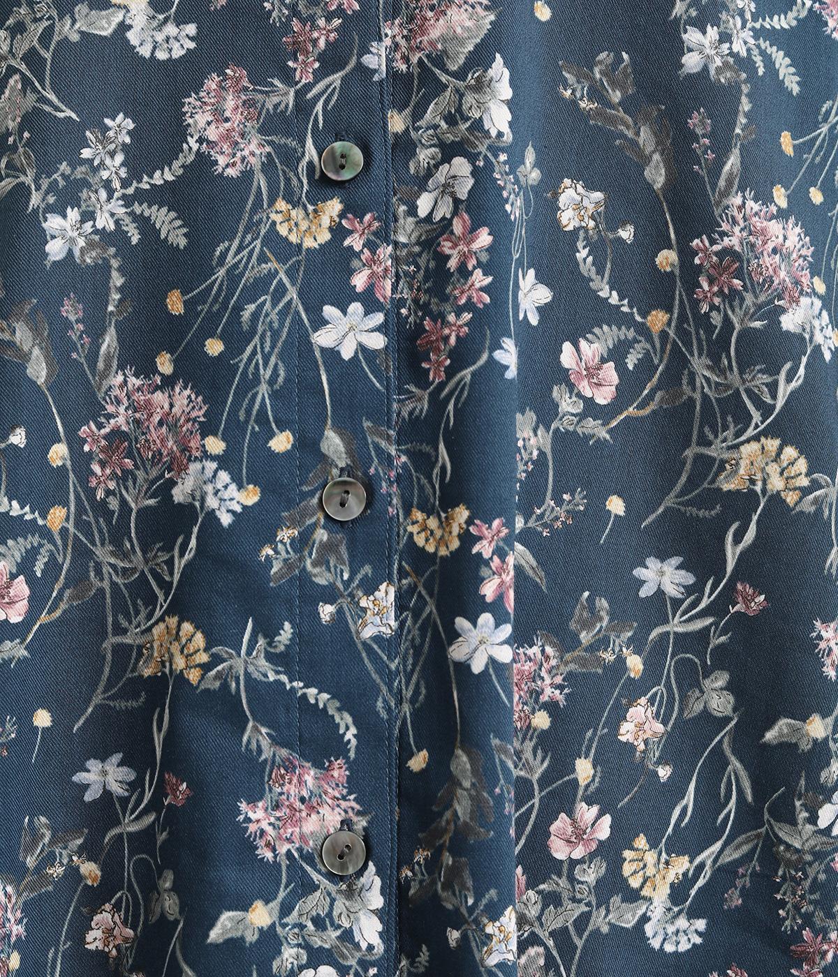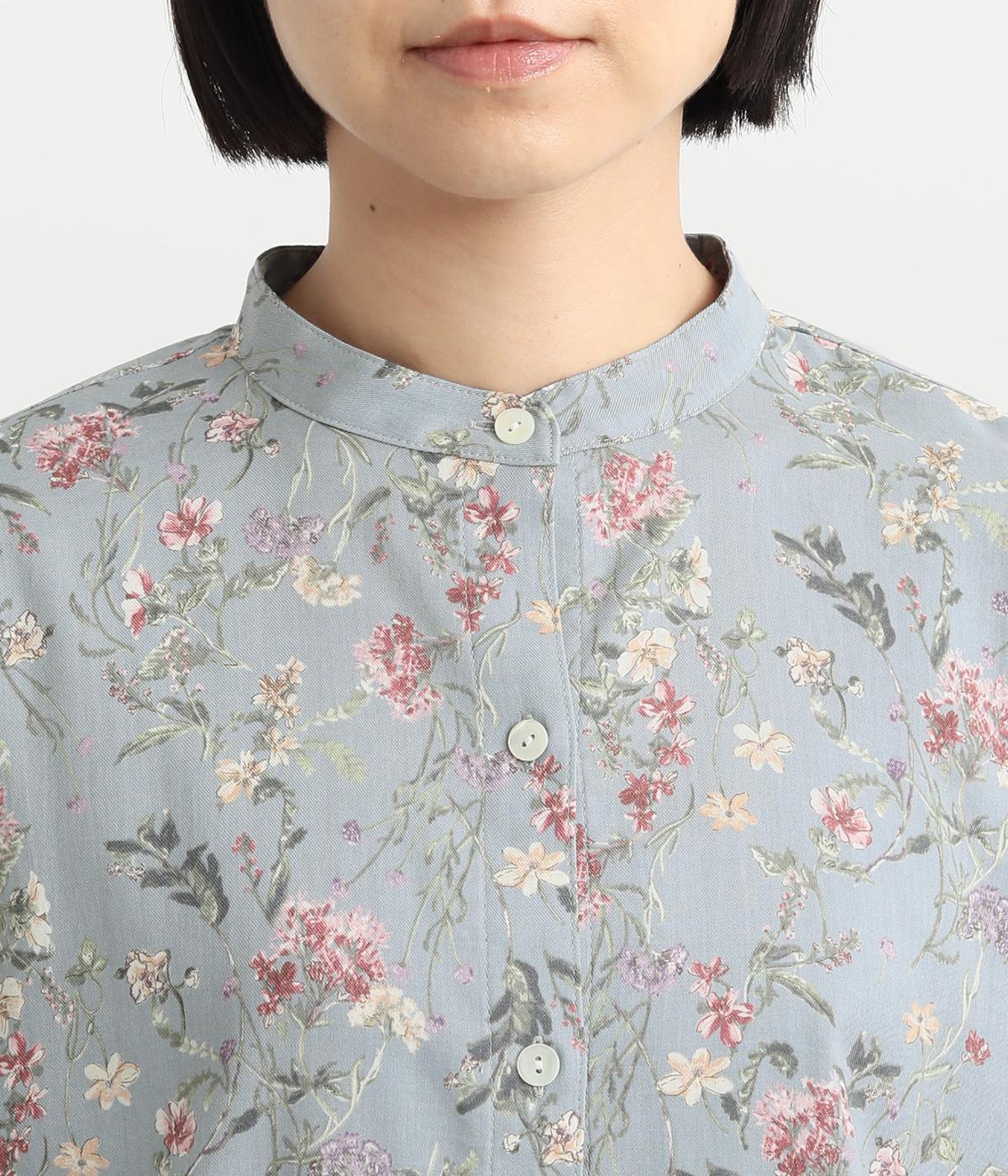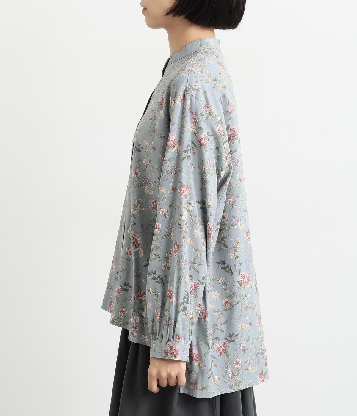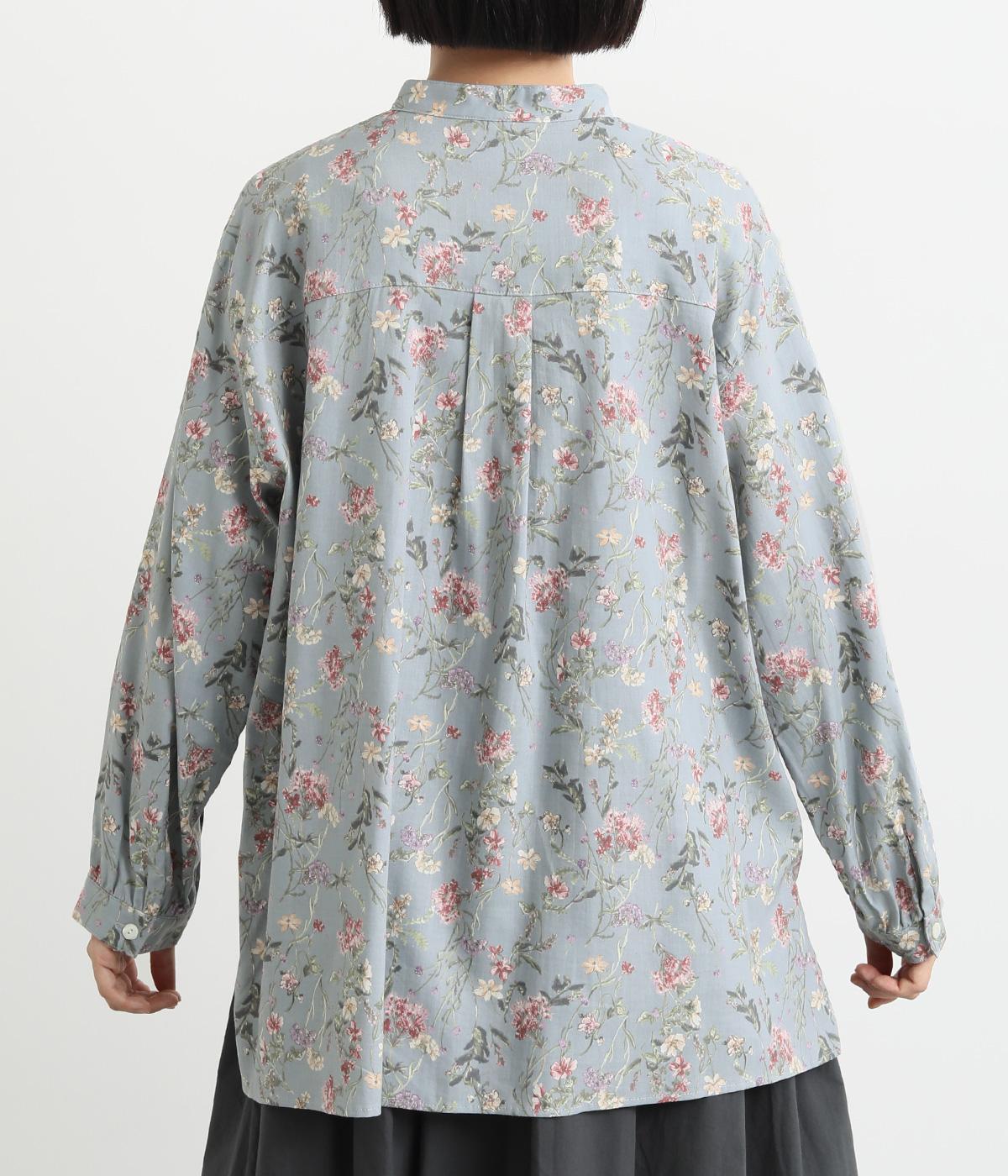 甘すぎない花柄なので幅広い方に着ていただけるブラウスです。小さめのスタンドカラーや、袖口のギャザーでさりげなく可愛らしさをプラス。裾サイドにはスリットが入っていて後ろ丈が長く、体型カバーも叶います。