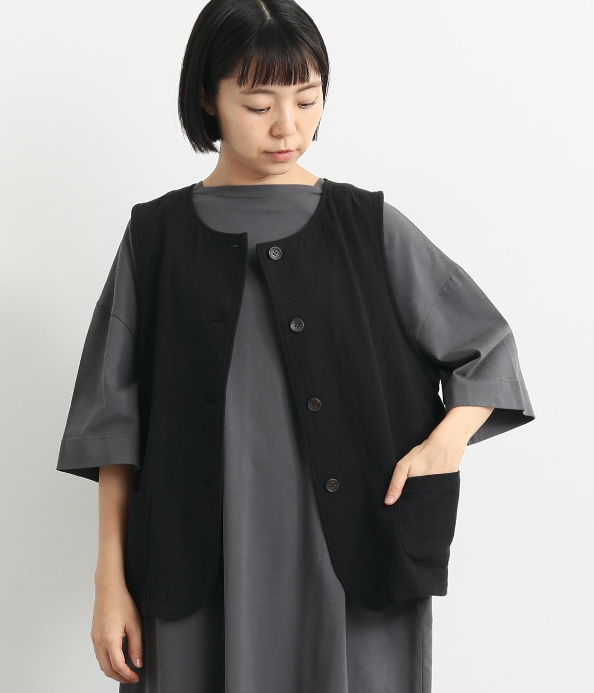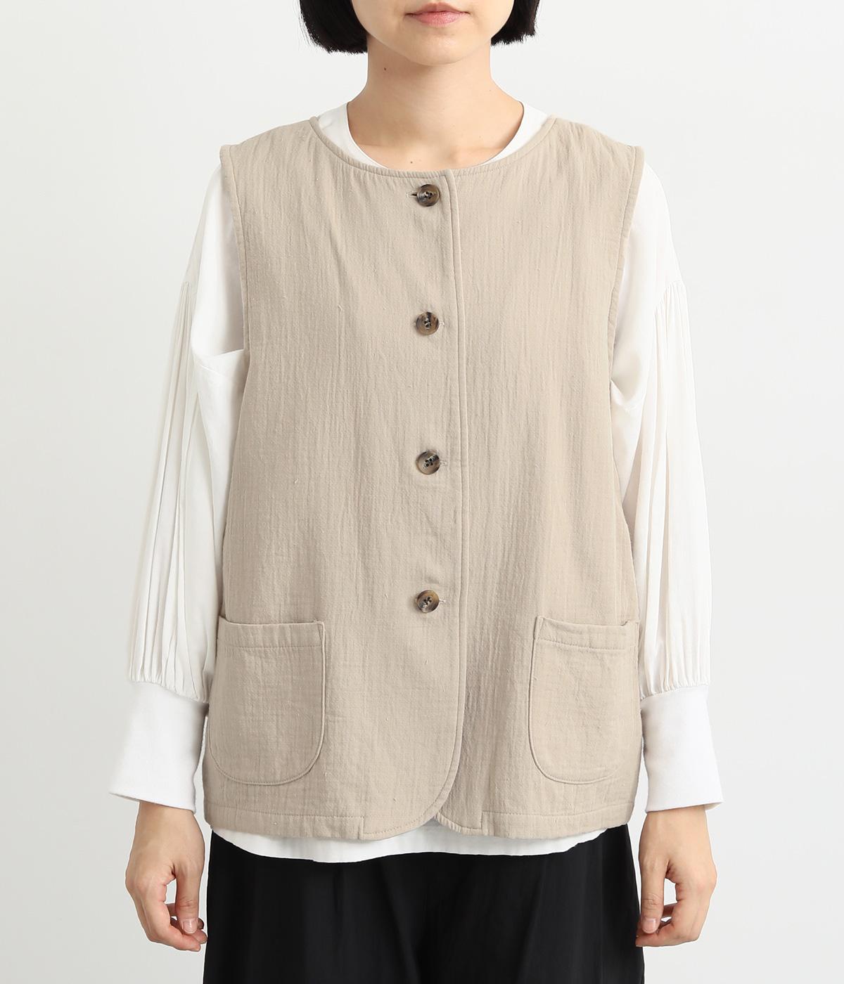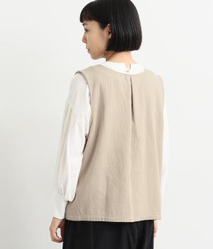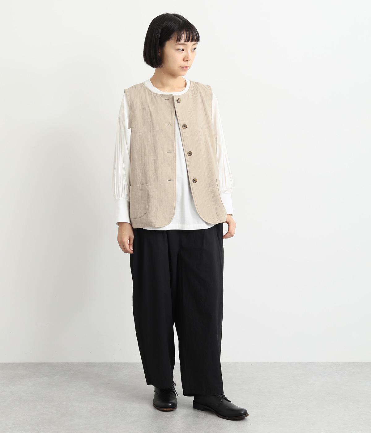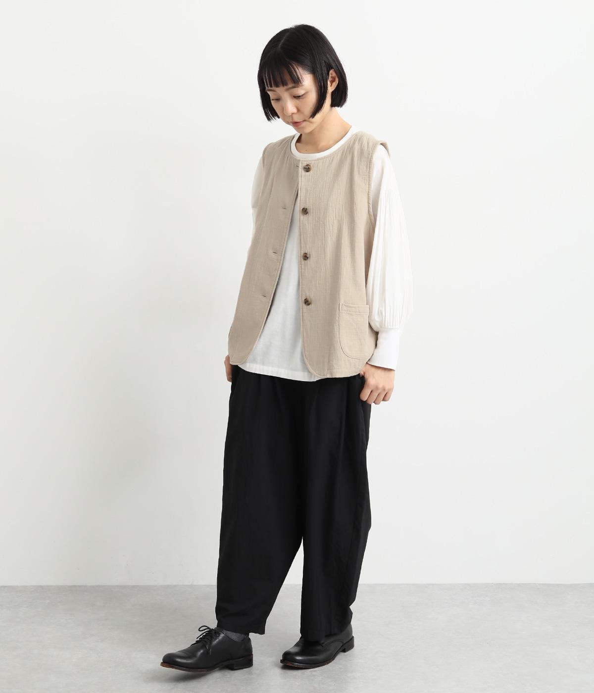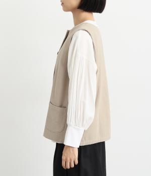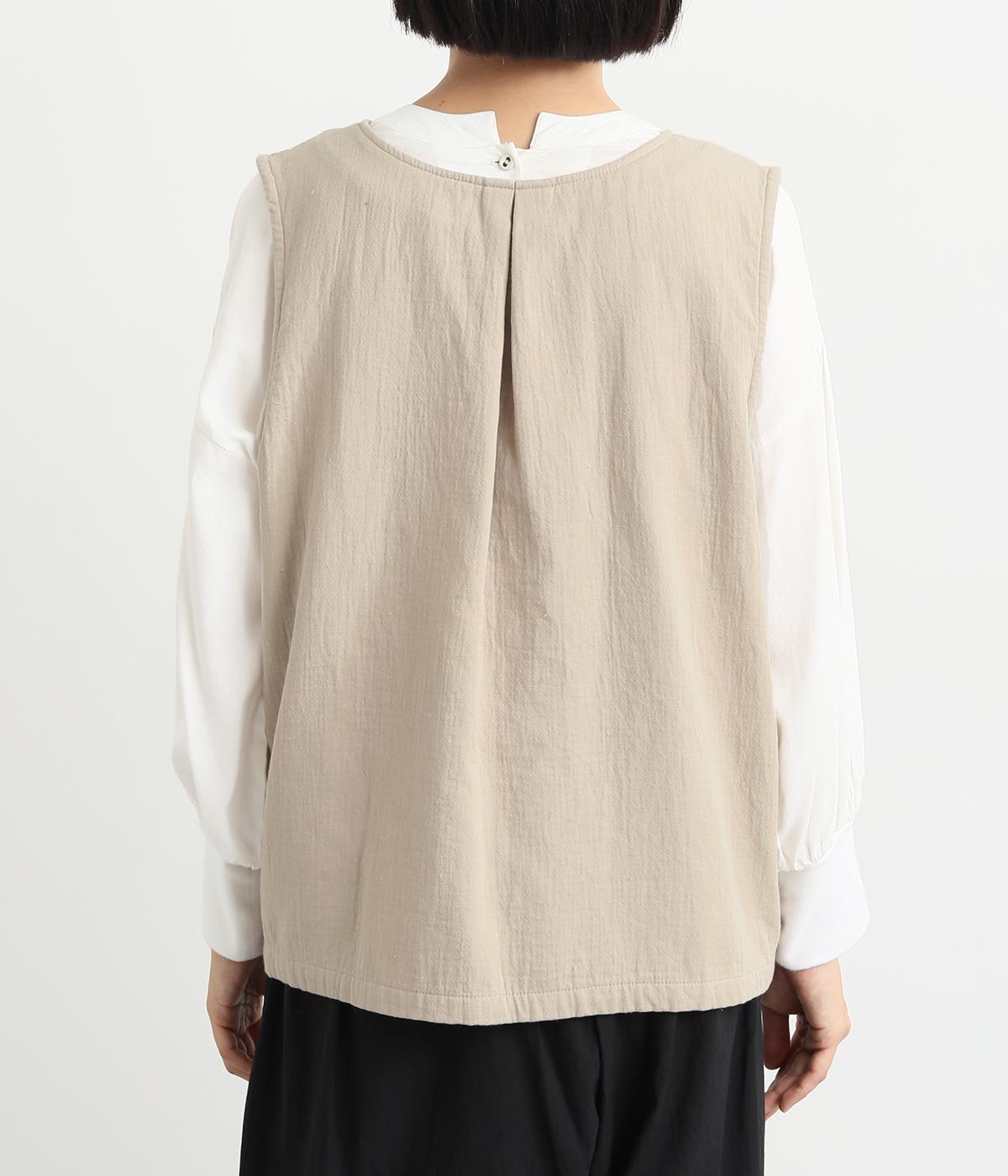 人気のベストの型を使用し、インナーとあわせやすいゆったりとしたシルエットが重宝するアイテムです。ナチュラルな風合いで、カジュアルにもきれいめにも楽しめます。背中のタックもさりげないアクセントです。