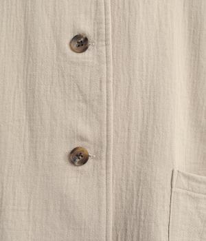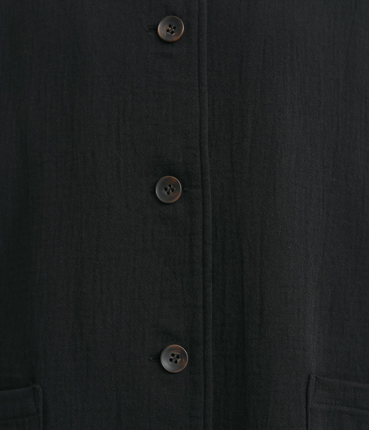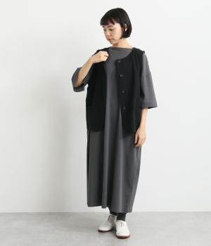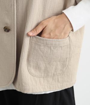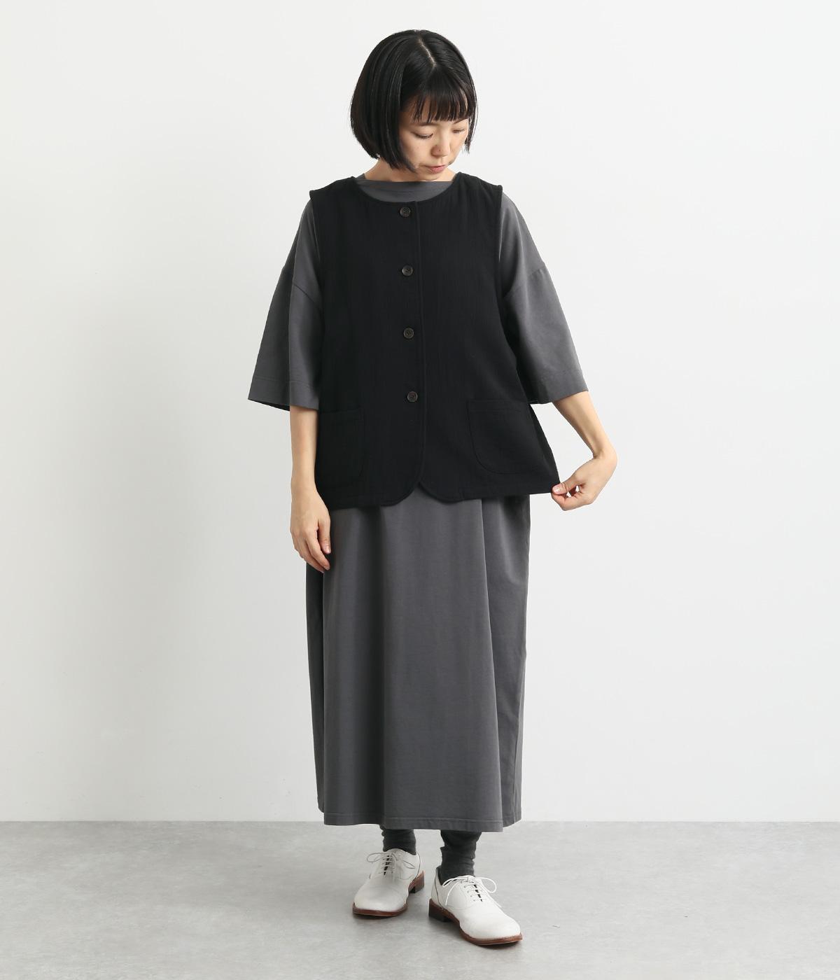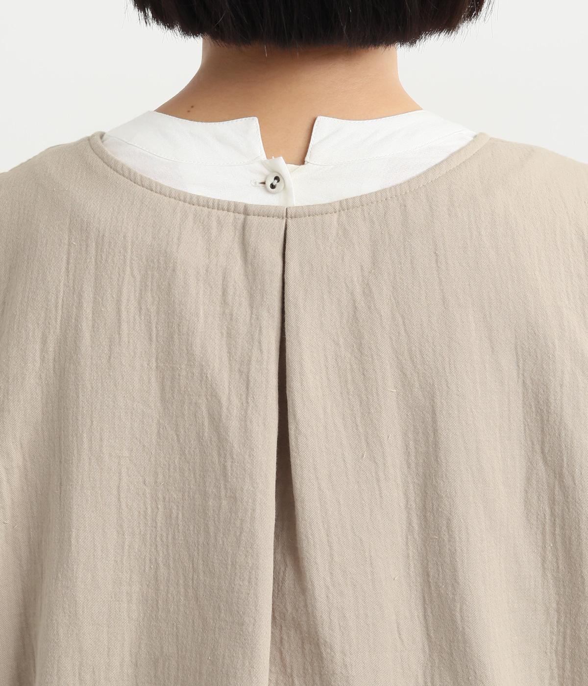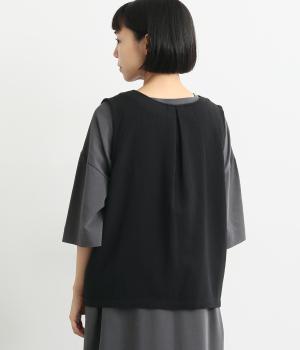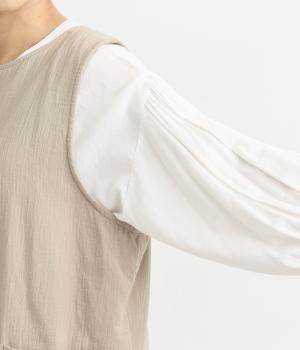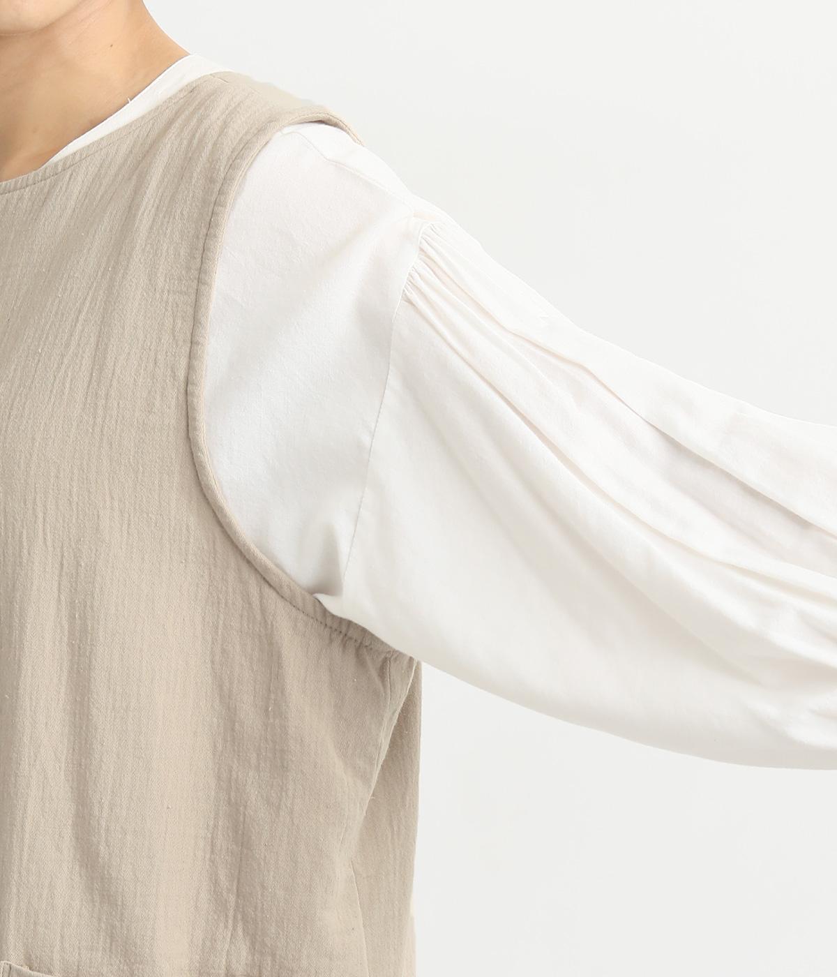 人気のベストの型を使用し、インナーとあわせやすいゆったりとしたシルエットが重宝するアイテムです。ナチュラルな風合いで、カジュアルにもきれいめにも楽しめます。背中のタックもさりげないアクセントです。
