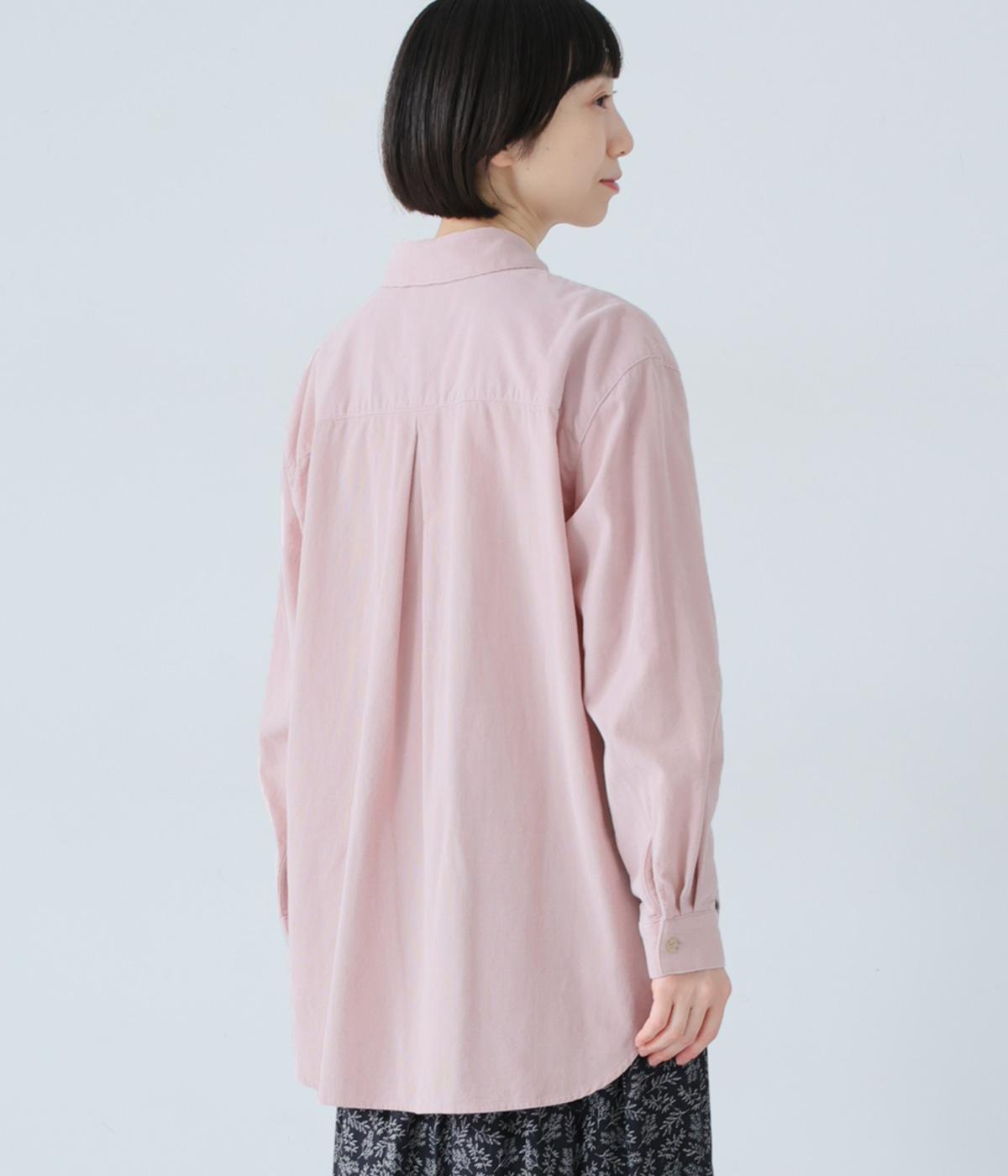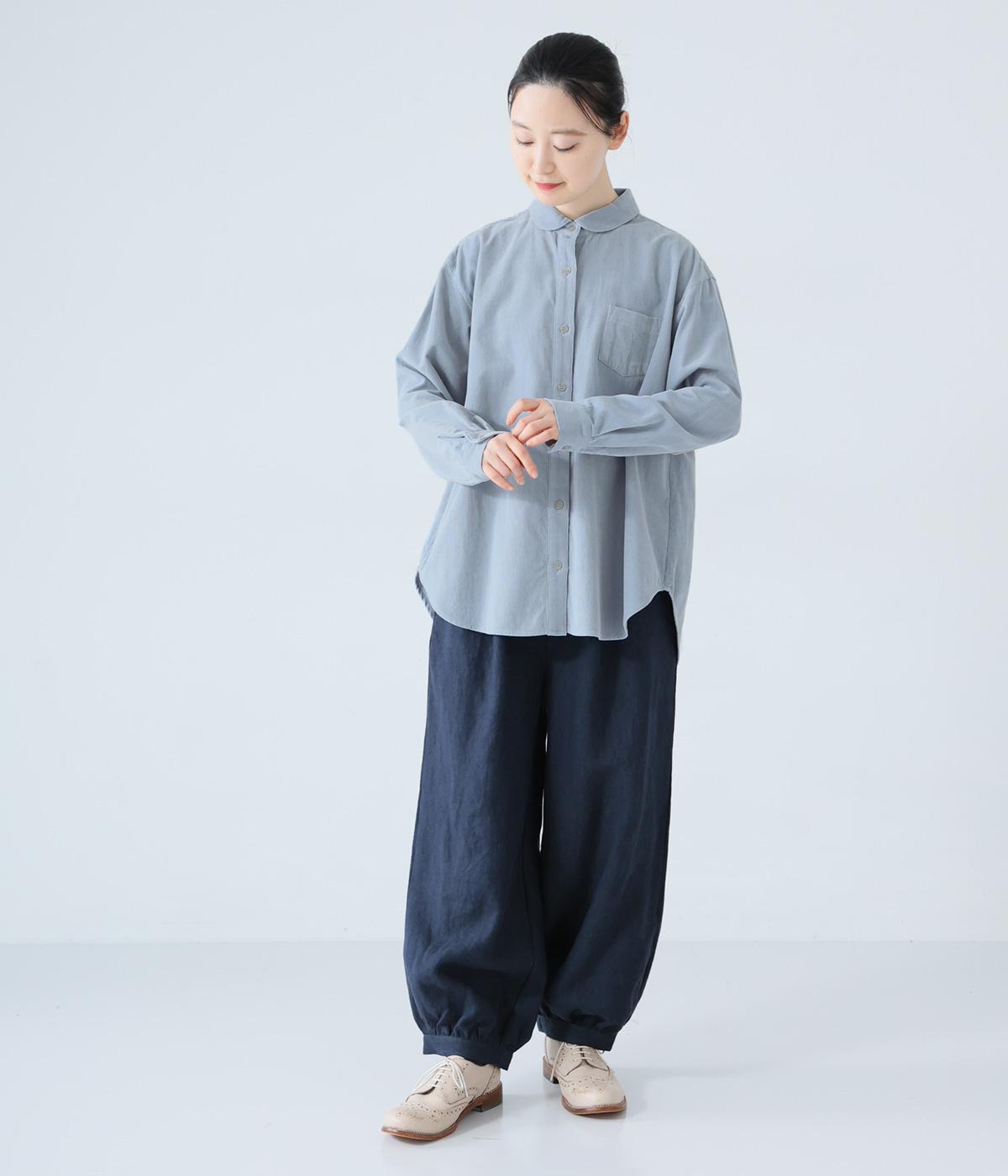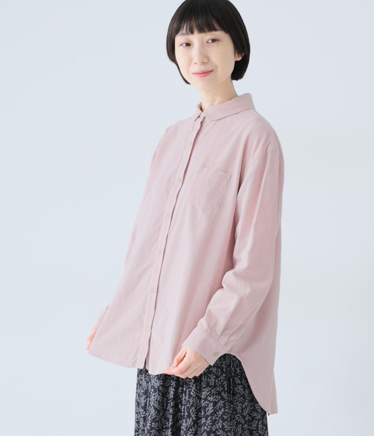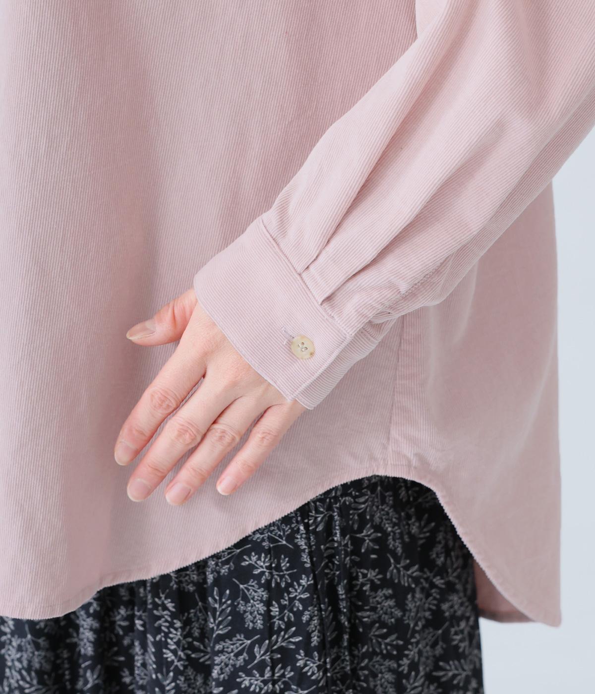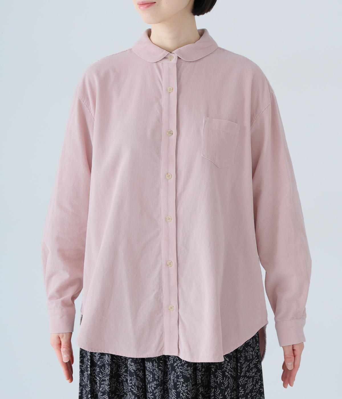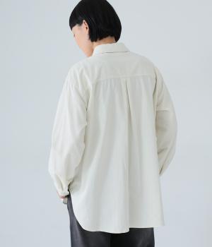 小さな丸襟が愛らしいコーデュロイシャツ。後ろヨーク下と袖口にタックを入れ、全体にゆとりを持たせています。長めの着丈をすっきりと見せるラウンドヘムがポイント。合わせるボトムス次第でガラリと表情が変わる、着まわし力の高いアイテムです。