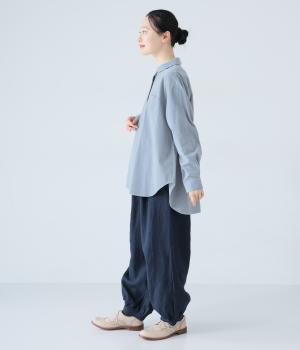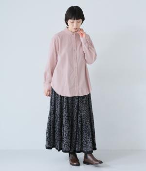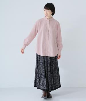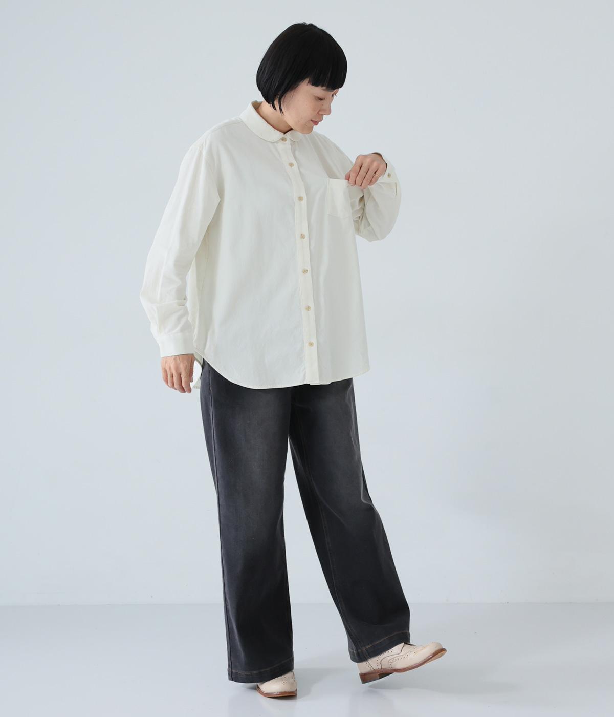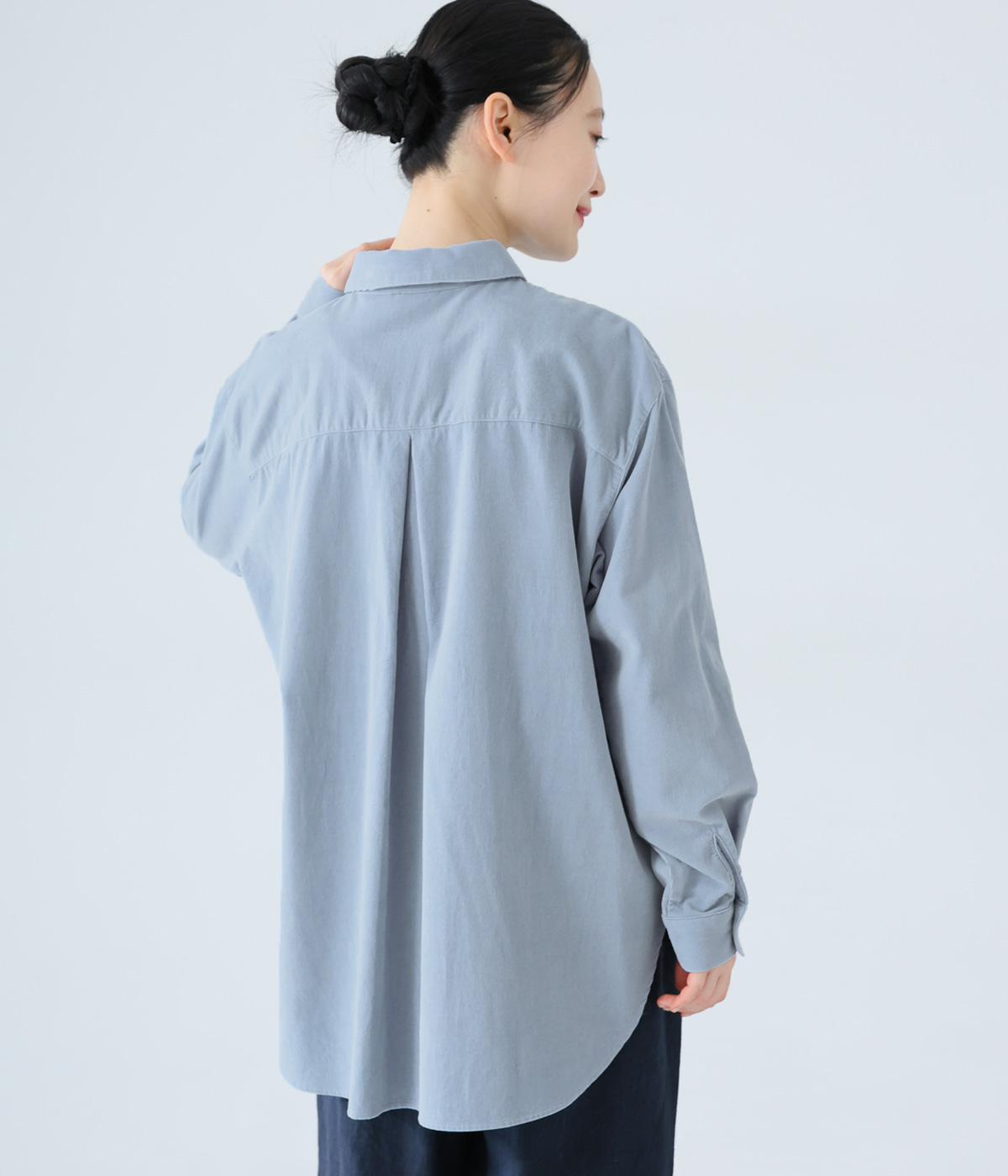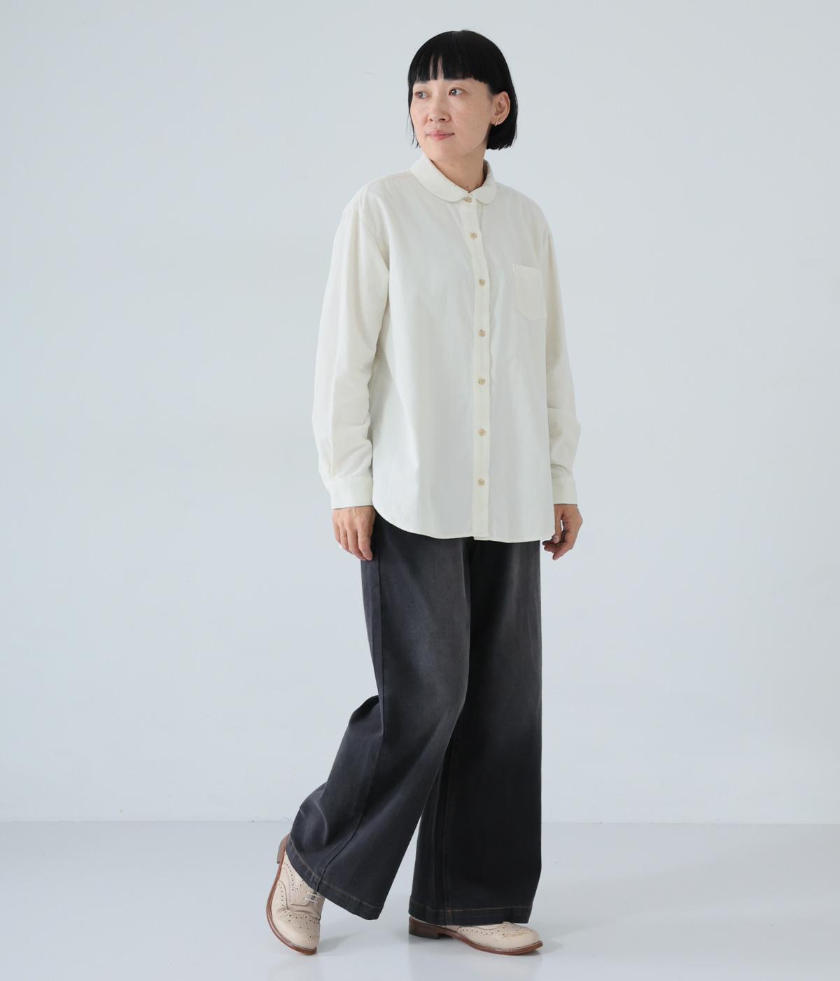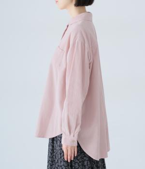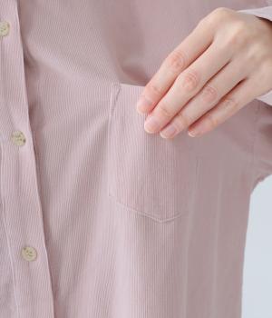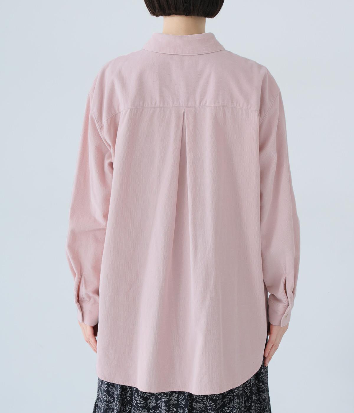 小さな丸襟が愛らしいコーデュロイシャツ。後ろヨーク下と袖口にタックを入れ、全体にゆとりを持たせています。長めの着丈をすっきりと見せるラウンドヘムがポイント。合わせるボトムス次第でガラリと表情が変わる、着まわし力の高いアイテムです。