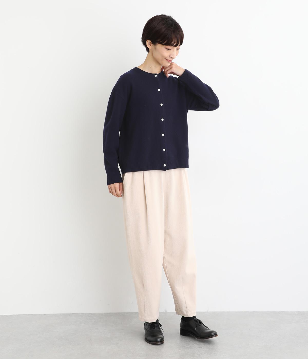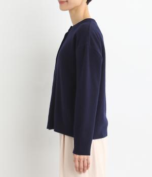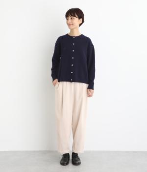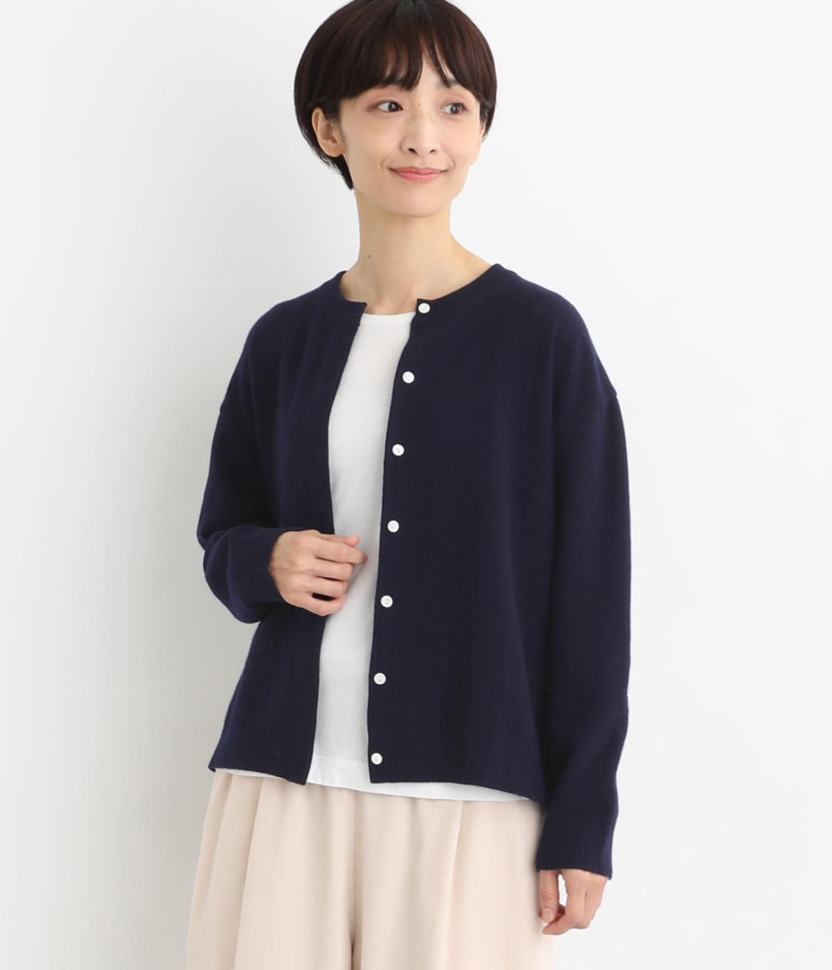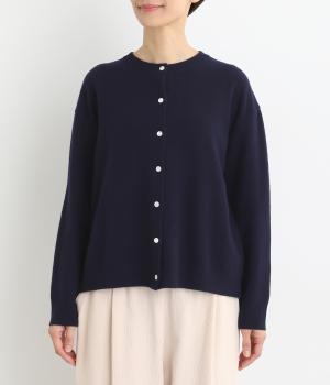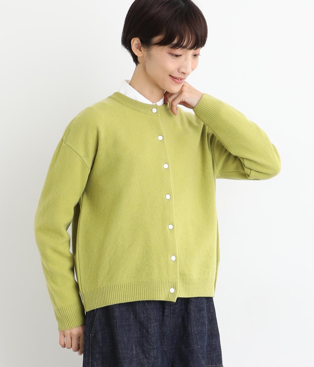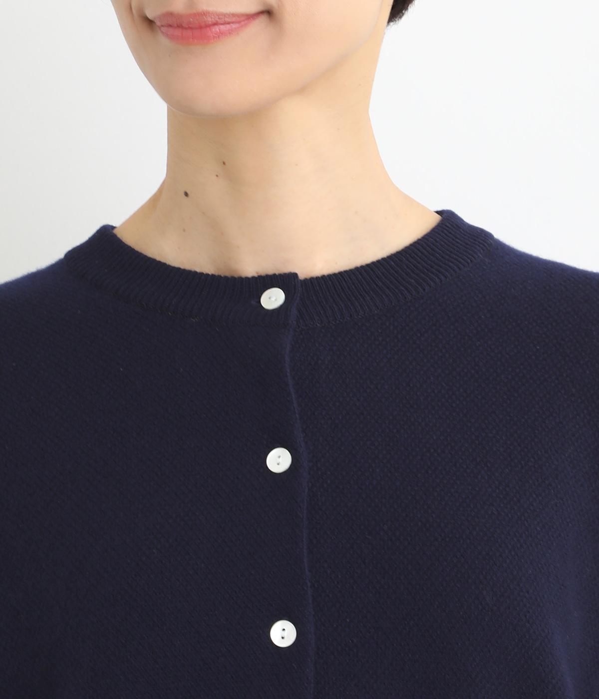 生地表面に細やかな凹凸のある鹿の子編みの丸首カーディガン。ベーシックな見た目ながらも、素材や生地に作り手のこだわりが詰まった贅沢な一枚です。丸首なので、シャツとも相性がよく、レイヤードスタイルが作りやすいのも魅力。