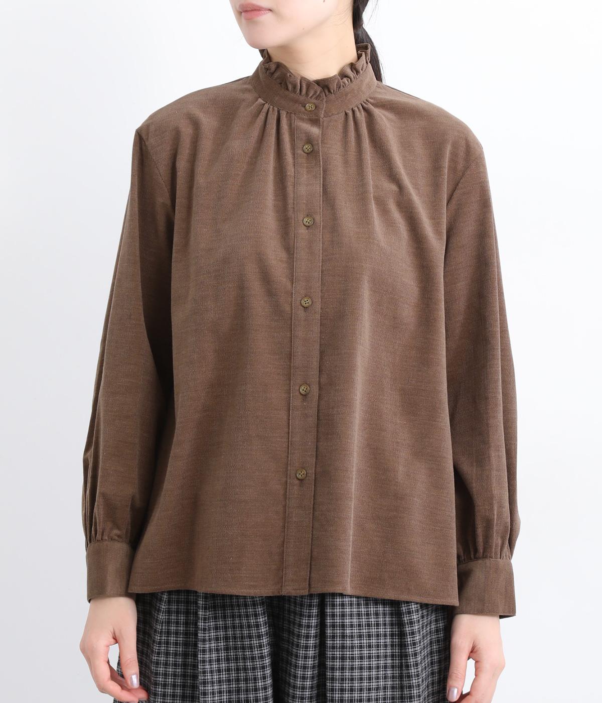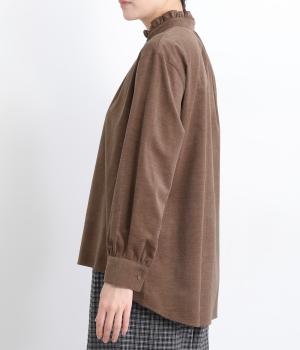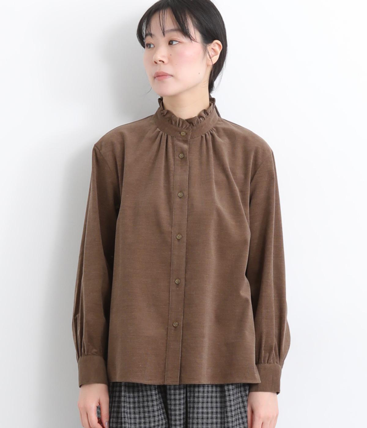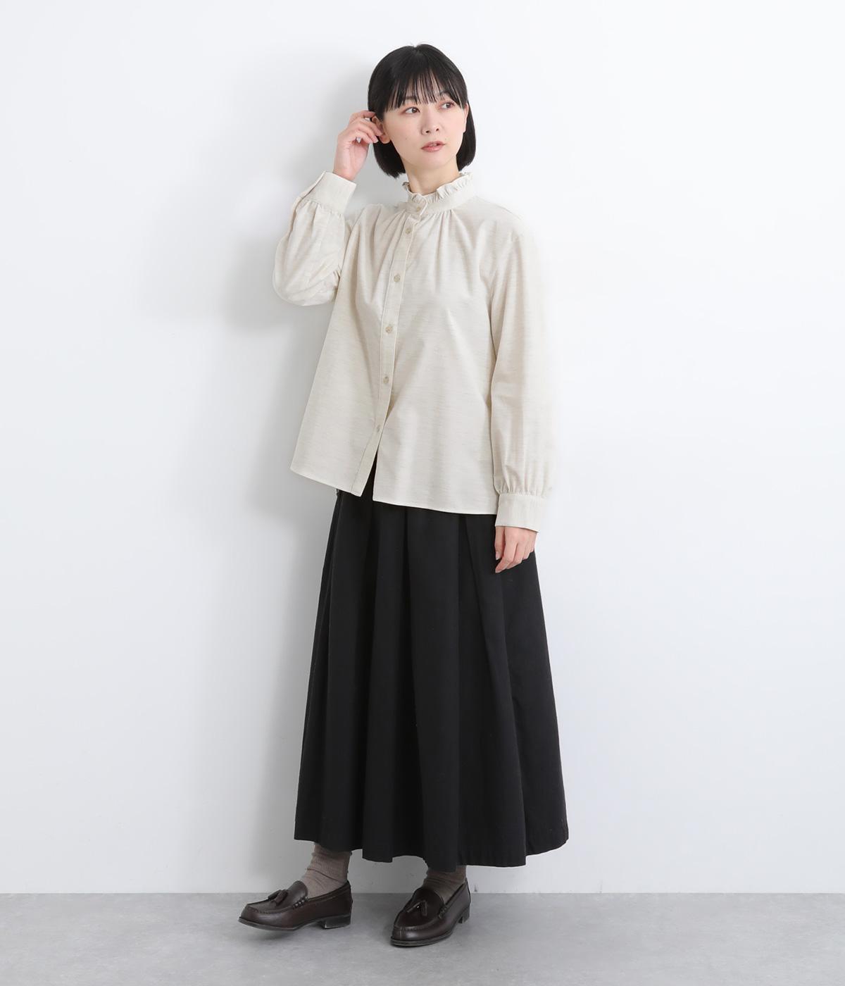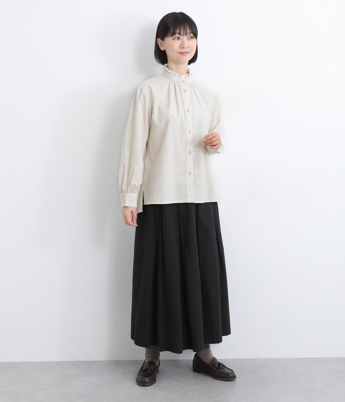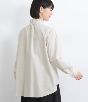 くしゅっと寄せたフリルネックが、やわらかな表情を添えるブラウスです。襟の後ろや袖口にもギャザーをあしらい、ふんわりとした立体感を生み出しています。ほどよくゆとりのあるシルエットで、着心地は軽やか。ベストやカーディガンのインにも映える、上品な一枚です。