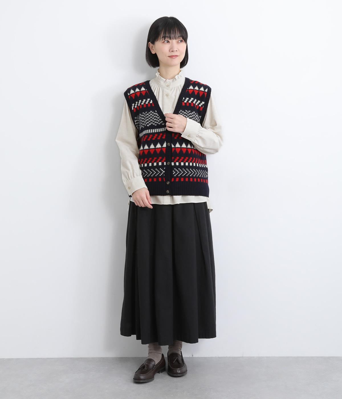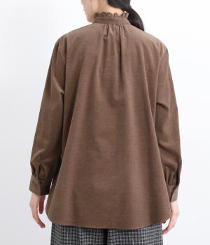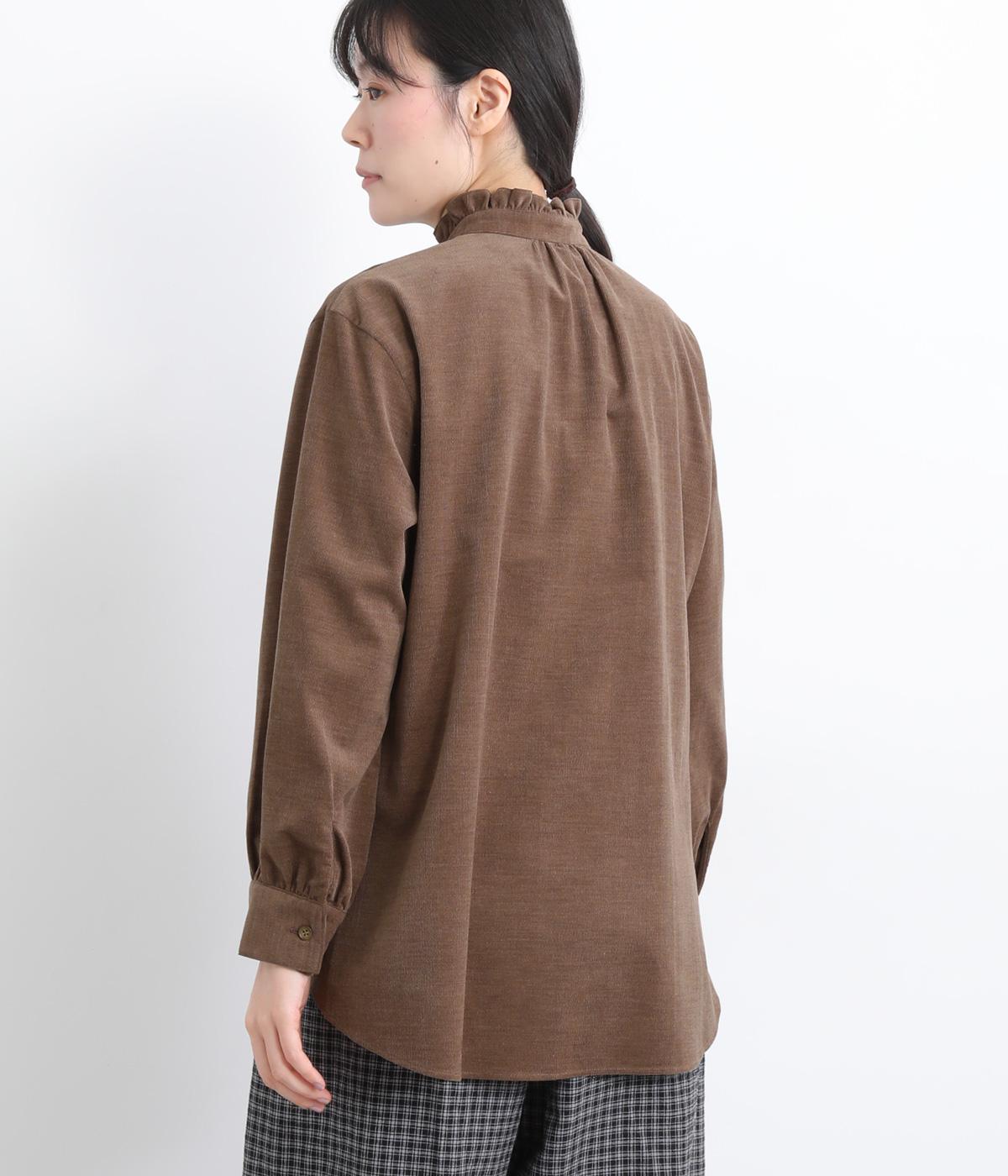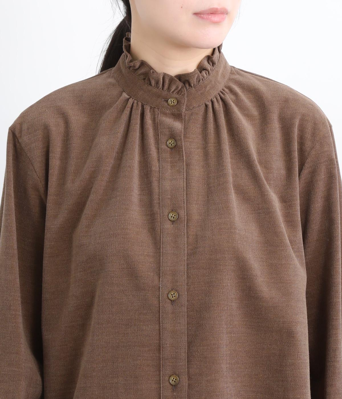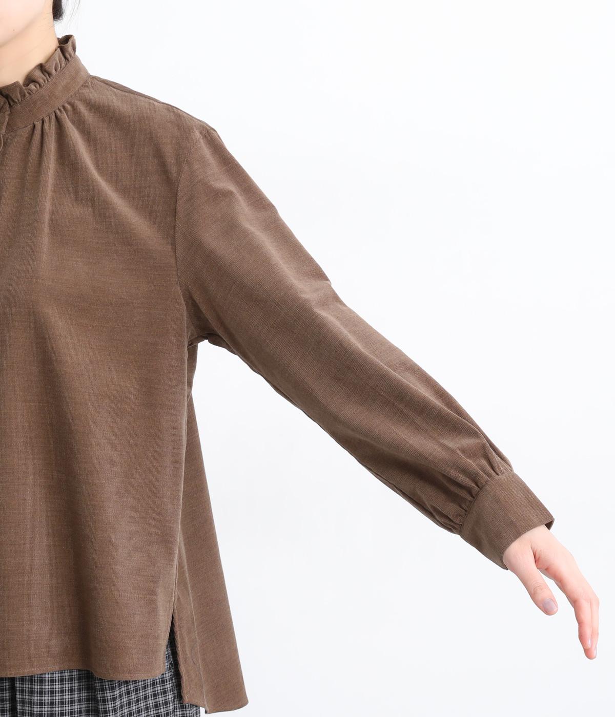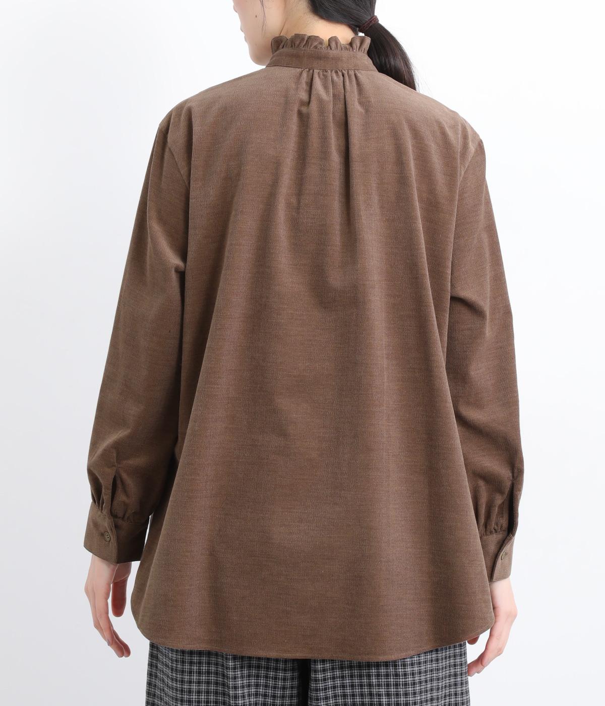 くしゅっと寄せたフリルネックが、やわらかな表情を添えるブラウスです。襟の後ろや袖口にもギャザーをあしらい、ふんわりとした立体感を生み出しています。ほどよくゆとりのあるシルエットで、着心地は軽やか。ベストやカーディガンのインにも映える、上品な一枚です。