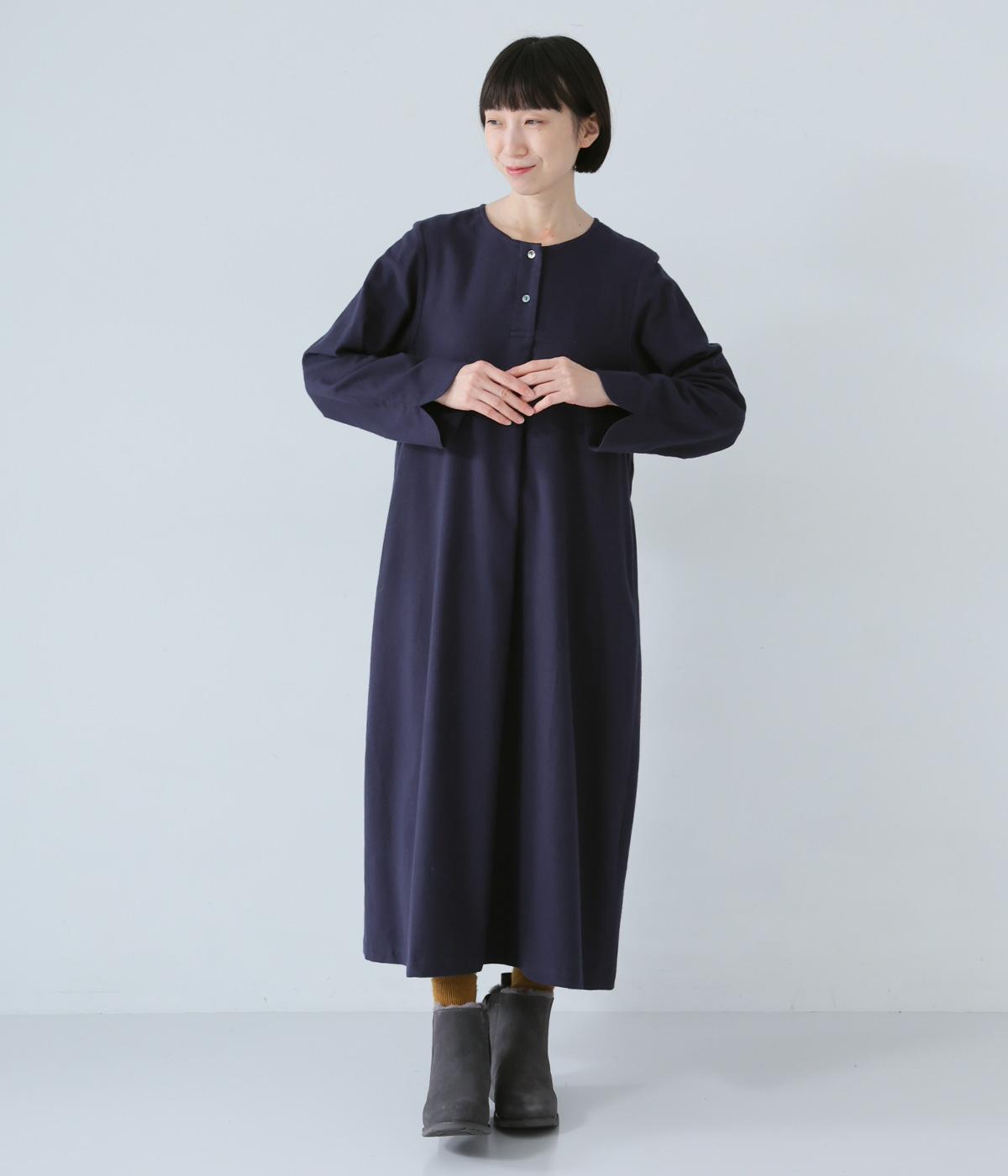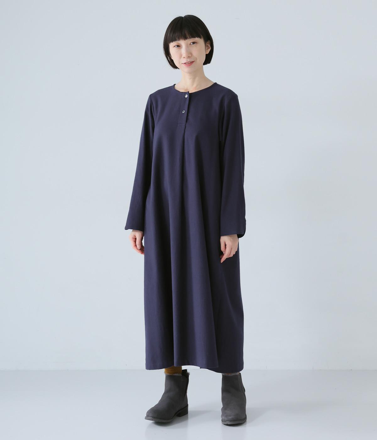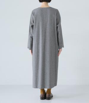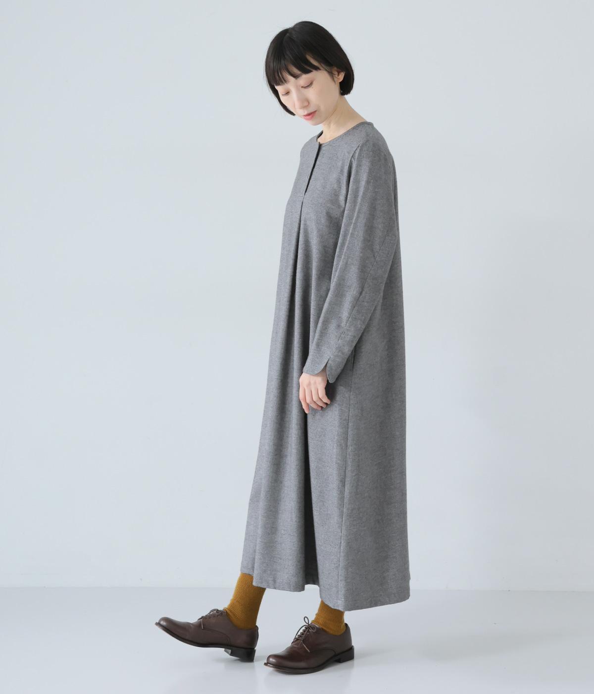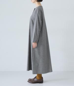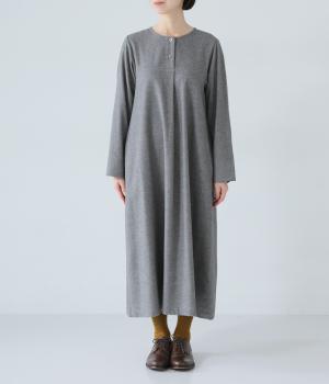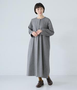 ヘンリーネックの下にタックを入れて、ふんわりとした適度なゆとりを持たせたワンピース。ラウンドした袖口が、女性らしいやさしいムードを添えます。合わせる小物選びなどスタイリングがたのしくなる、シンプルさが魅力の一枚です。