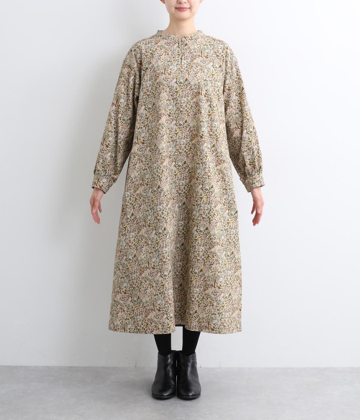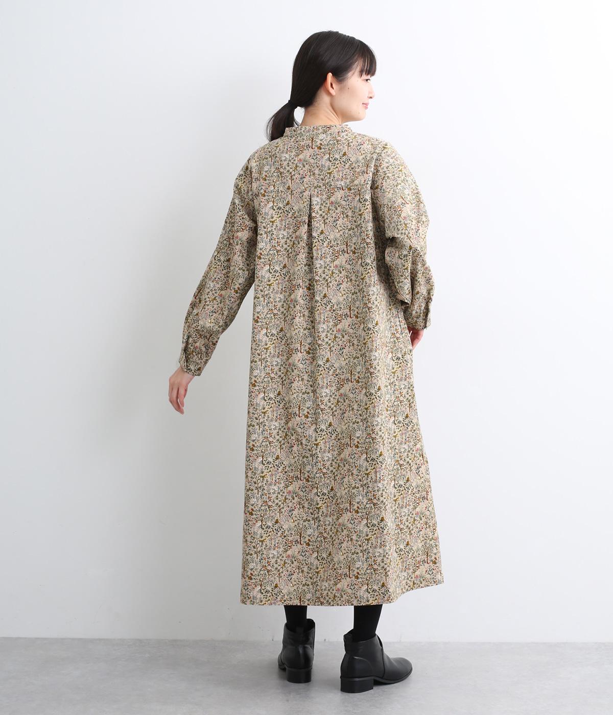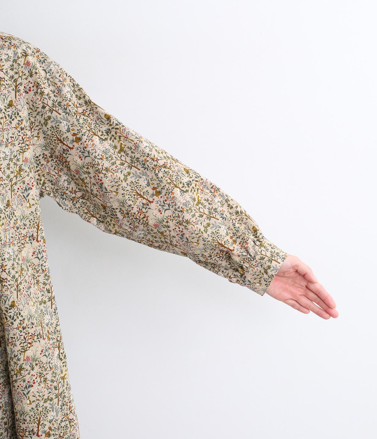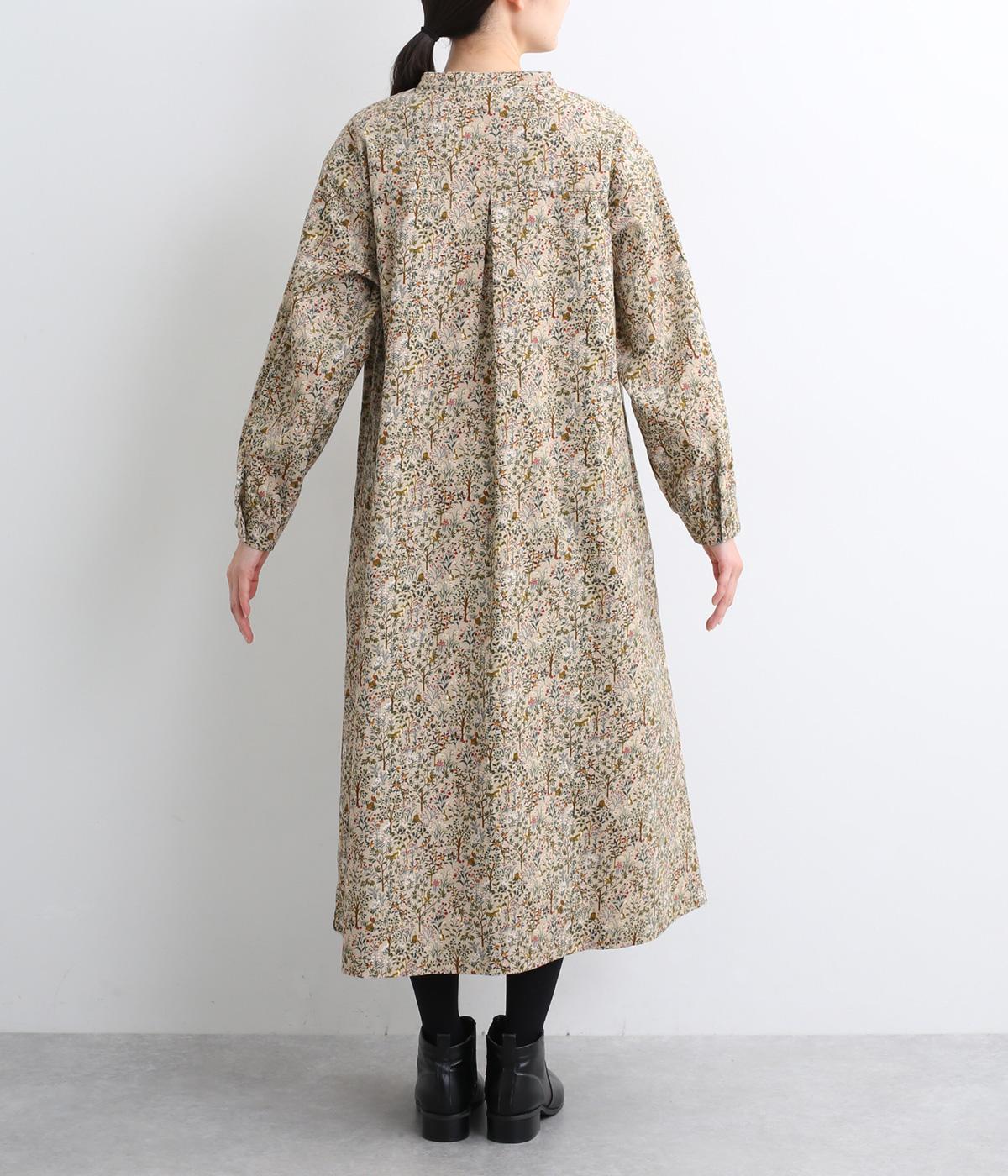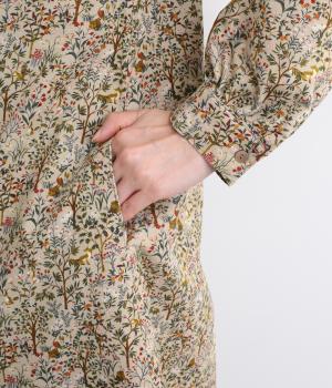 ナチュラルな色みで描くforest柄のワンピース。広がりすぎないAラインシルエット、バンドカラーですっきりと仕立てました。袖口にギャザーを入れ、女性らしさをプラス。襟もとの2つボタンもアクセントです。