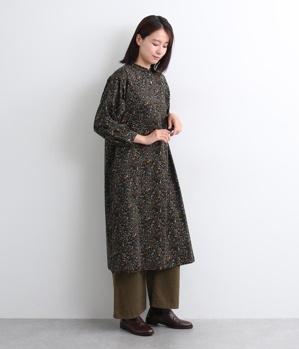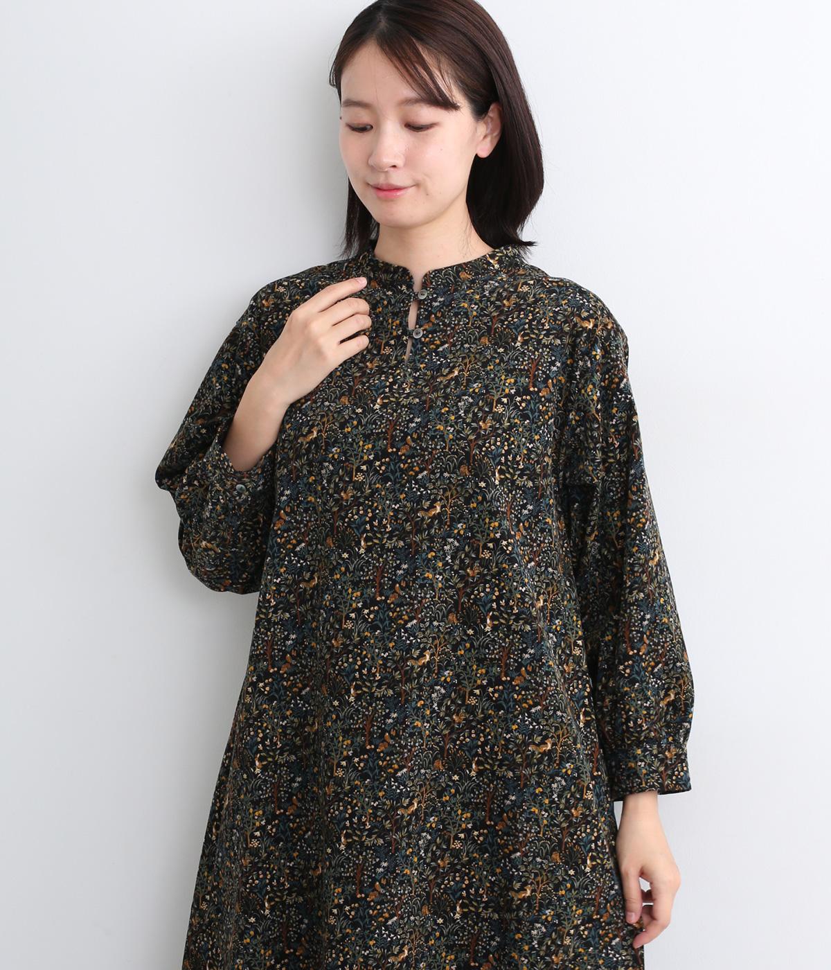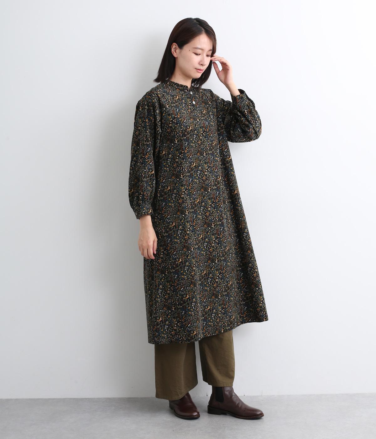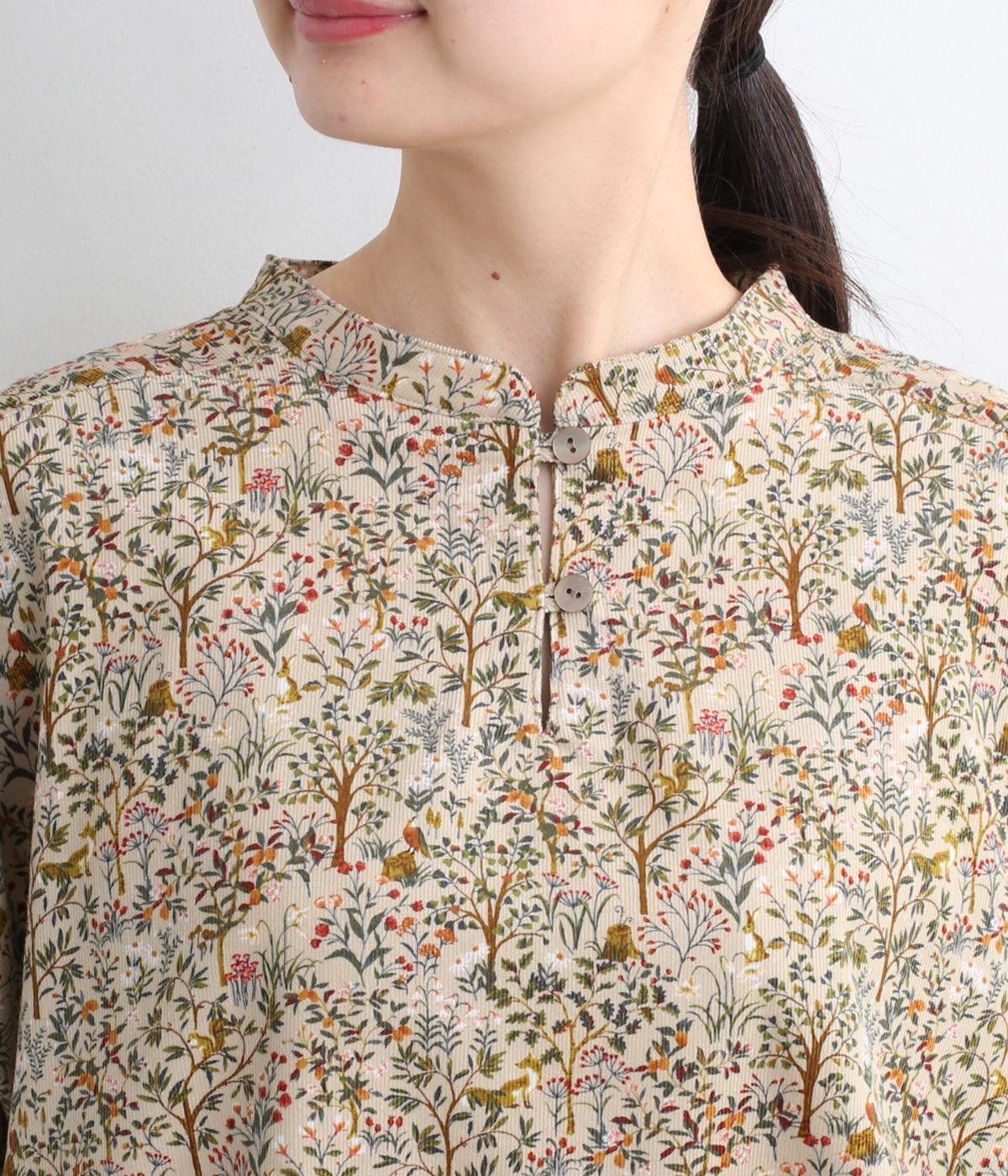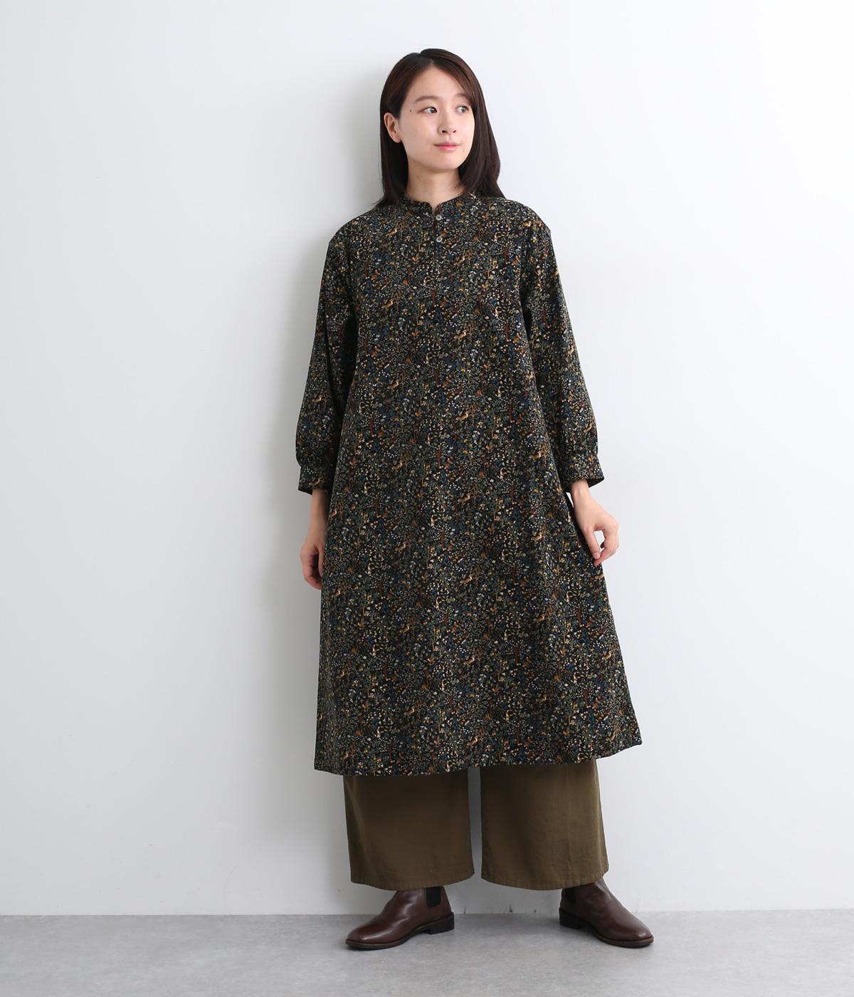 ナチュラルな色みで描くforest柄のワンピース。広がりすぎないAラインシルエット、バンドカラーですっきりと仕立てました。袖口にギャザーを入れ、女性らしさをプラス。襟もとの2つボタンもアクセントです。