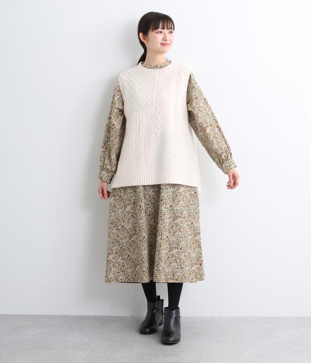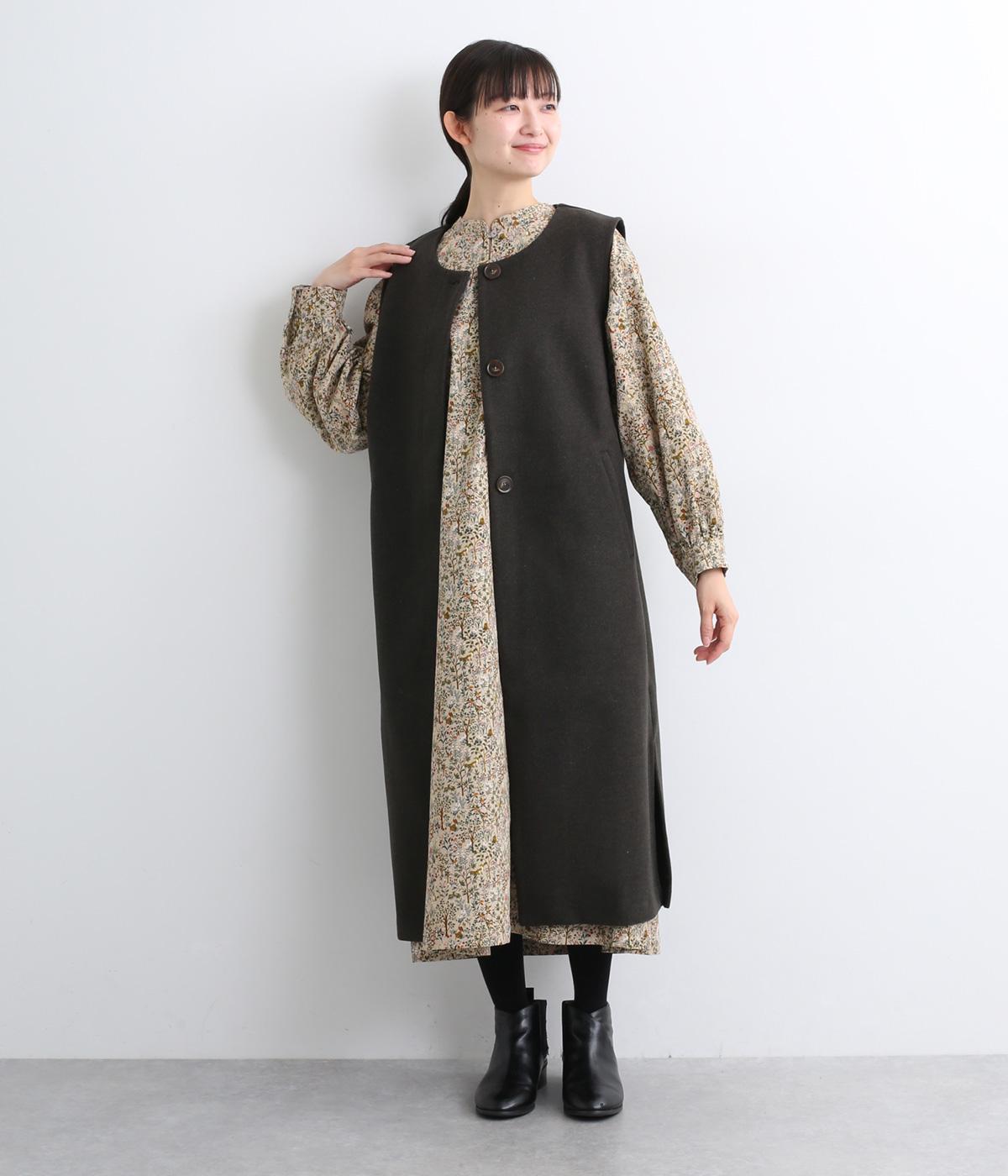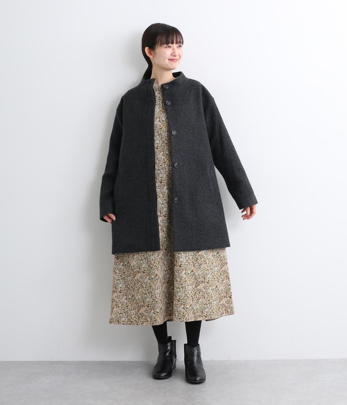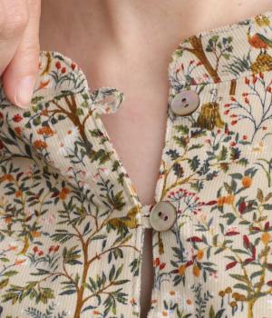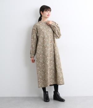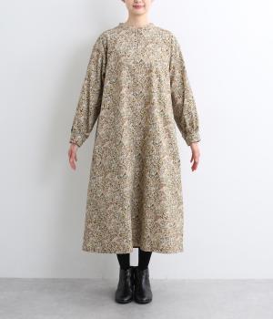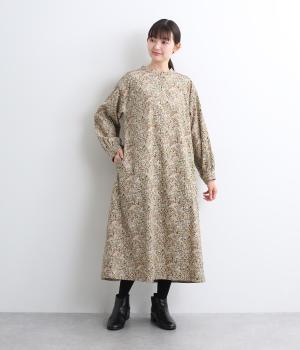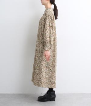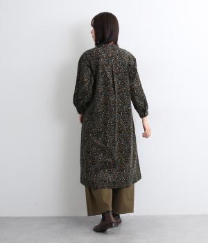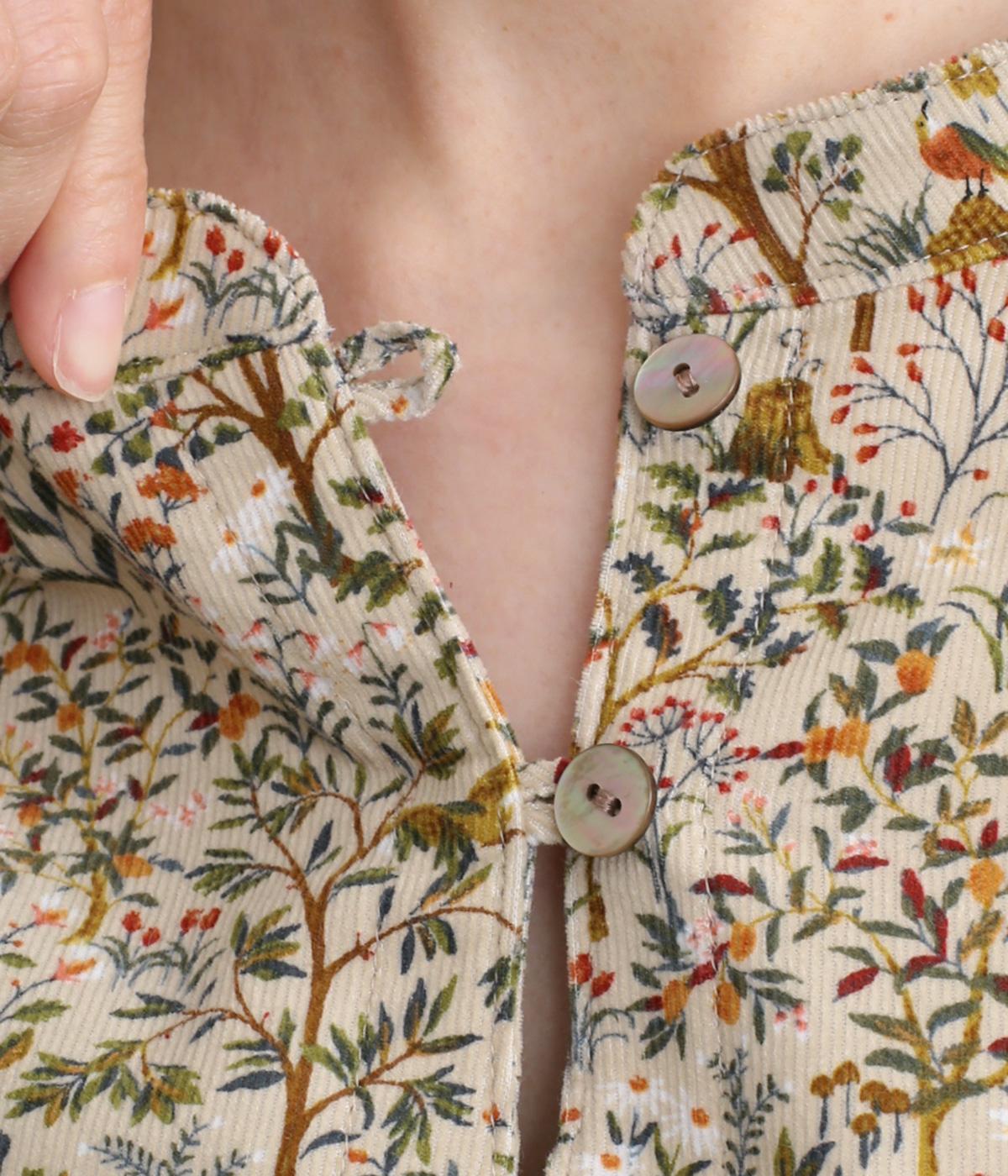 ナチュラルな色みで描くforest柄のワンピース。広がりすぎないAラインシルエット、バンドカラーですっきりと仕立てました。袖口にギャザーを入れ、女性らしさをプラス。襟もとの2つボタンもアクセントです。